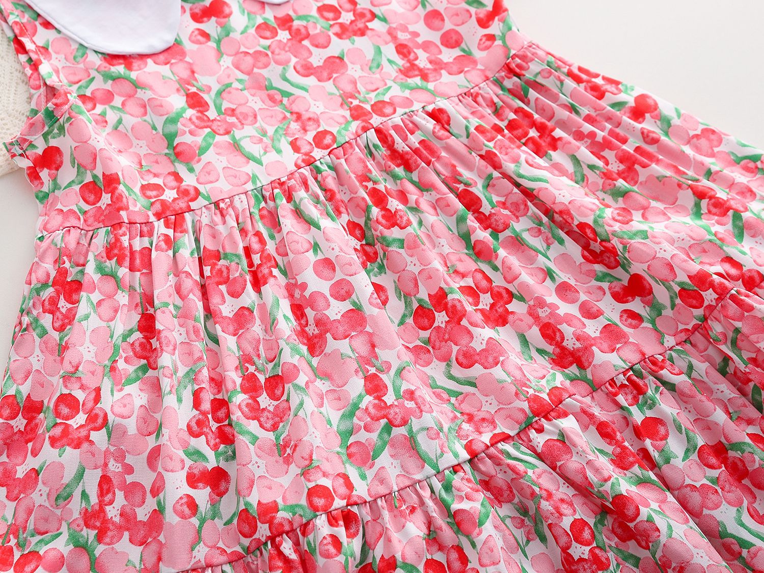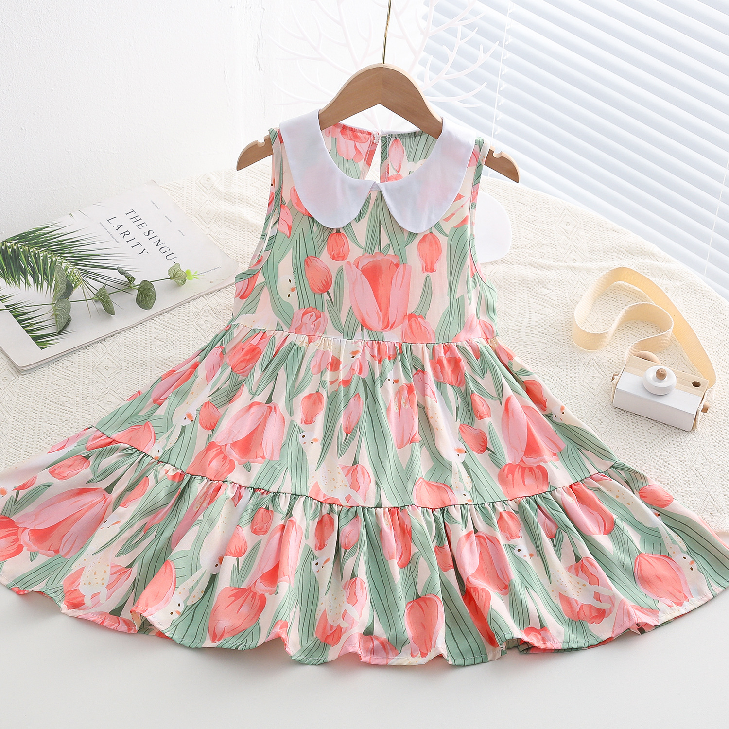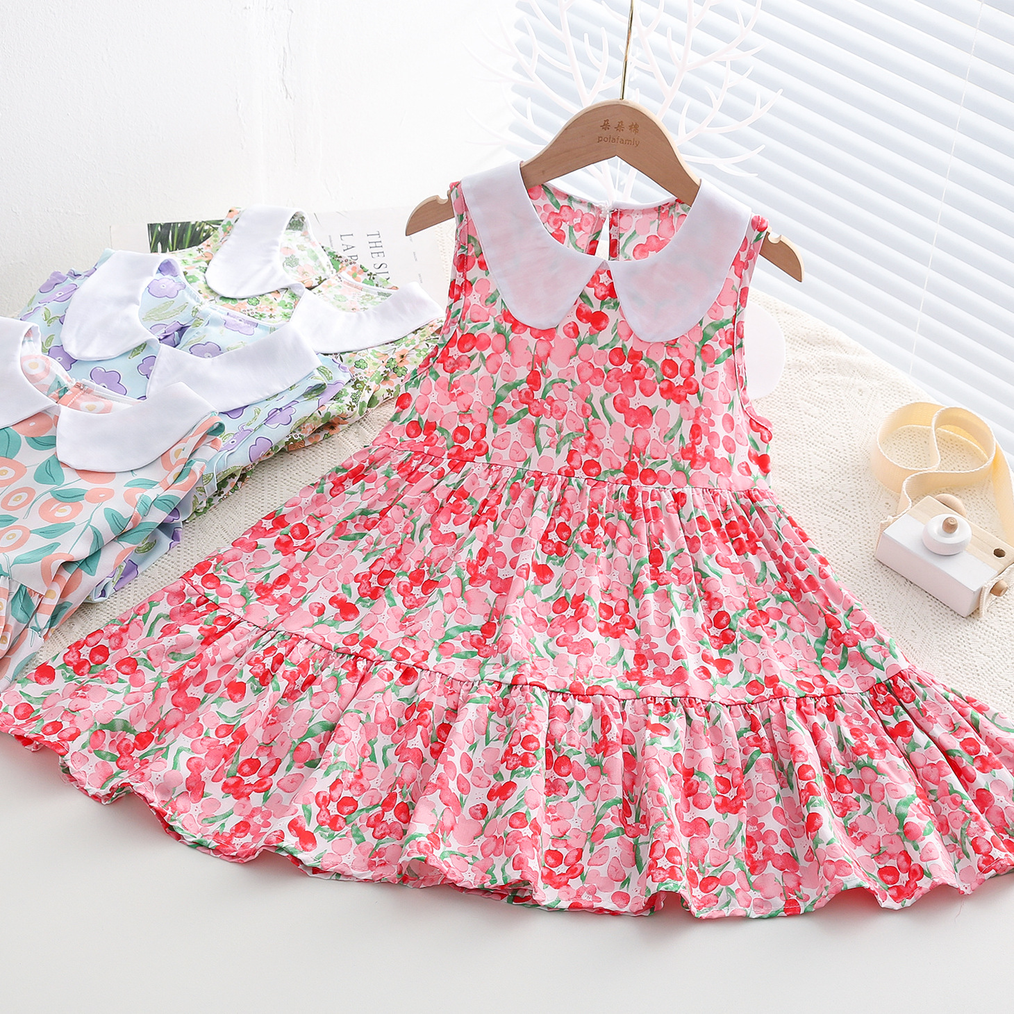 상쾌한 부드러운 찹스러운 소녀 옷깃면 실크 원피스 여름 얇은 미디어와 큰 어린이 꽃 무늬 큰 치마 인공 면화 비치 스커트스토어 가기