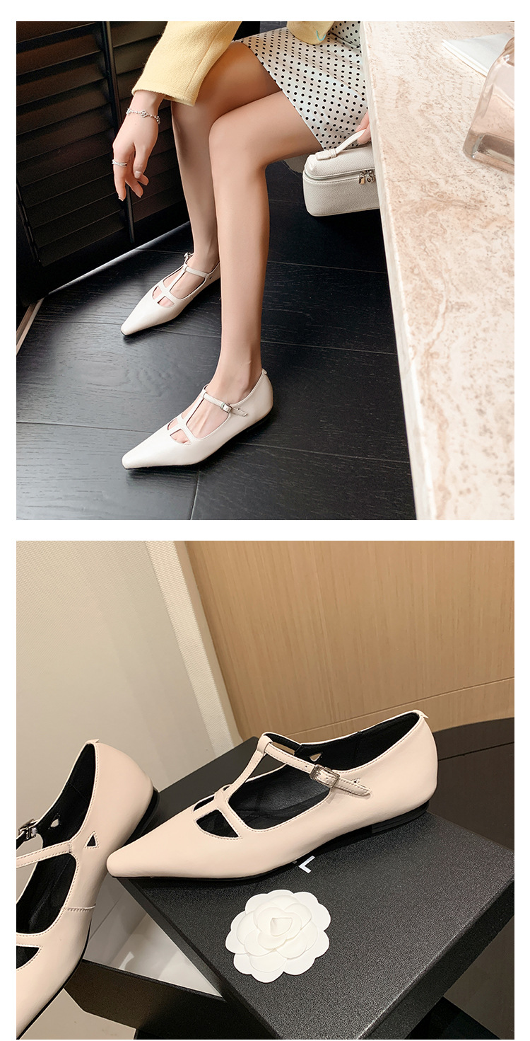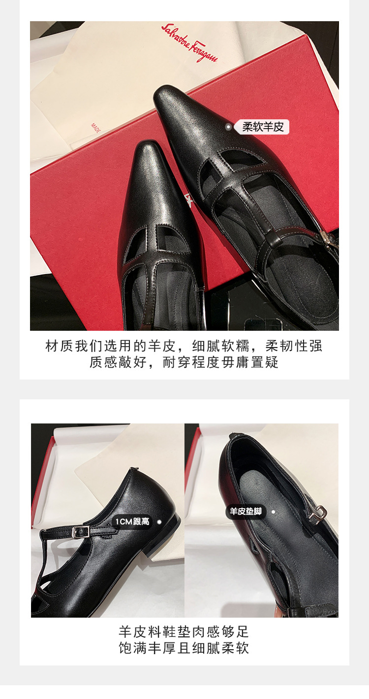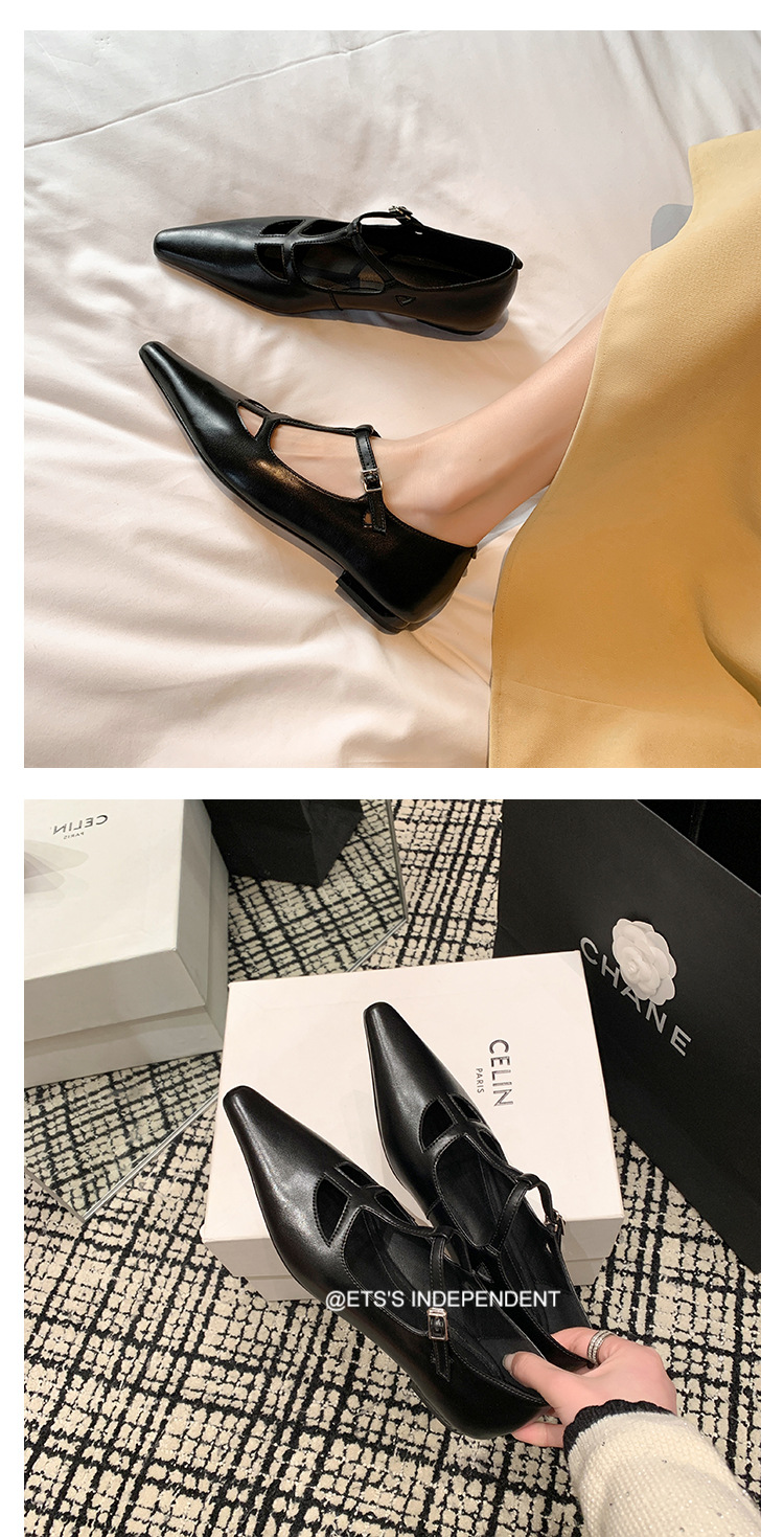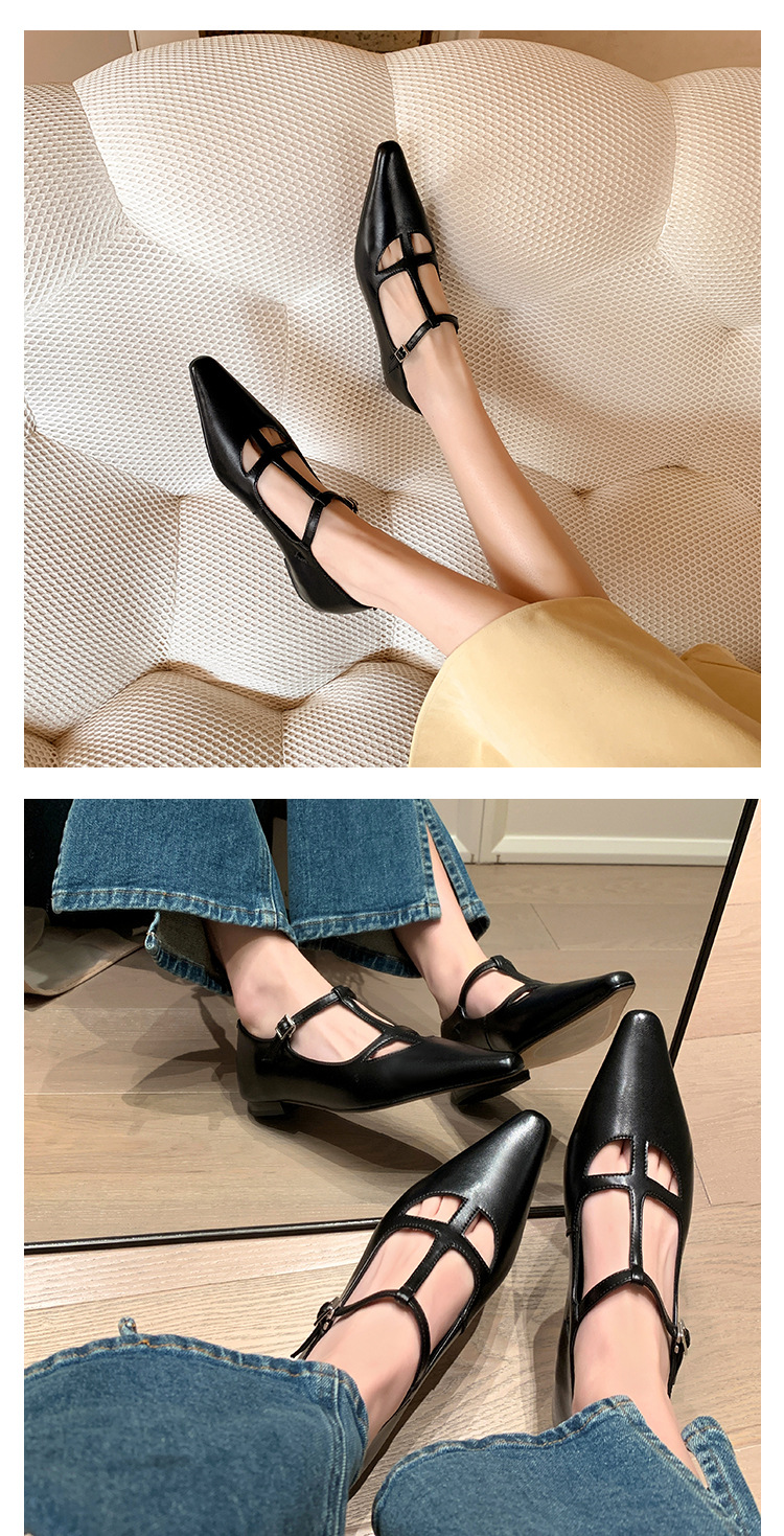 프랑스 우아한 사교계 스타일 T-스트랩 로우 힐 뾰족한 싱글 레이어 신발 2024 봄 새로운 양가죽 올매치 편안한 여성 신발스토어 가기