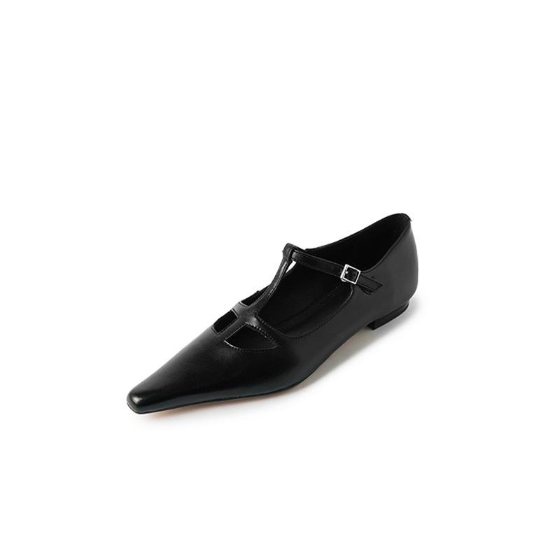 프랑스 우아한 사교계 스타일 T-스트랩 로우 힐 뾰족한 싱글 레이어 신발 2024 봄 새로운 양가죽 올매치 편안한 여성 신발