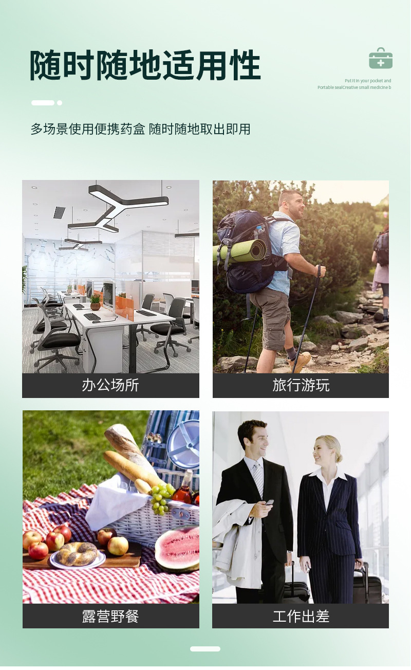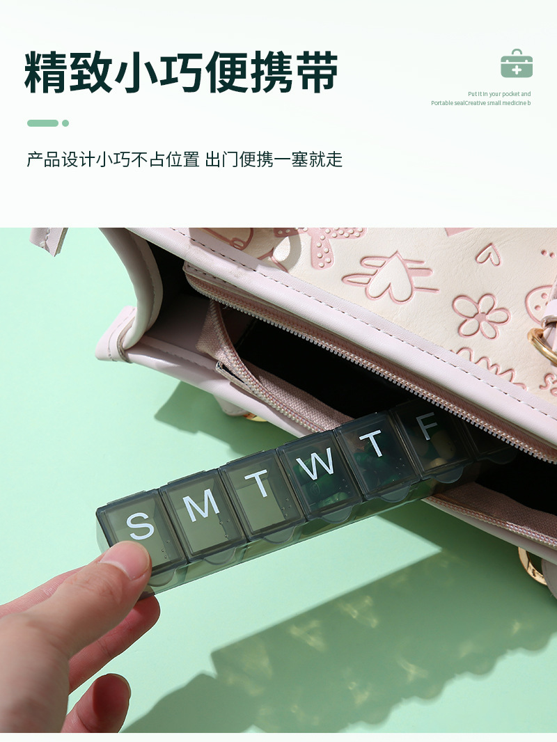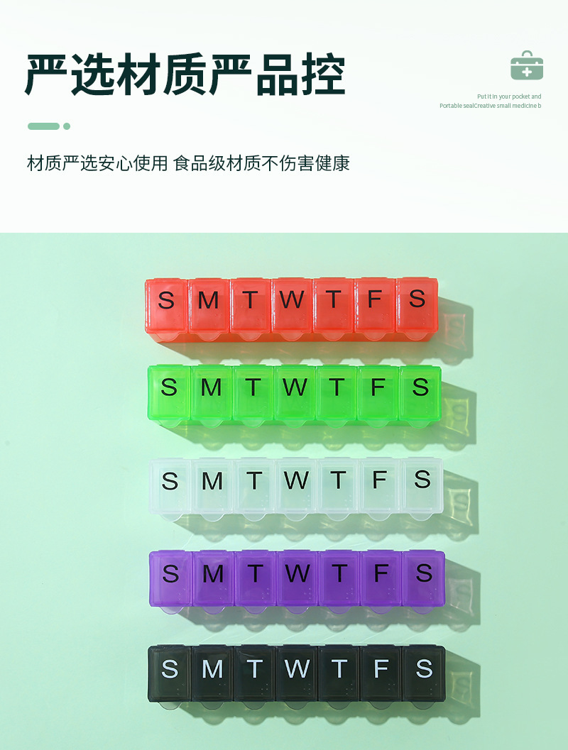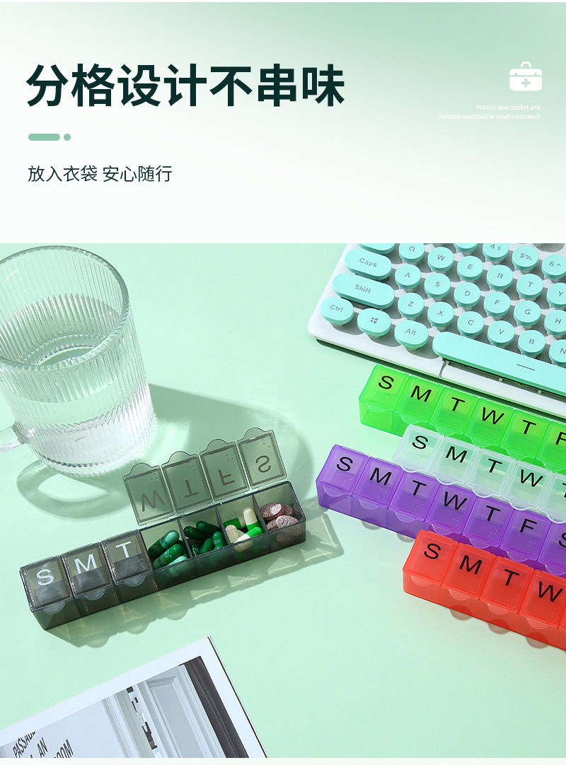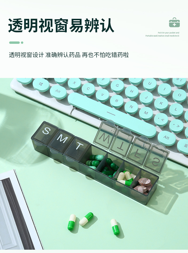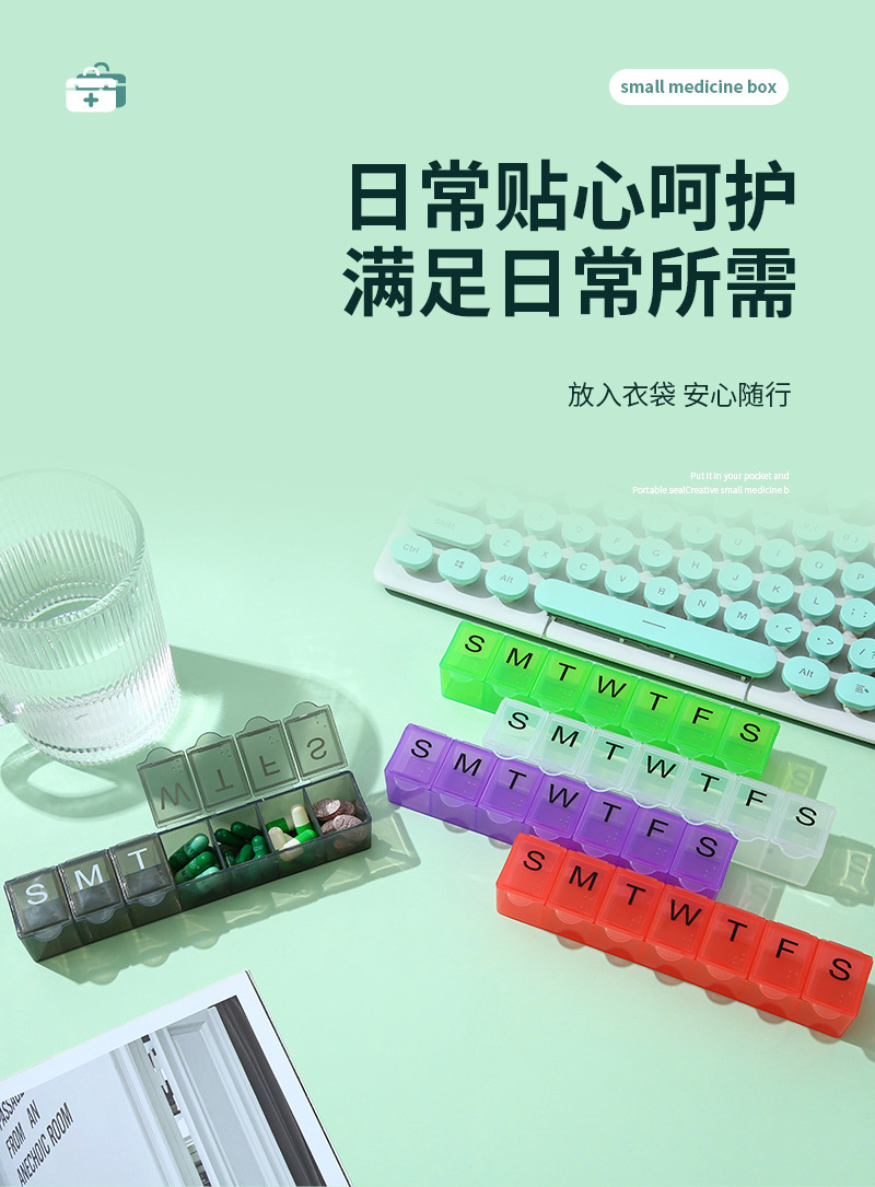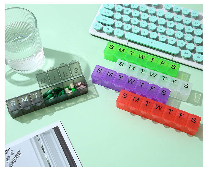 7 그리드 알약 상자 휴대용 별도의 저장 상자 일주일에 7 일 긴 점자 작은 알약 상자 인쇄 가능한 로고스토어 가기