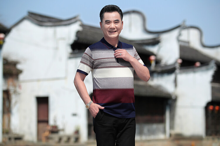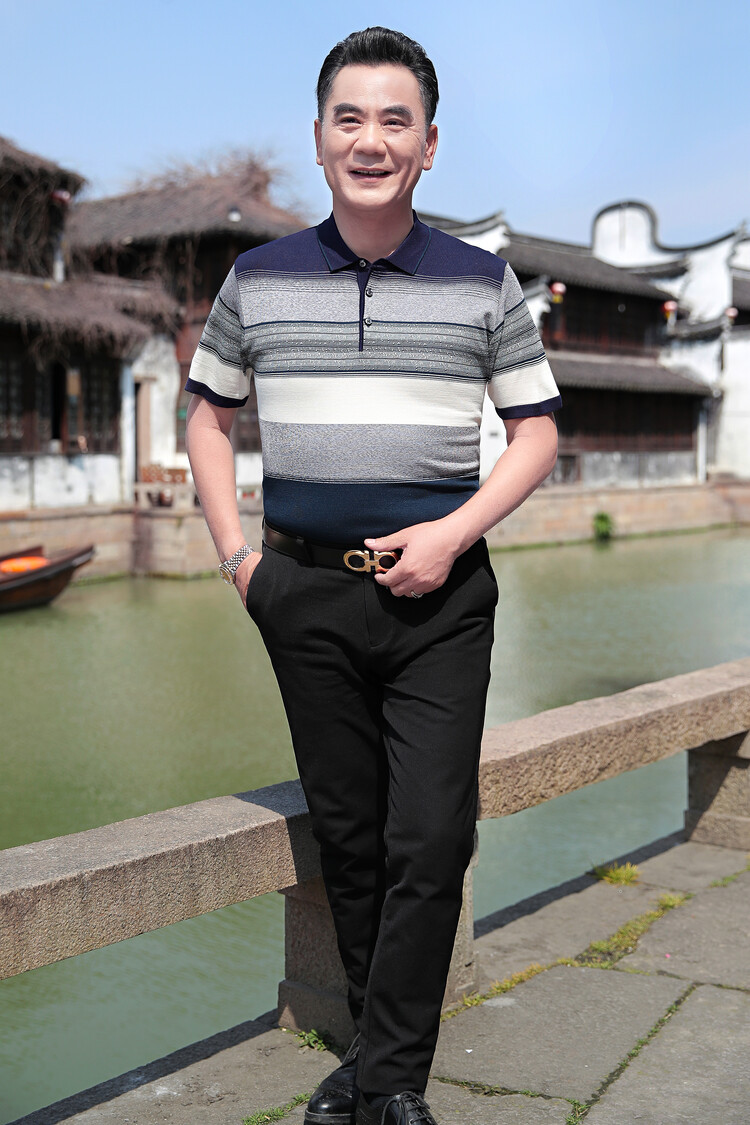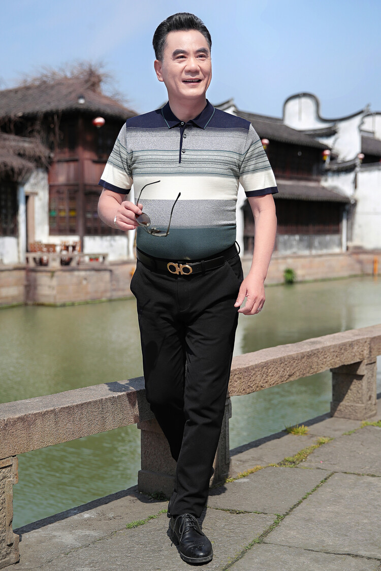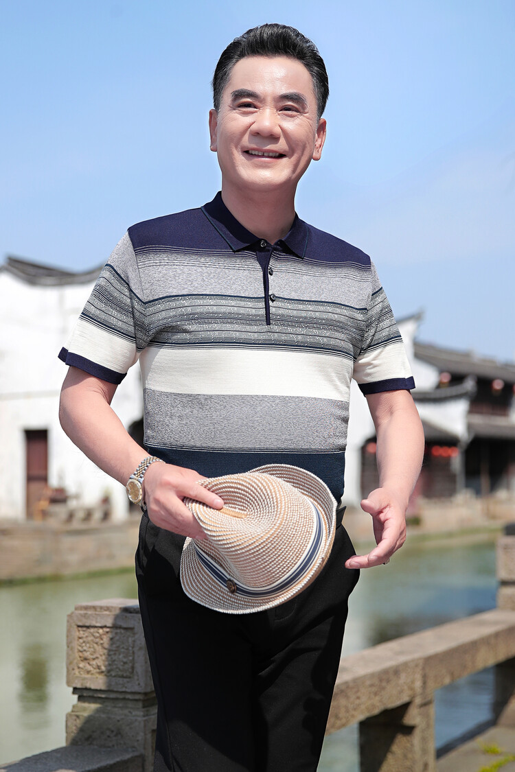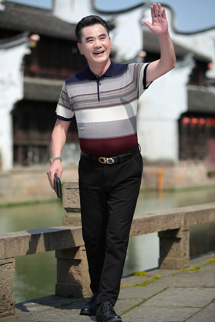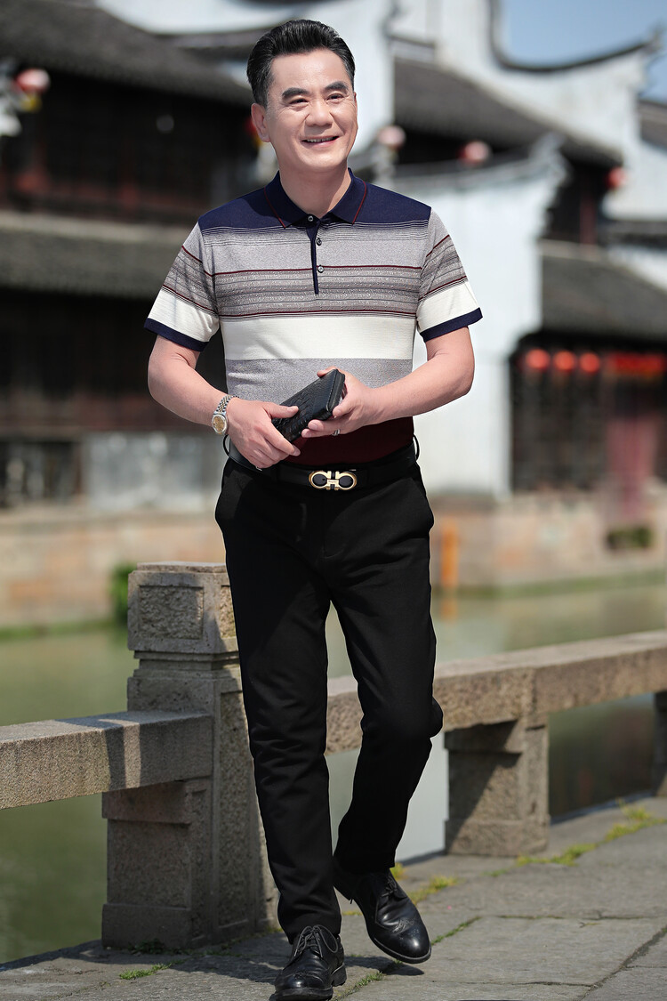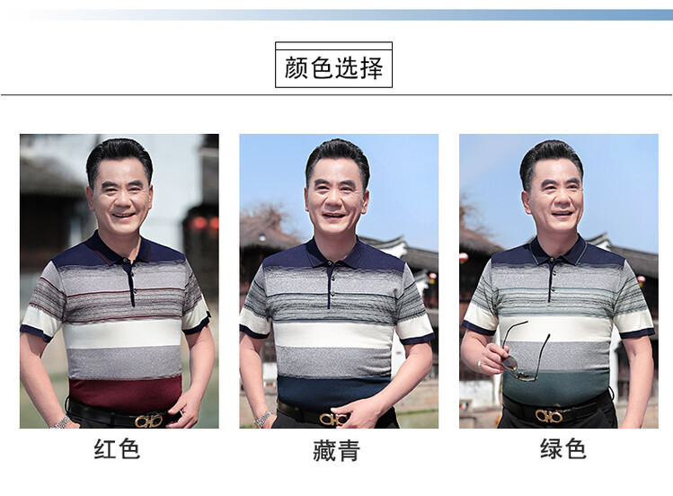 여름 2024 아빠 빨간 반팔 티셔츠 남자 아이스 실크 중년 및 노인 줄무늬 옷깃 탑 결혼식 원피스 할아버지스토어 가기