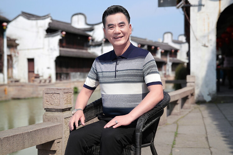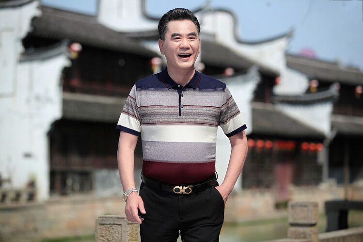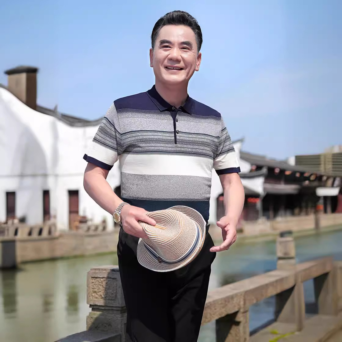 여름 2024 아빠 빨간 반팔 티셔츠 남자 아이스 실크 중년 및 노인 줄무늬 옷깃 탑 결혼식 원피스 할아버지