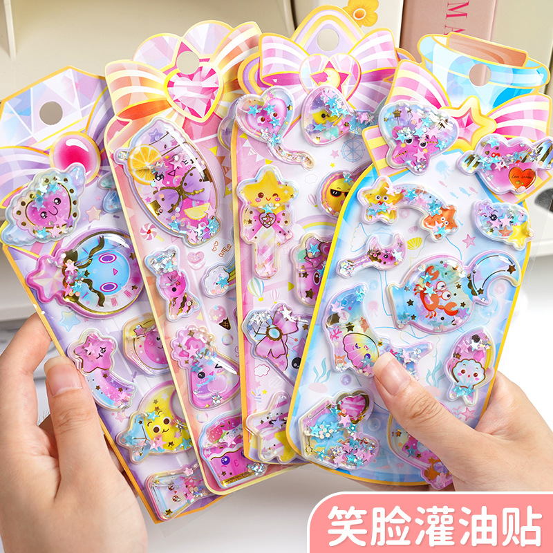 반짝이는 정품 공인 스마일리 페이스 오일 충전 스티커 어린이 만화 3D 입체 흔들기 물 주입 스티커 퀵 샌드스토어 가기