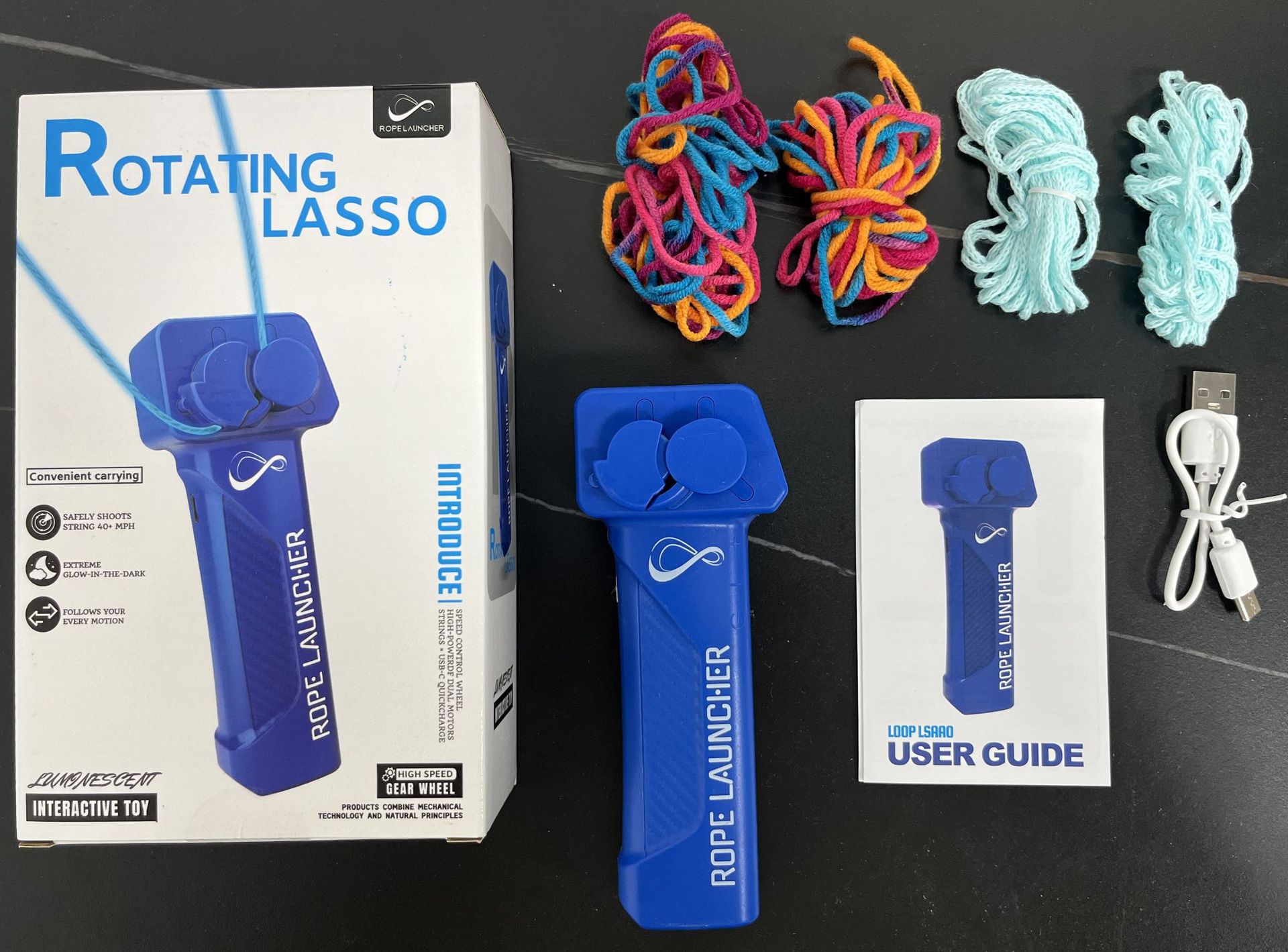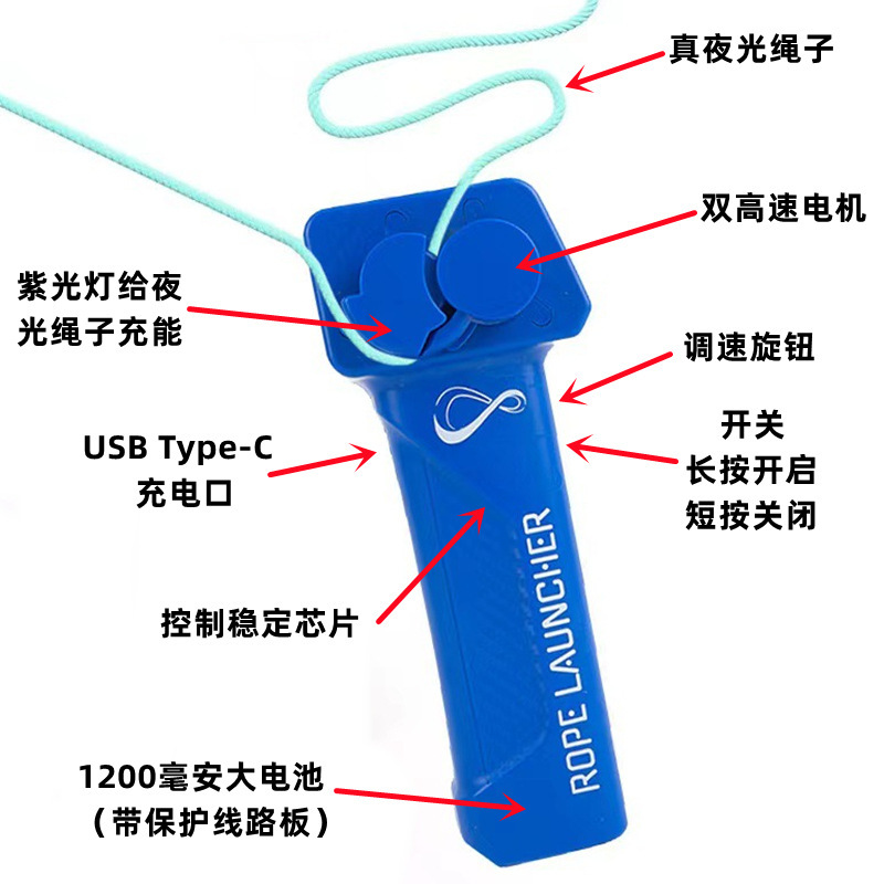 配置:绳子发射器主体(配2条彩色绳子4米+2条夜光绳子3米+充电线+说明书)