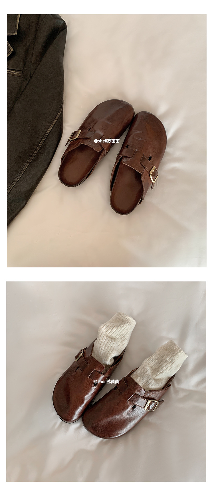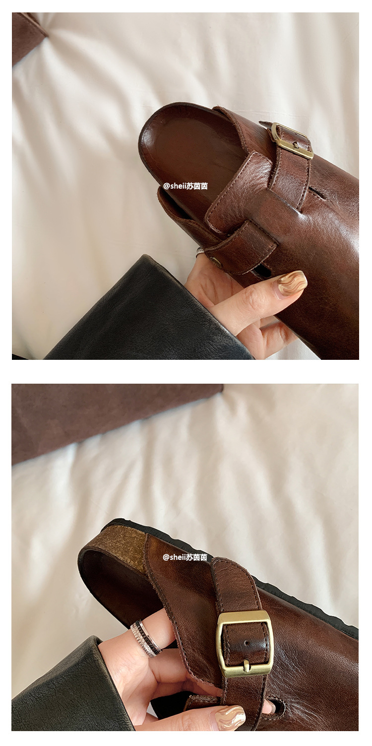 Cowhide 정품 가죽 Maillard 말 가죽 두꺼운 밑창 보잉 신발 하이힐 여성용 뮬러 게으른 슬리퍼