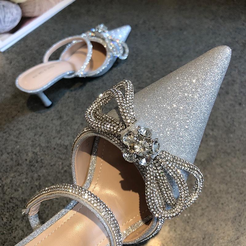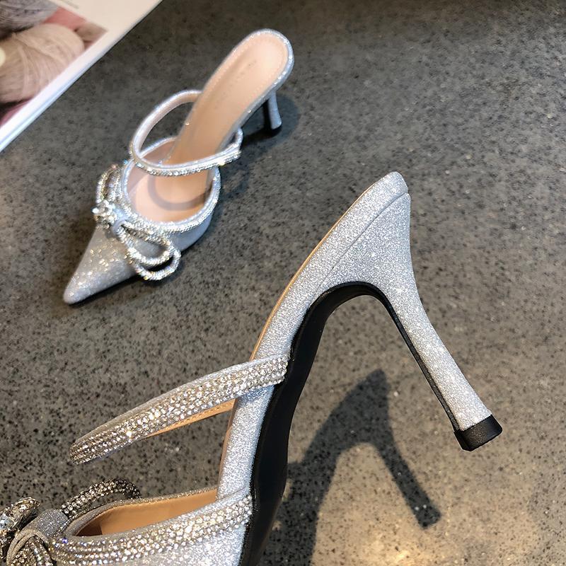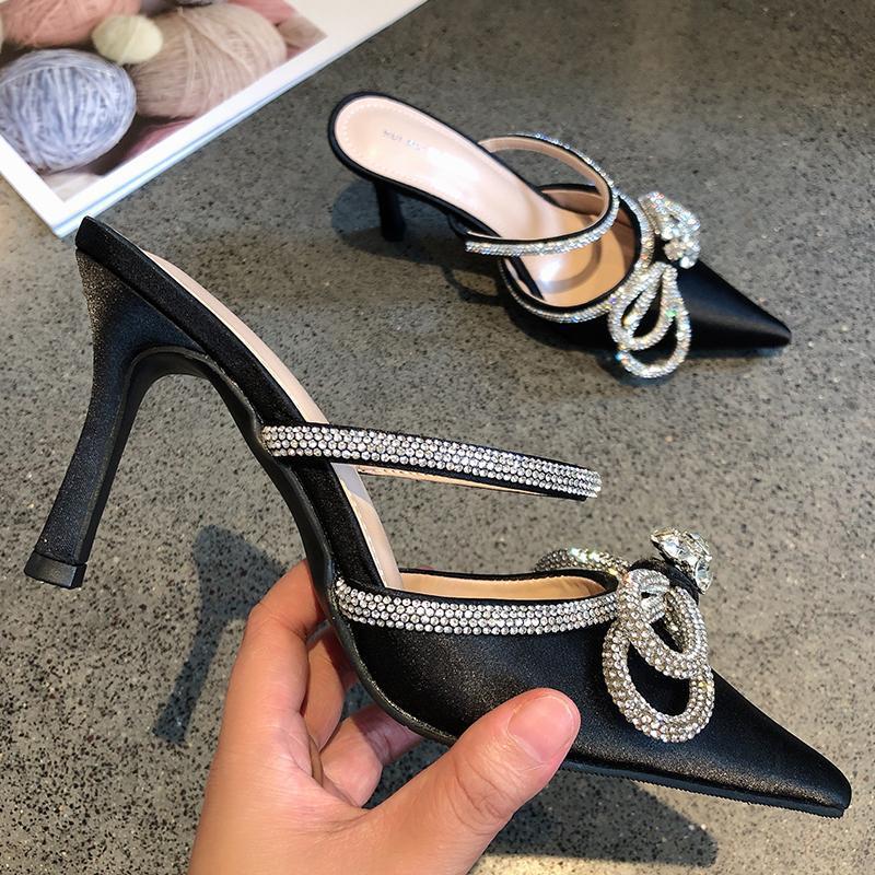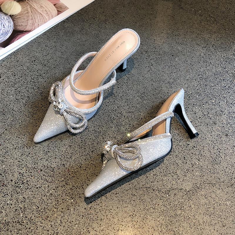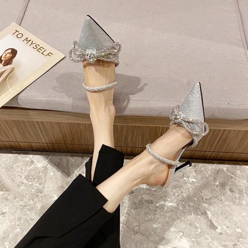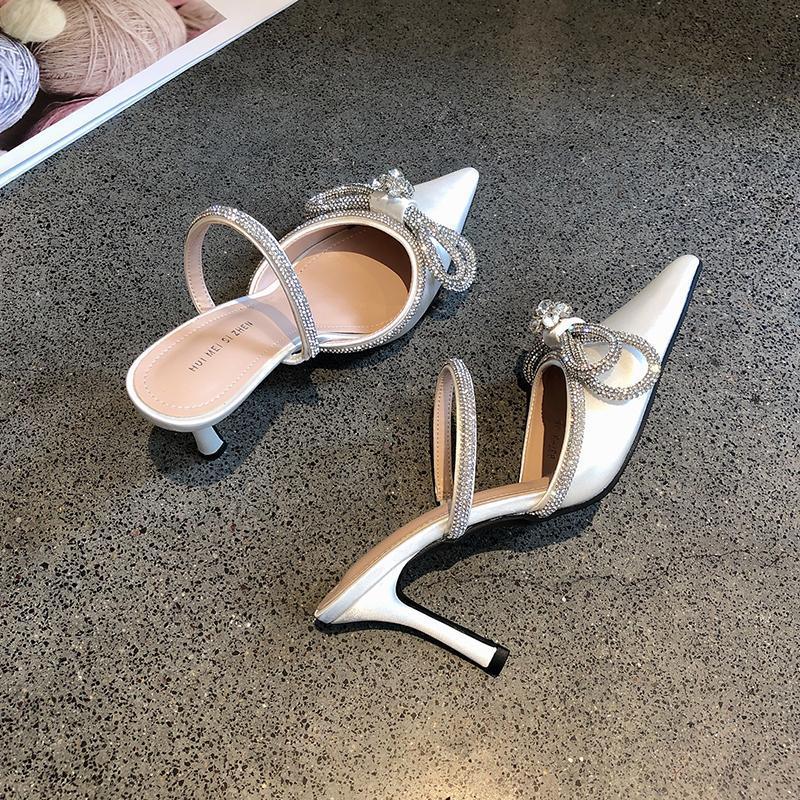 2025년 신상품 브로케이드 리본 얇은 굽 반슬리퍼 샌들 여성용 뾰족코 우아한 여성 하이힐 슬리퍼스토어 가기