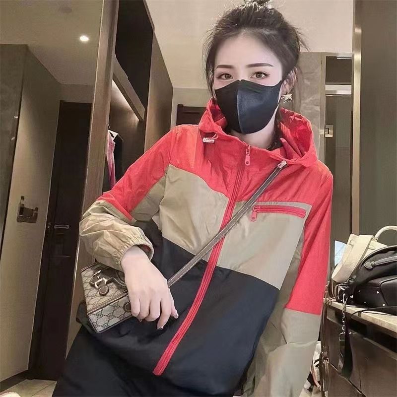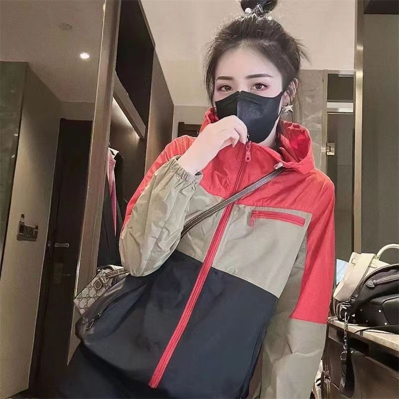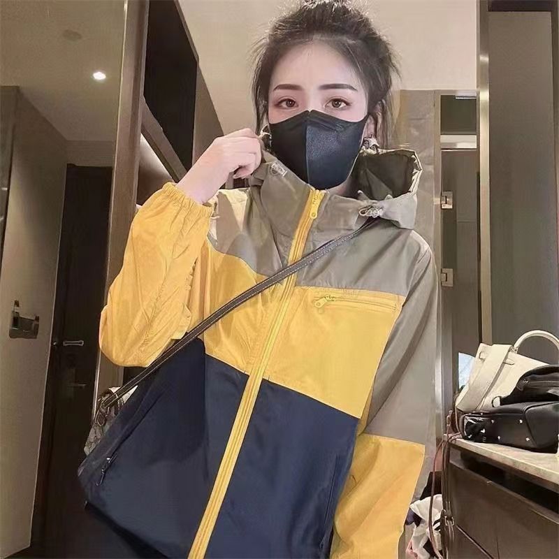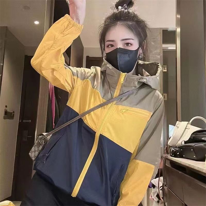 한국 스타일의 얇은 색상 일치 후드 태양 보호 의류 디자인 포켓 소녀의 슬림 핏 캐주얼 스포츠 태양 보호 의류스토어 가기