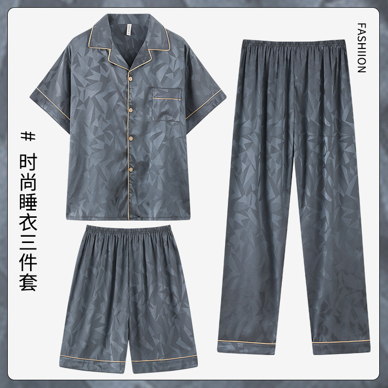 여름 잠옷 남성 자카드 아이스 실크 간단한 캐주얼 청소년 인공 실크 짧은 소매 3 피스 세트는 가정복 밖에서 착용 할 수 있습니다.스토어 가기