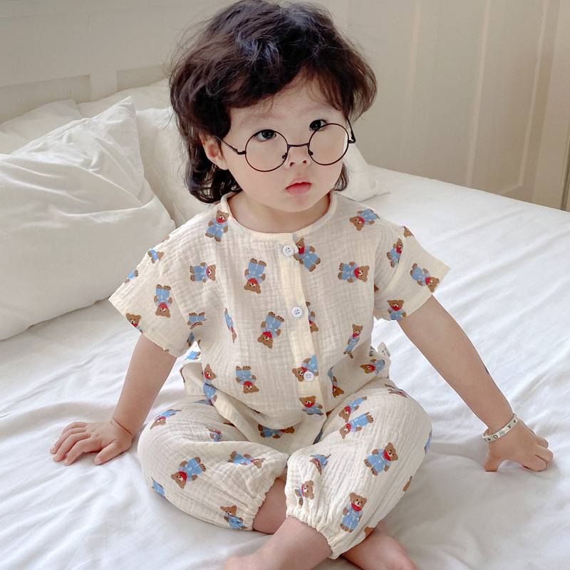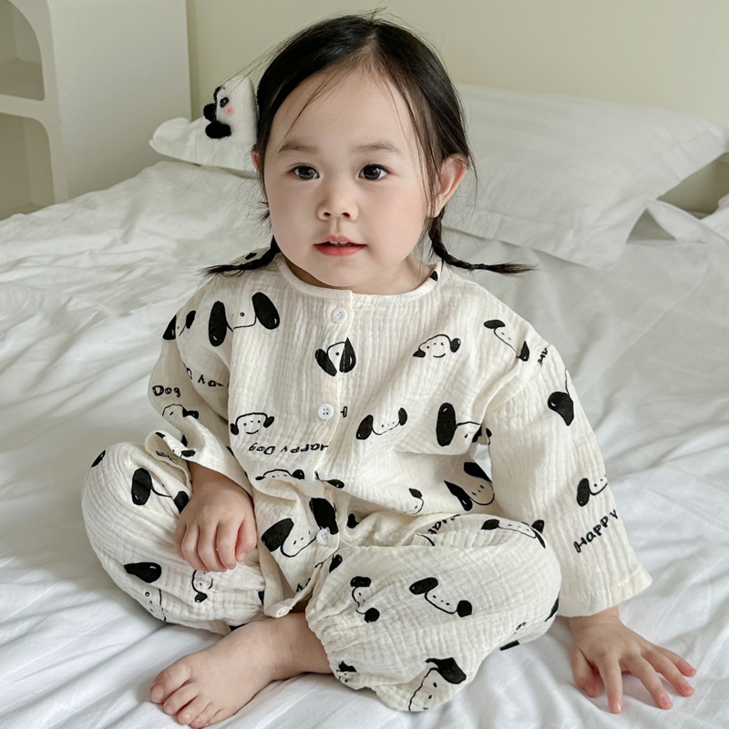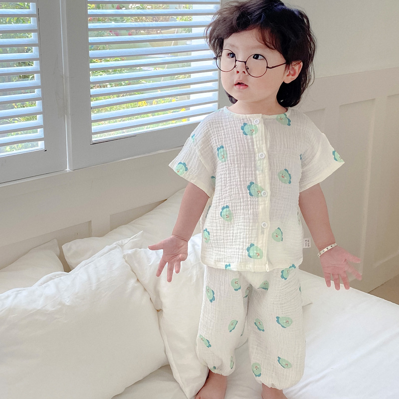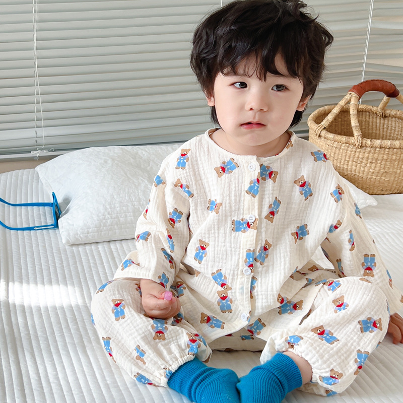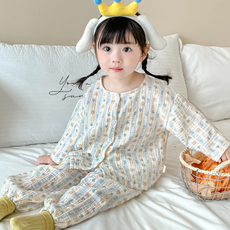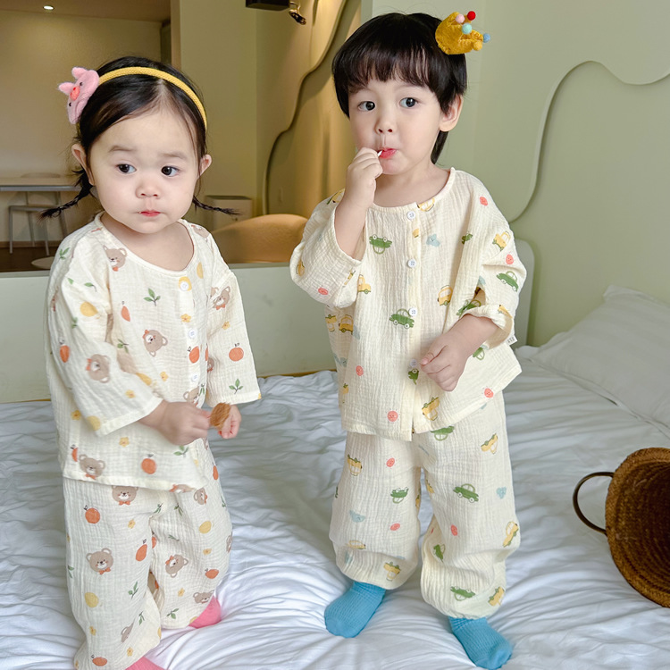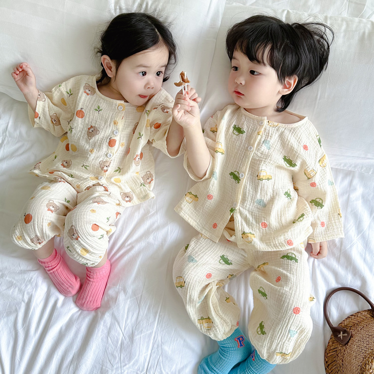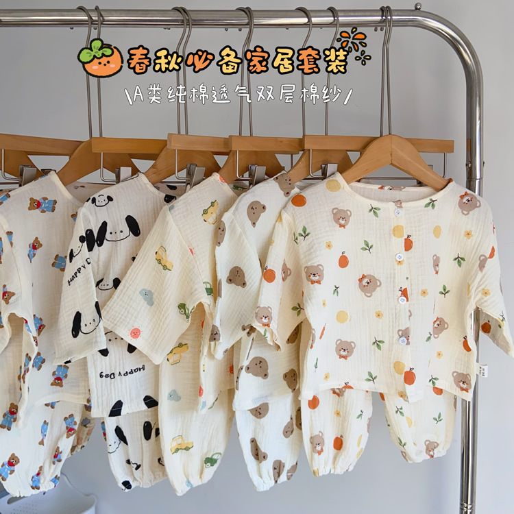 봄과 가을 여름 아기 홈 더블 레이어 면사 어린이 잠옷면 얇은 통기성 소년과 소녀 귀여운 세트스토어 가기