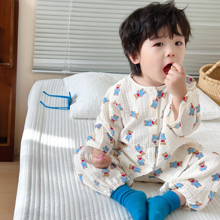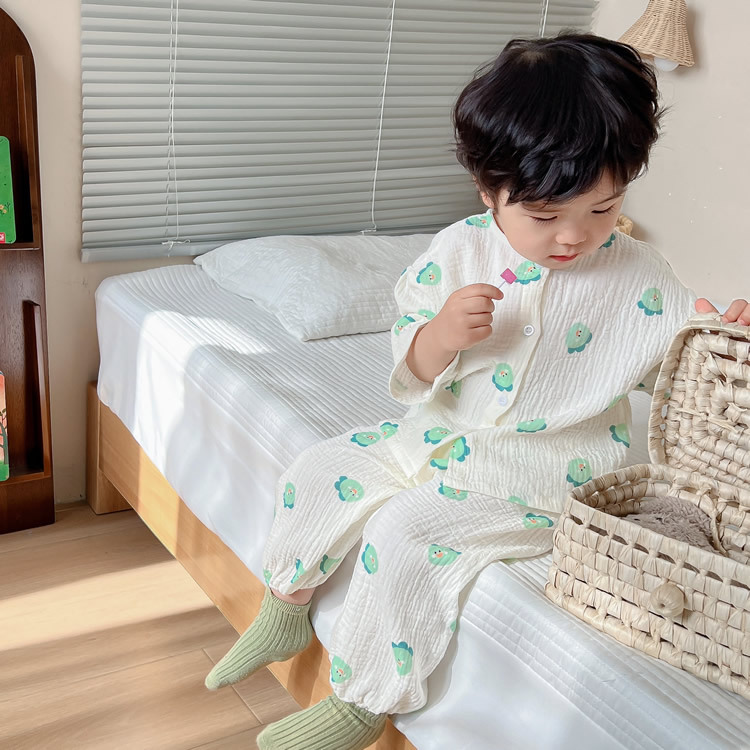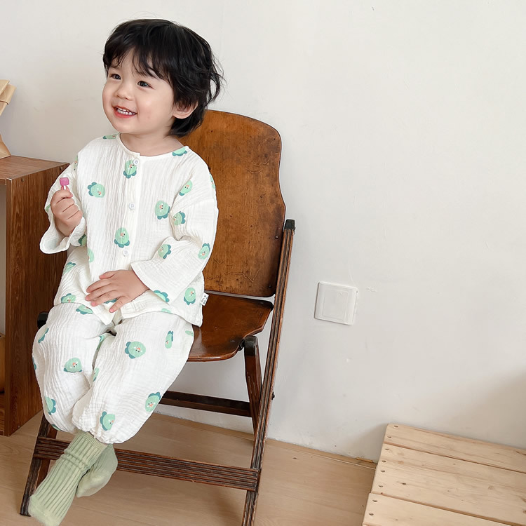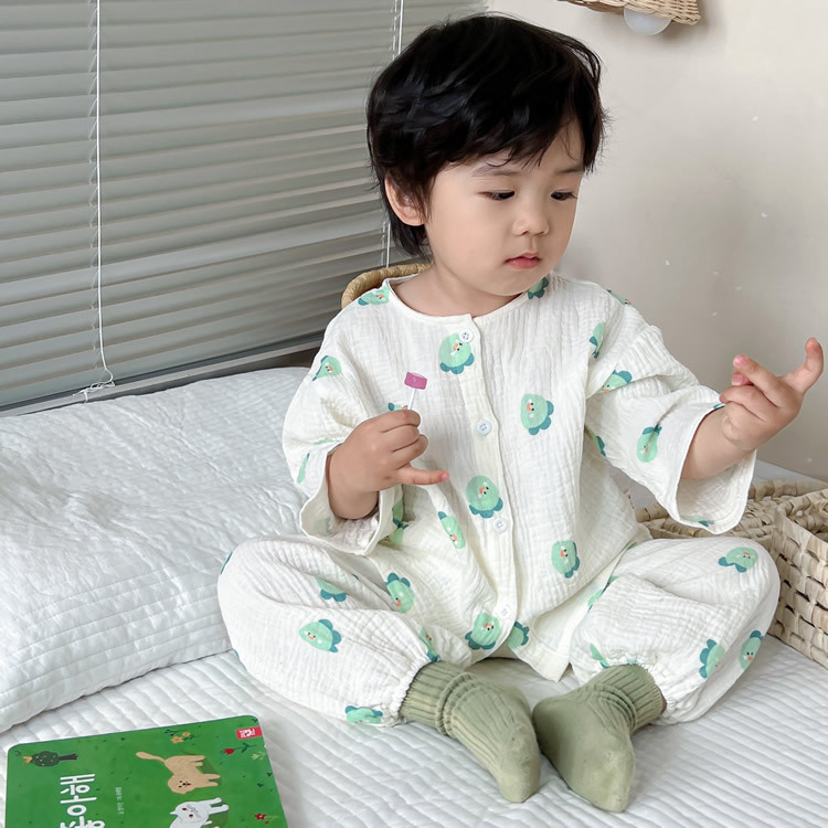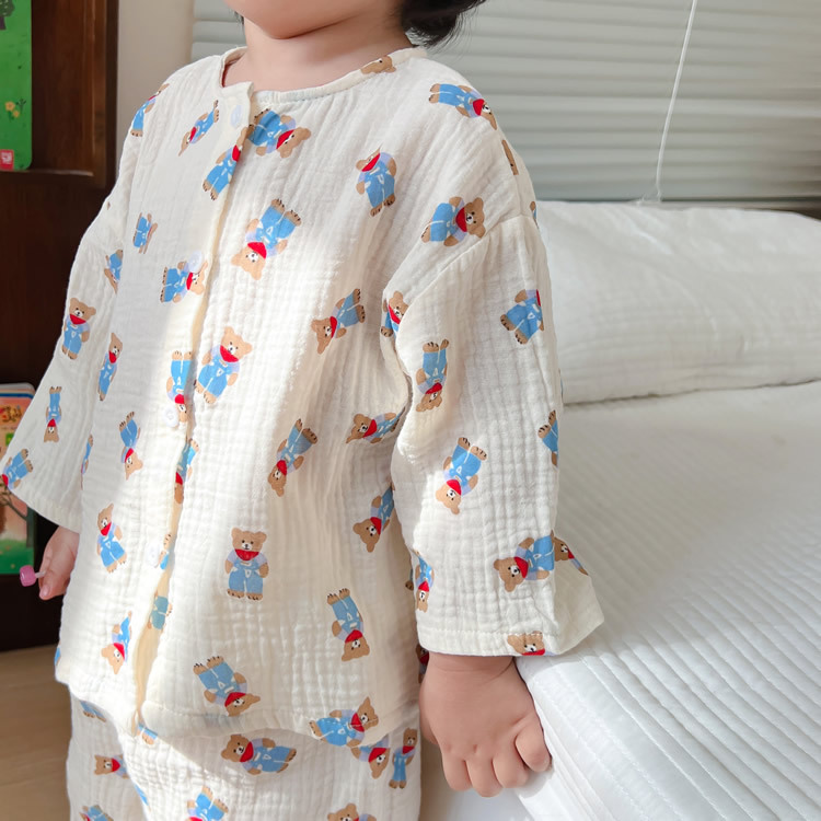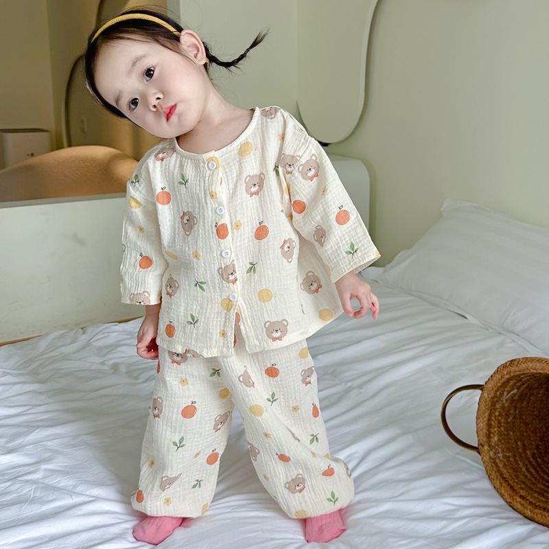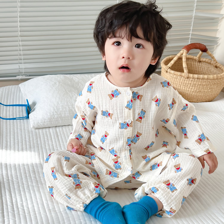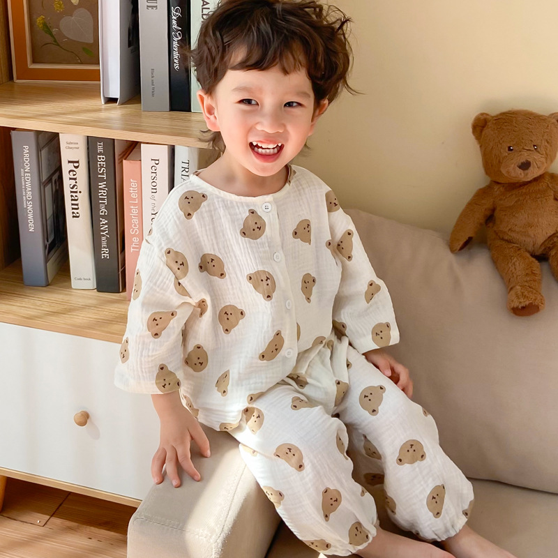 봄과 가을 여름 아기 홈 더블 레이어 면사 어린이 잠옷면 얇은 통기성 소년과 소녀 귀여운 세트스토어 가기