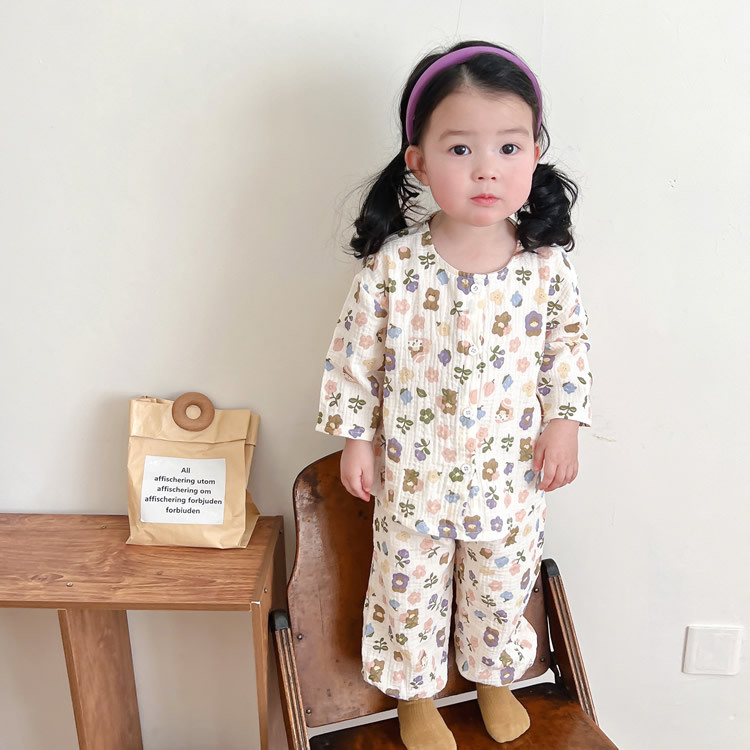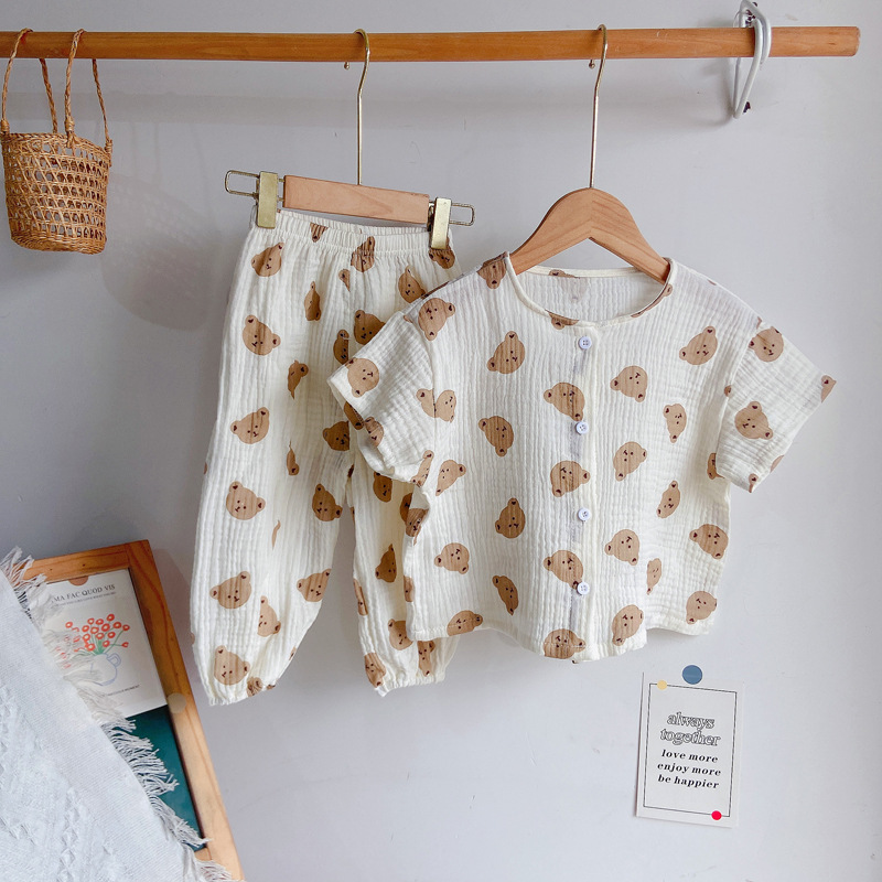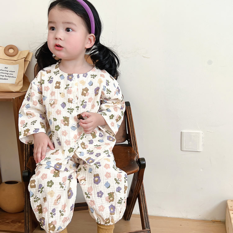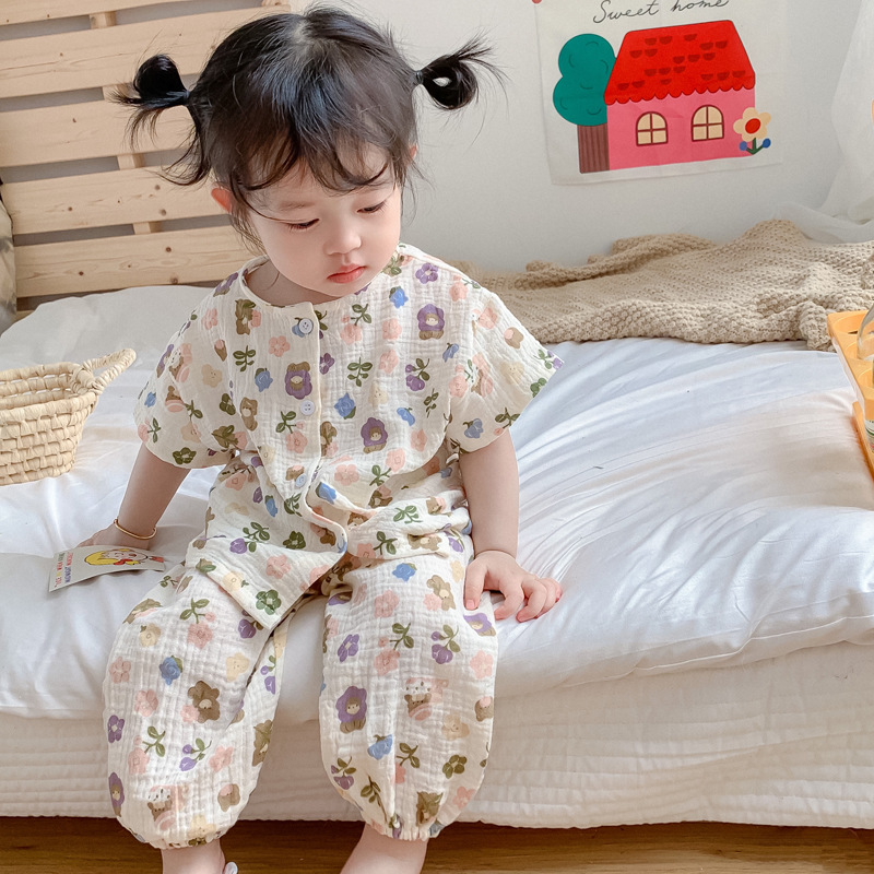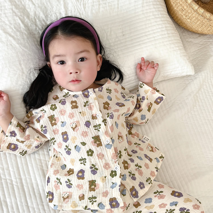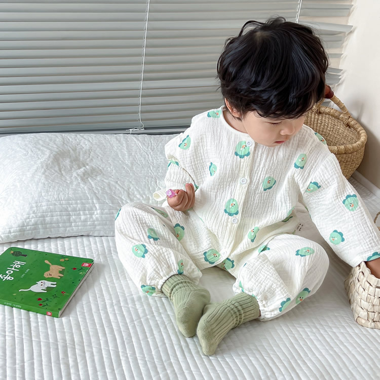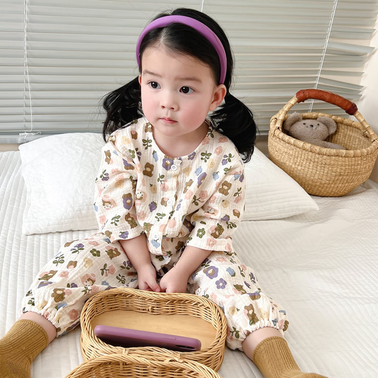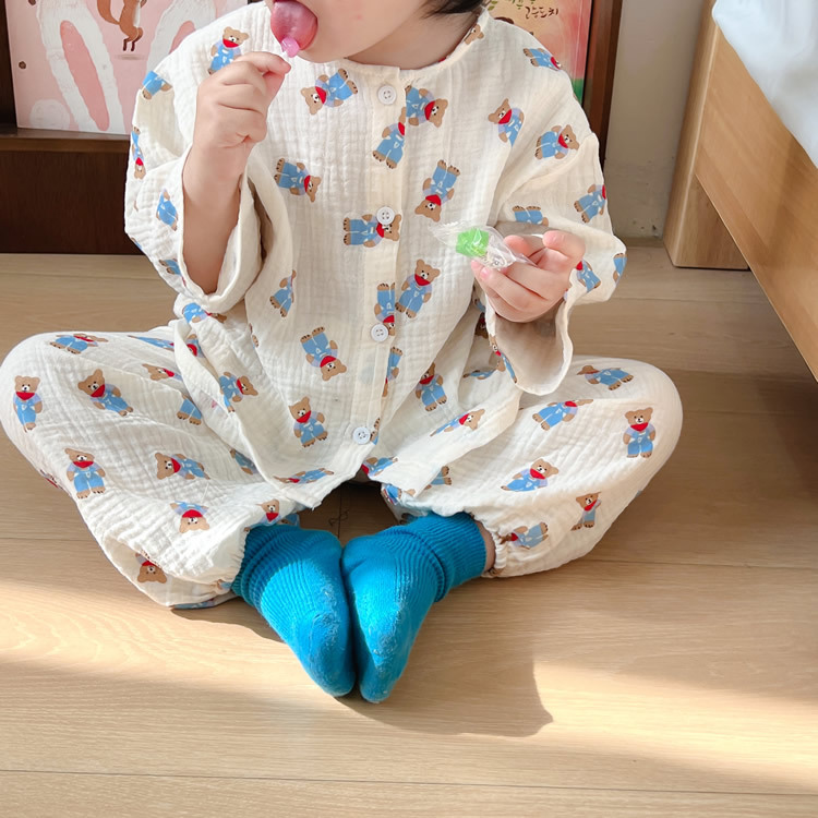 봄과 가을 여름 아기 홈 더블 레이어 면사 어린이 잠옷면 얇은 통기성 소년과 소녀 귀여운 세트스토어 가기