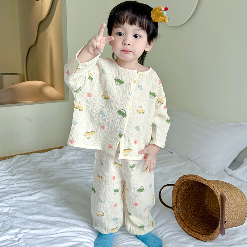 봄과 가을 여름 아기 홈 더블 레이어 면사 어린이 잠옷면 얇은 통기성 소년과 소녀 귀여운 세트