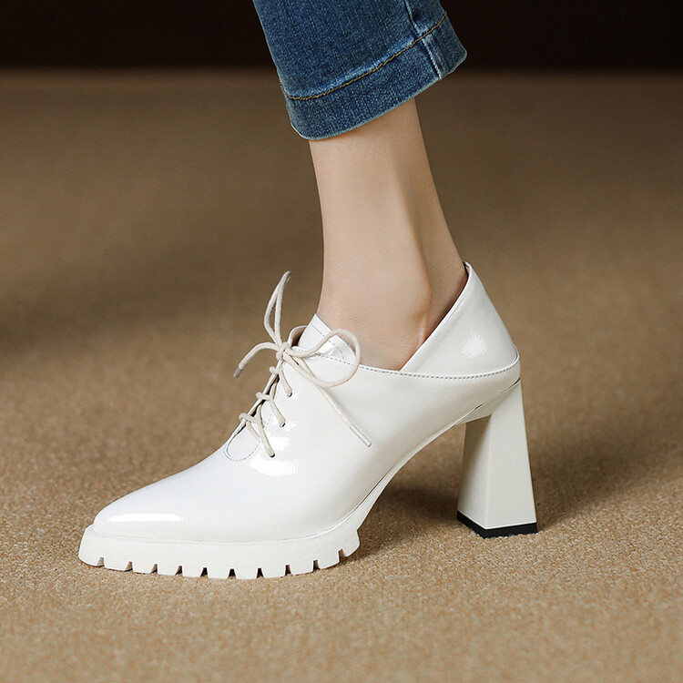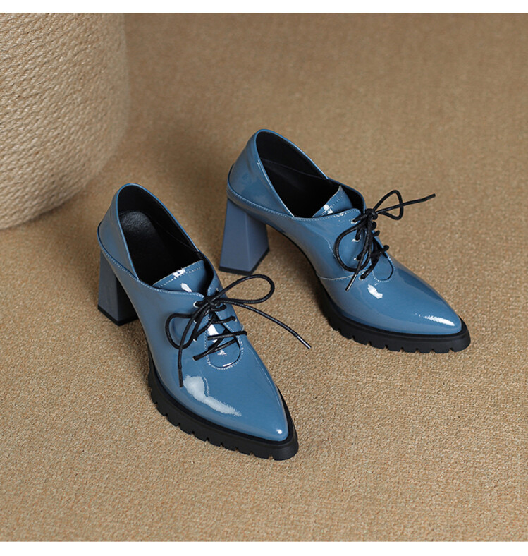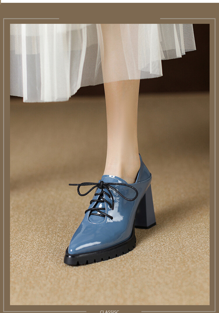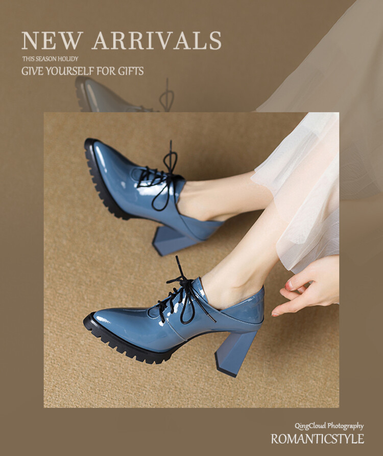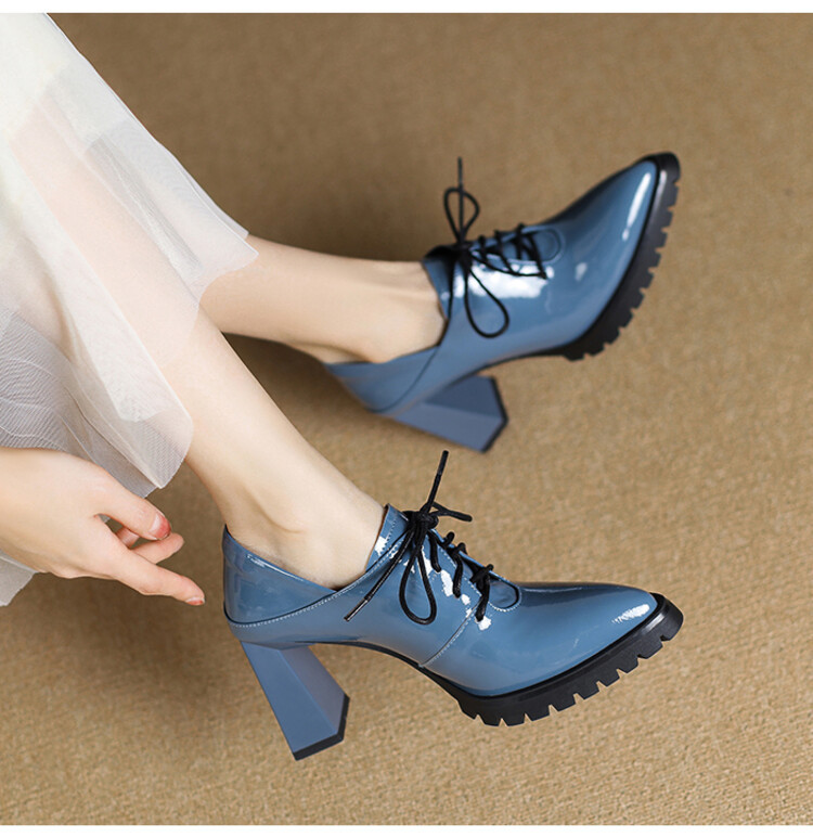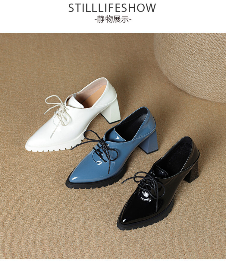 한국 스타일의 세련된 틈새 싱글 레이어 신발 방수 플랫폼 청키 힐 복고풍 하이힐 블랙 가죽 신발 여성용 특허 가죽스토어 가기