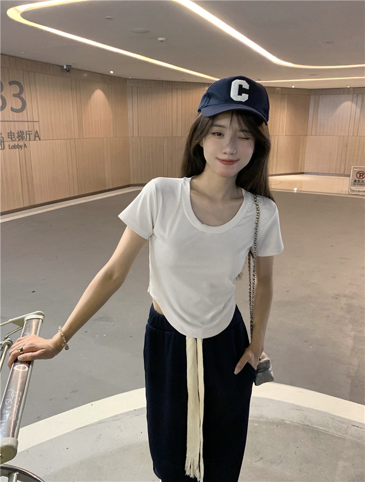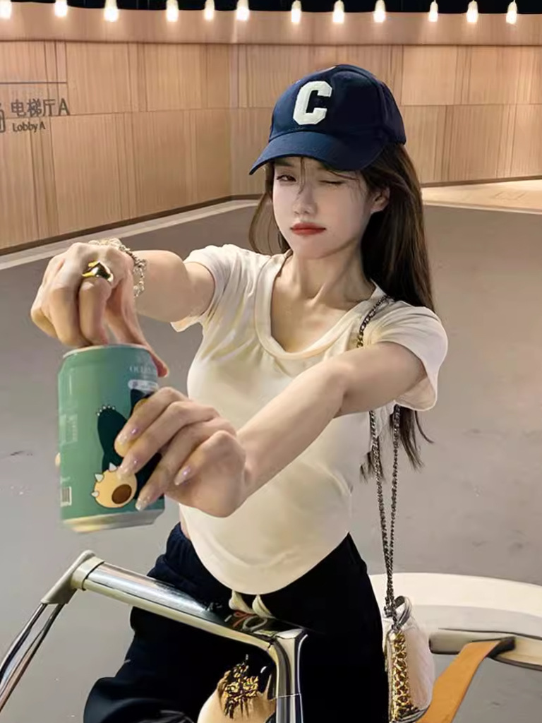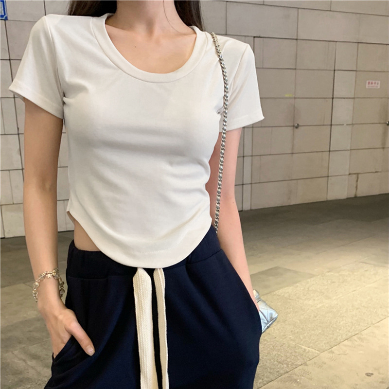 흰색 반팔 바닥 셔츠 핫 스타일 티셔츠 여성 의류 봄과 여름 새로운 슬리밍 슬림 핏 핫 걸 숄더 탑 여성스토어 가기