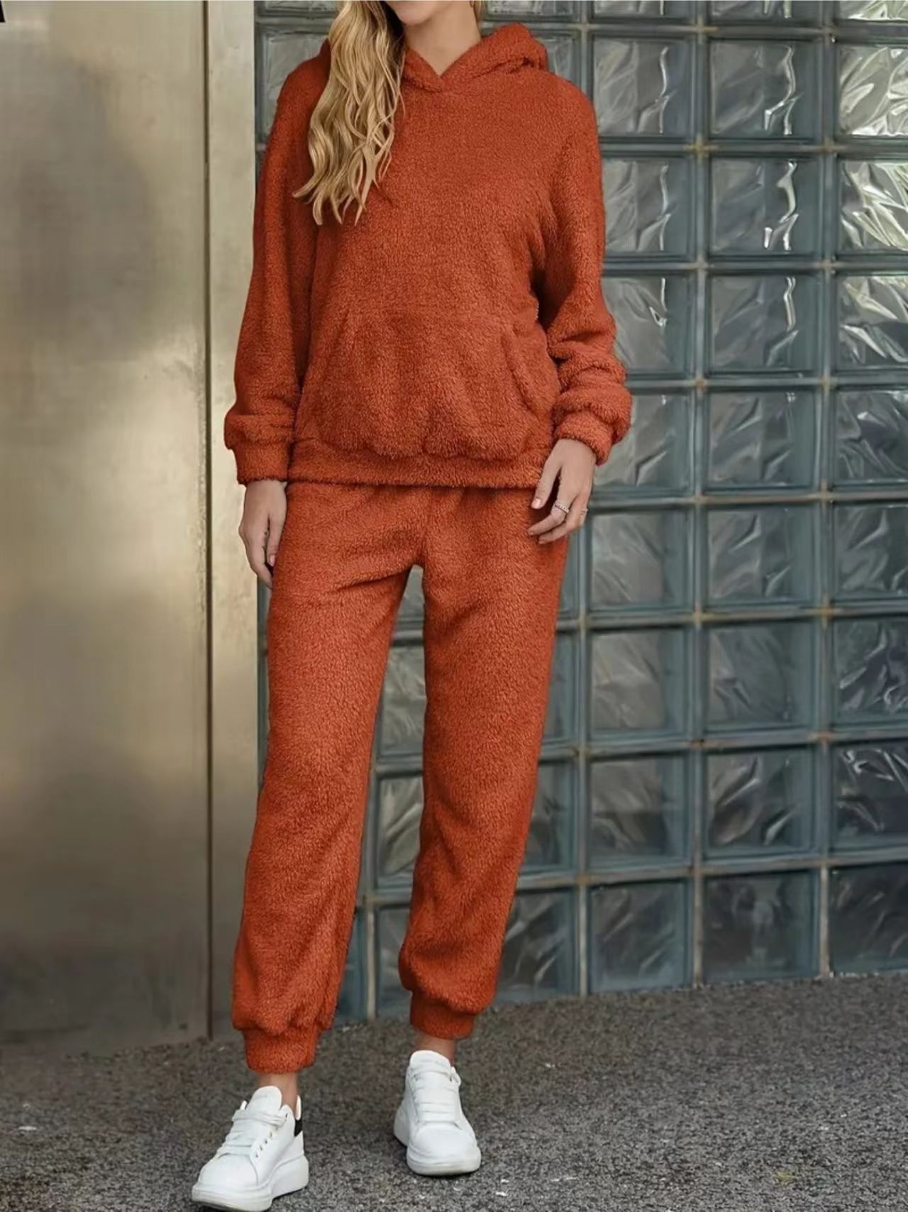 재고 유럽과 미국의 국경 2025 가을과 겨울 단색 여성의 후드 긴 소매 패치 백 캐주얼 팬츠 홈 투피스 세트스토어 가기