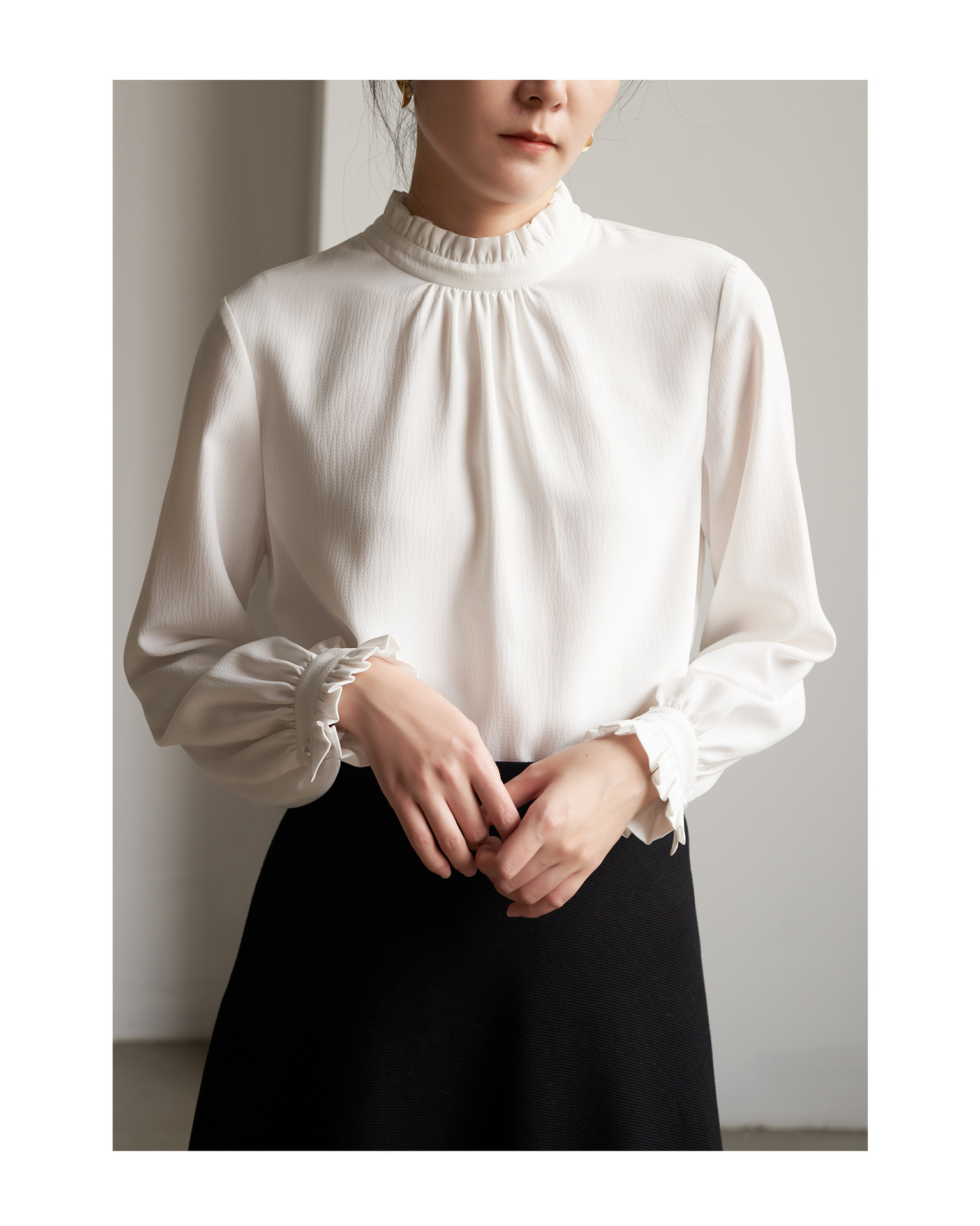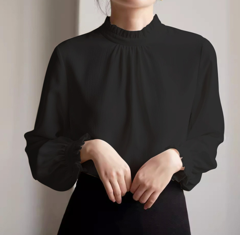 프랑스 우아한 이른 봄 통근 나무 귀를 쌓아 긴 소매 셔츠 여성의 흰색 내부 상단스토어 가기
