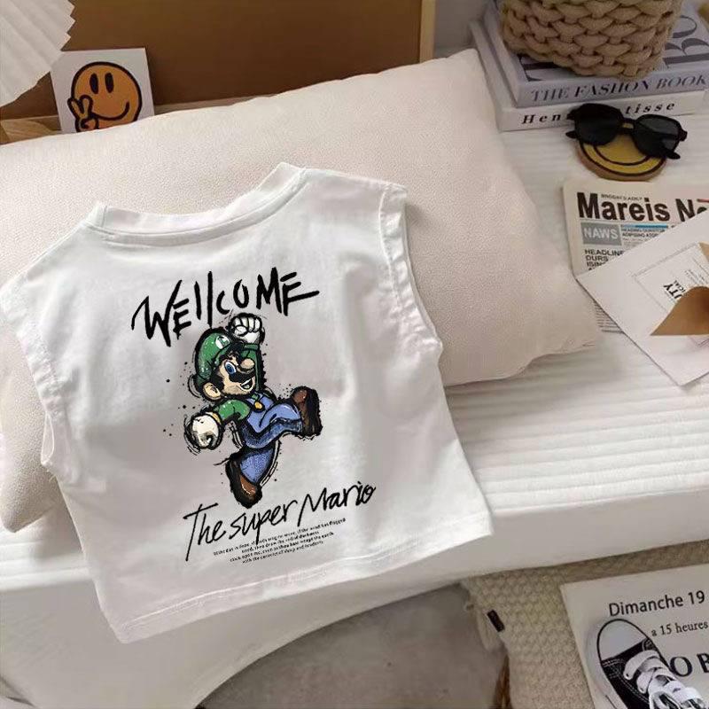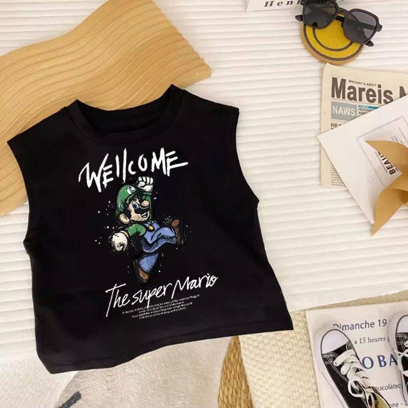 코튼 한국식 여름 어린이 라운드 민소매 티셔츠 소년 소녀 올 매치 트렌디 한 어린이 아기 프린트 조끼 탑스토어 가기