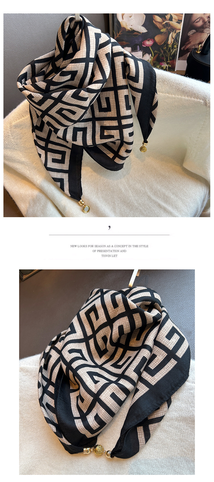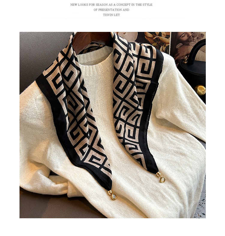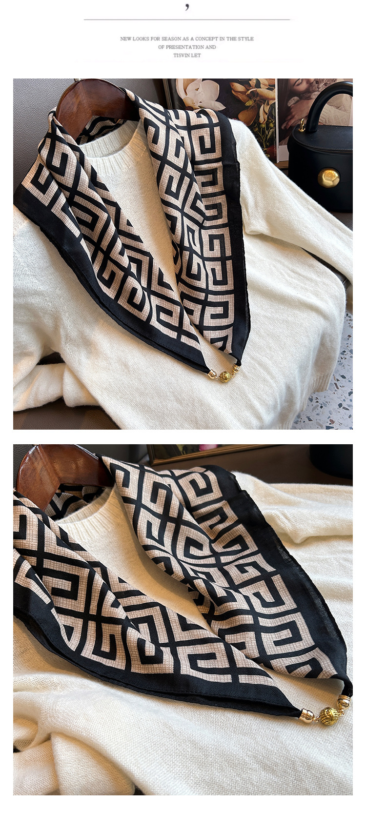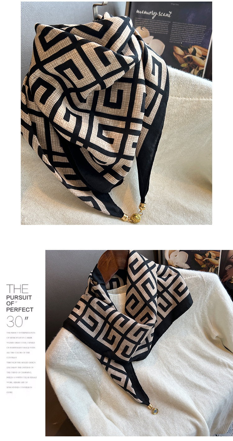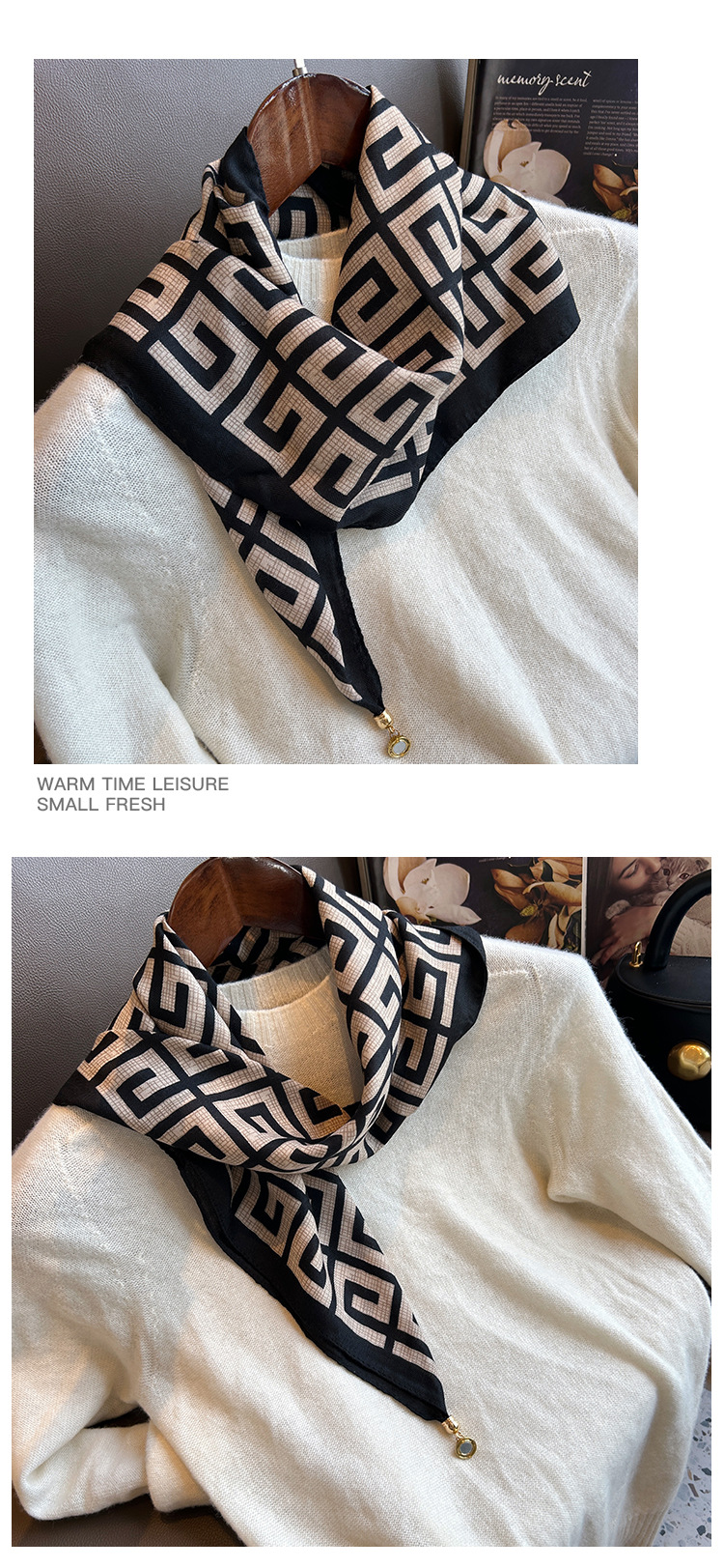 여성용 실크 스카프 봄 한국 스타일의 세련된 올 매치 스카프 외부 스카프 금속 버클 블랙 문자 삼각형 목도리