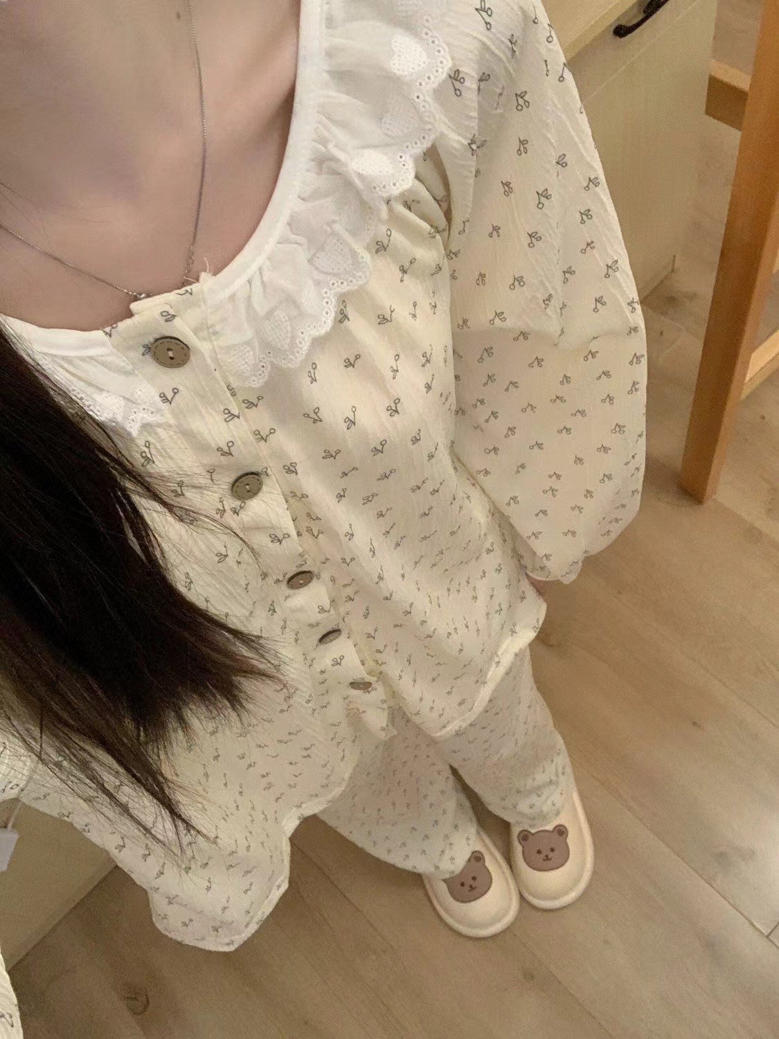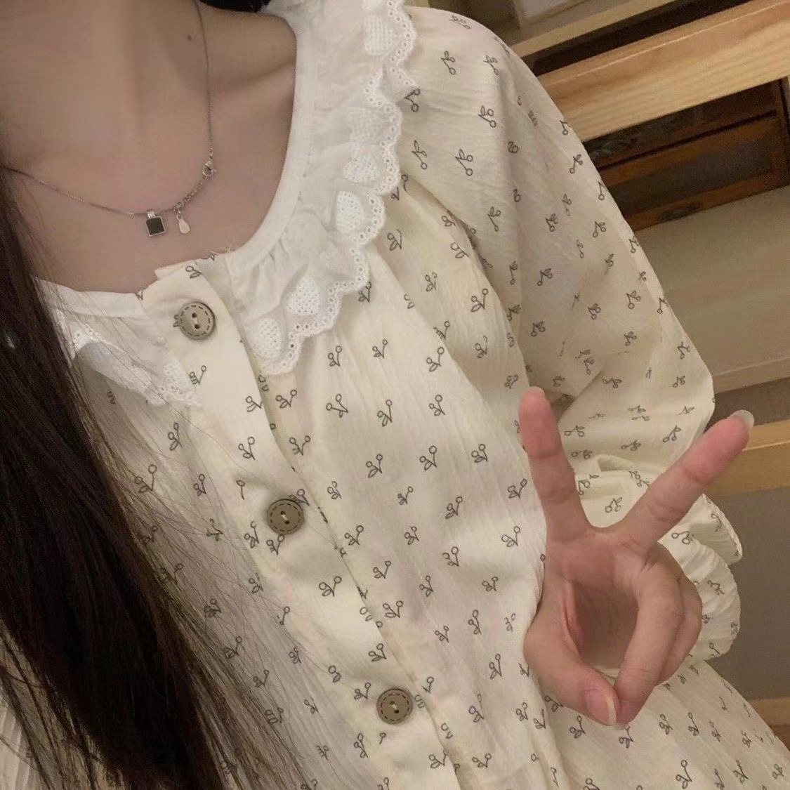 잠옷 여성의 봄과 가을 얇은 인 스타일 레이스 꽃 틈새 디자인 느슨한 한국 스타일 달콤한 긴 소매 홈 웨어스토어 가기