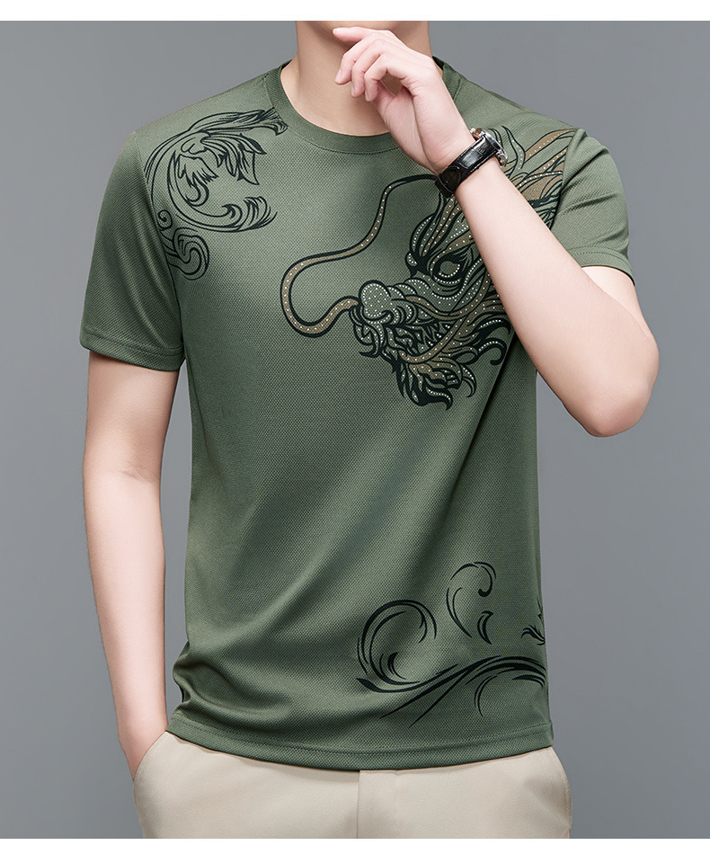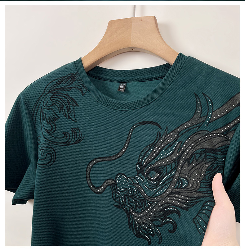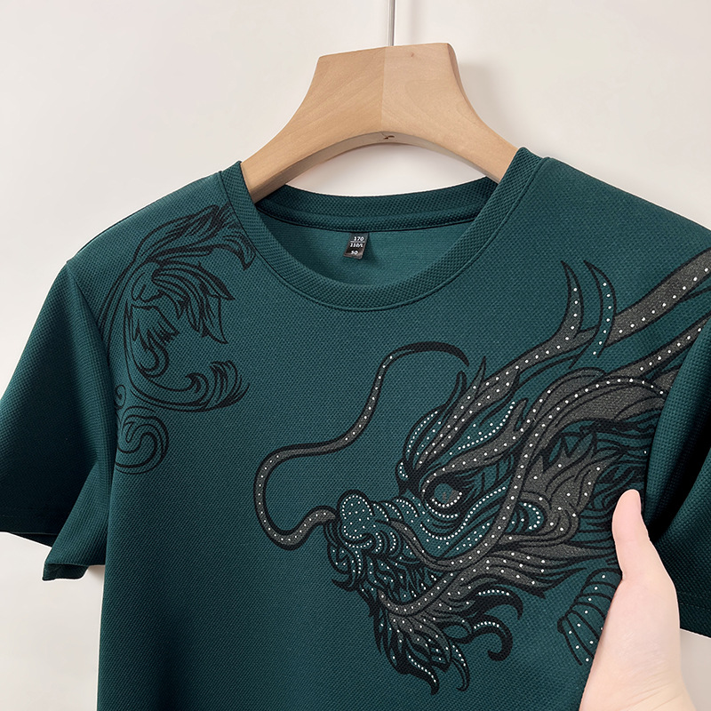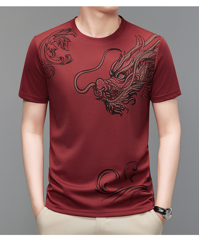 여름 2024 남자 라운드 넥 스웨터 올 매치 반팔 드래곤 패턴 프린트 풀오버 바닥 레드 T