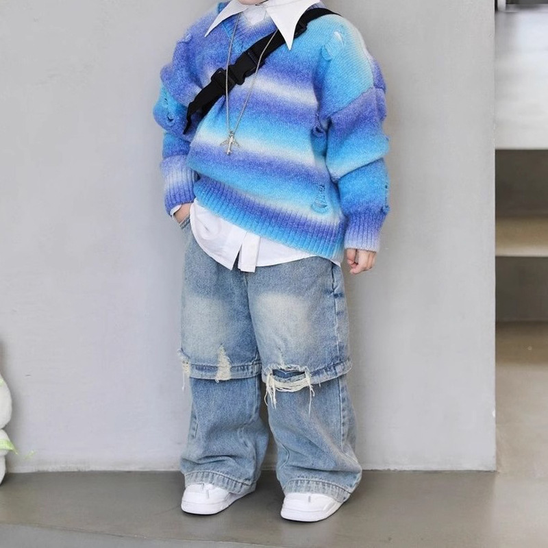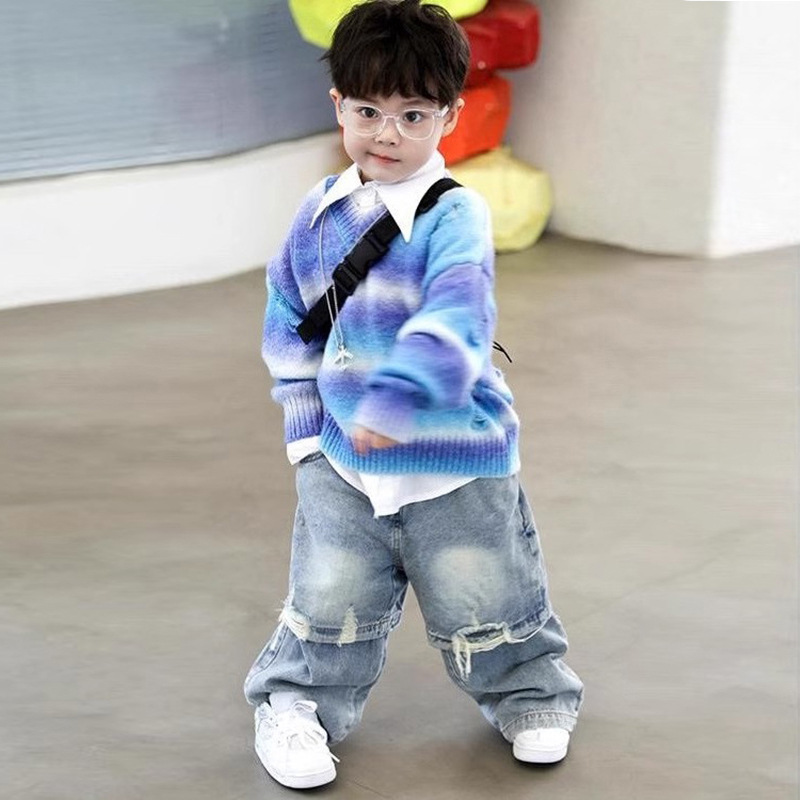 남아 정장 2025 가을 겨울 신상품 중소형 아동용 스포츠 따뜻한 그라데이션 컬러 스웨터 심플한 한국식 3피스 세트