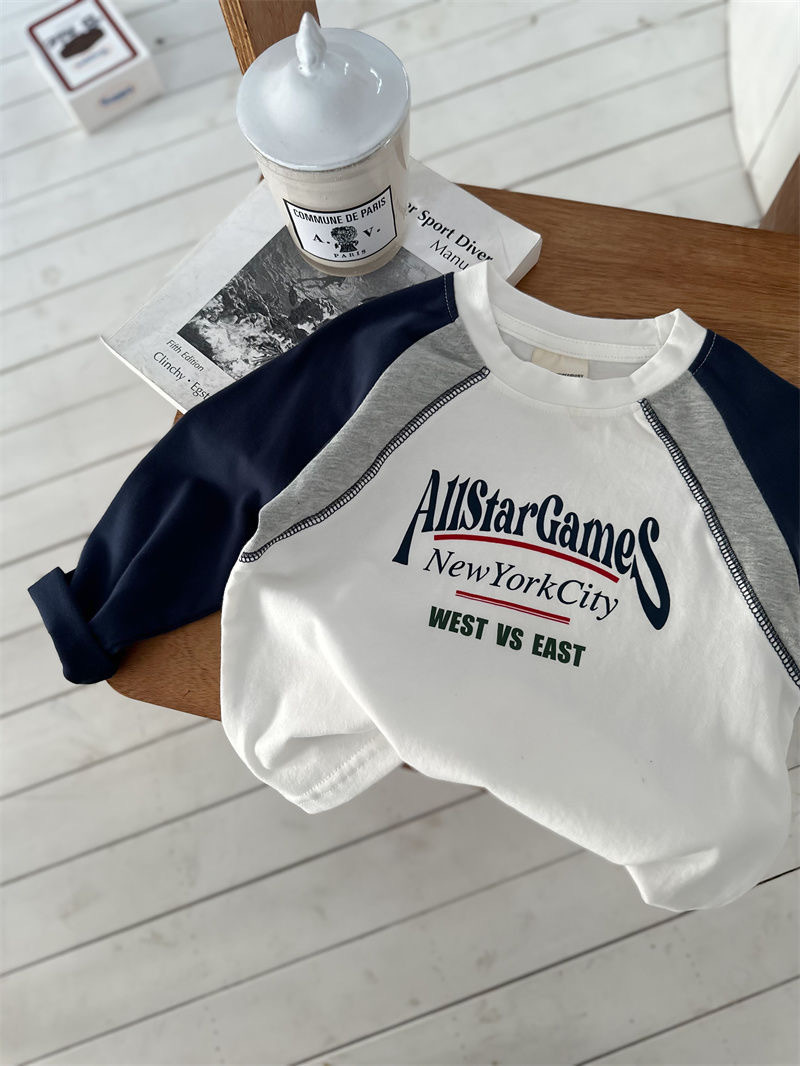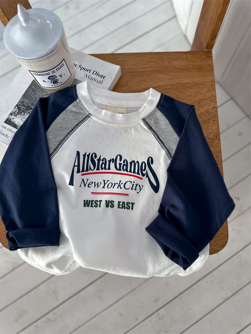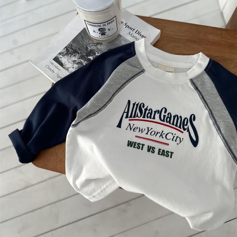 봄과 가을 어린이 코튼 긴팔 티셔츠 새로운 스티칭 컬러 삽입 잘 생긴 소년 티셔츠 미국 루즈 탑 패션 셔츠스토어 가기