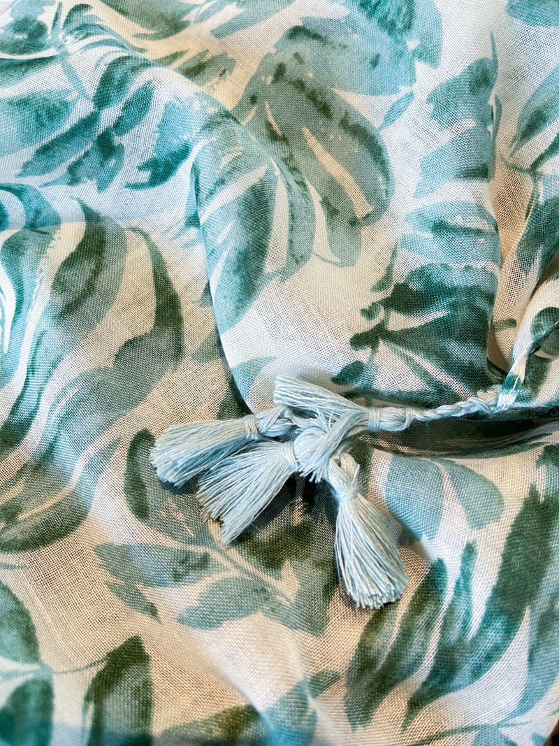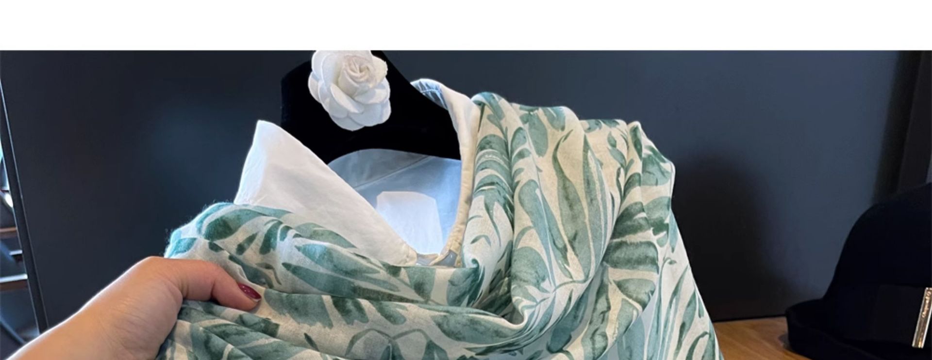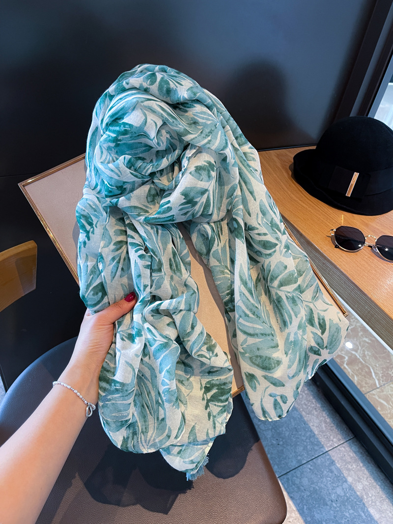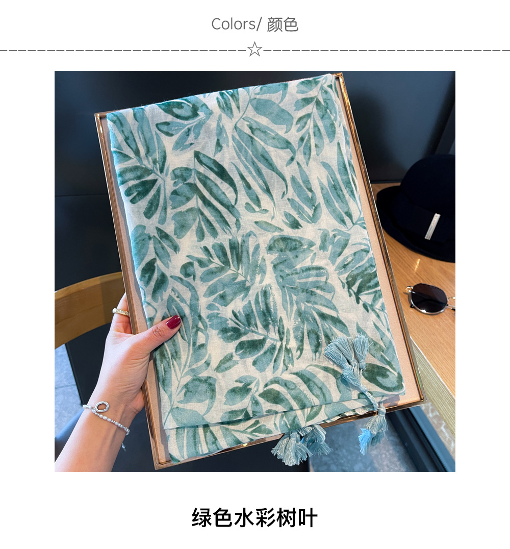 丝巾女夏季韩版百搭薄款纱巾遮阳棉麻水彩树叶绿色沙滩巾防晒披肩