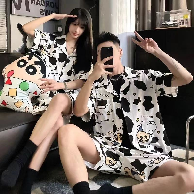 커플 잠옷 여성의 여름 아이스 실크 짧은 소매는 2024 새 여름 밖에서 착용 할 수 있습니다 실크 남성 홈 웨어 세트