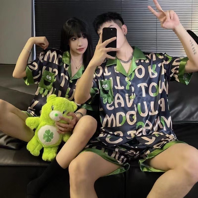 커플 잠옷 여성의 여름 아이스 실크 짧은 소매는 2024 새 여름 밖에서 착용 할 수 있습니다 실크 남성 홈 웨어 세트스토어 가기