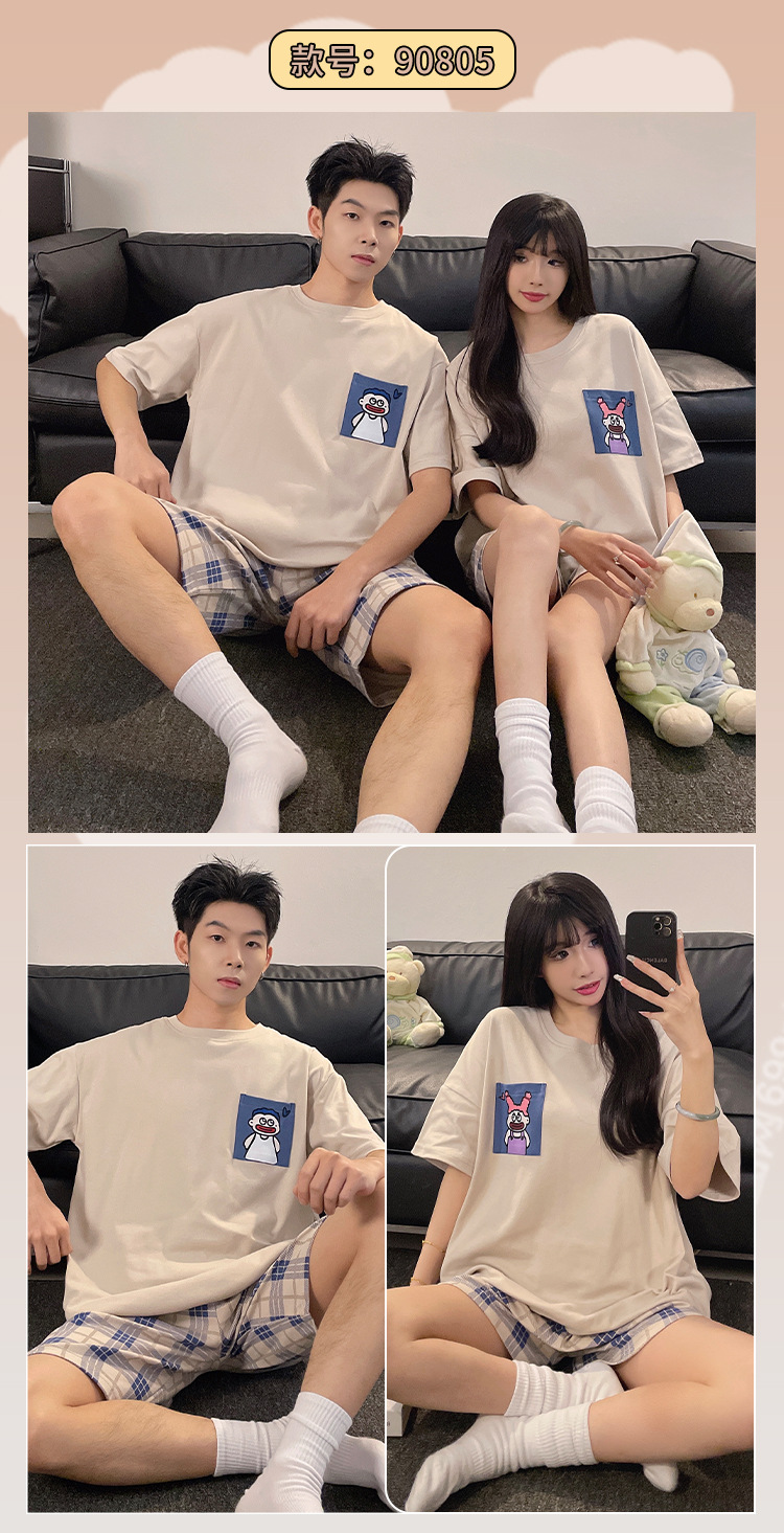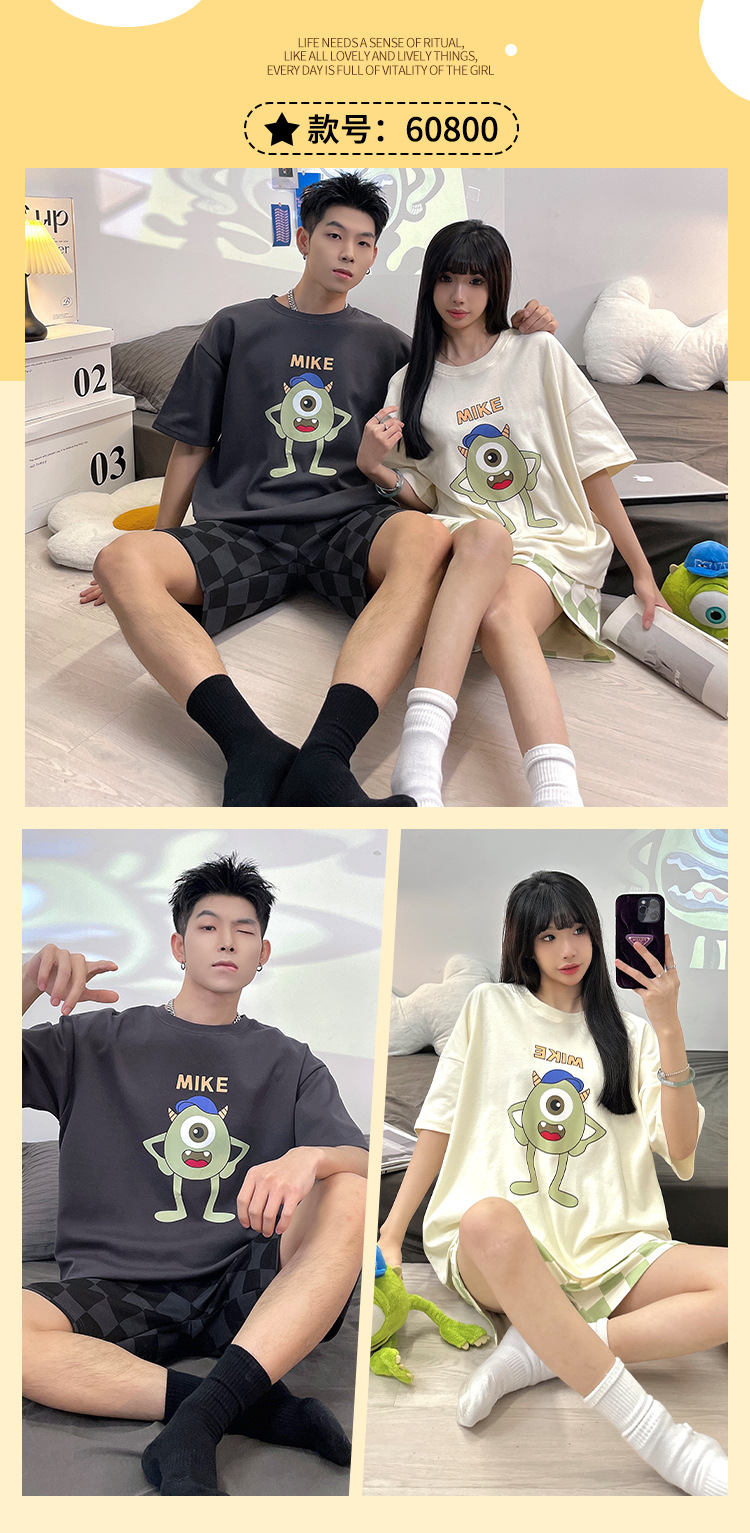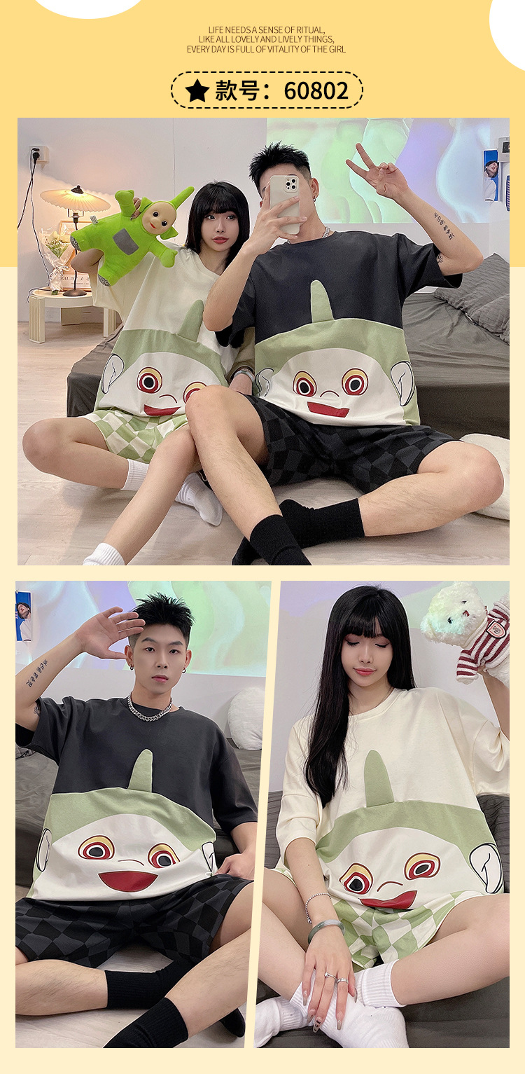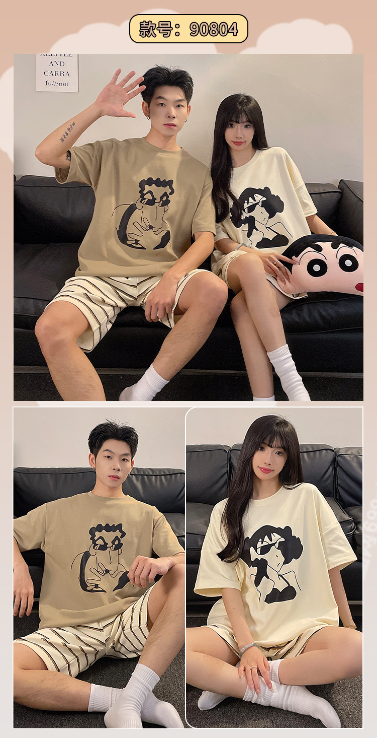 2024 새 커플 잠옷 여성 여름 코튼 투피스 얇은 여름 반팔 남성 만화 홈웨어스토어 가기