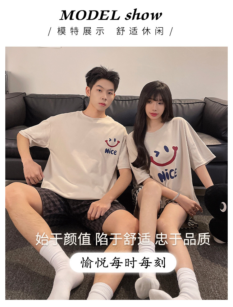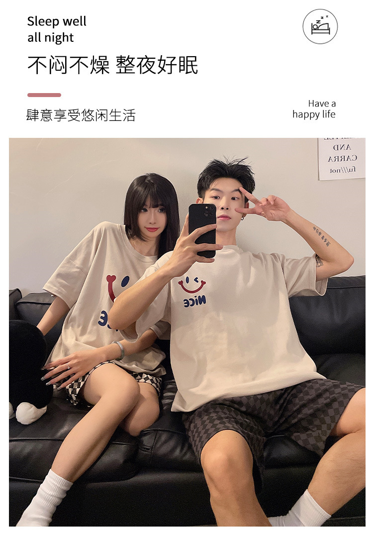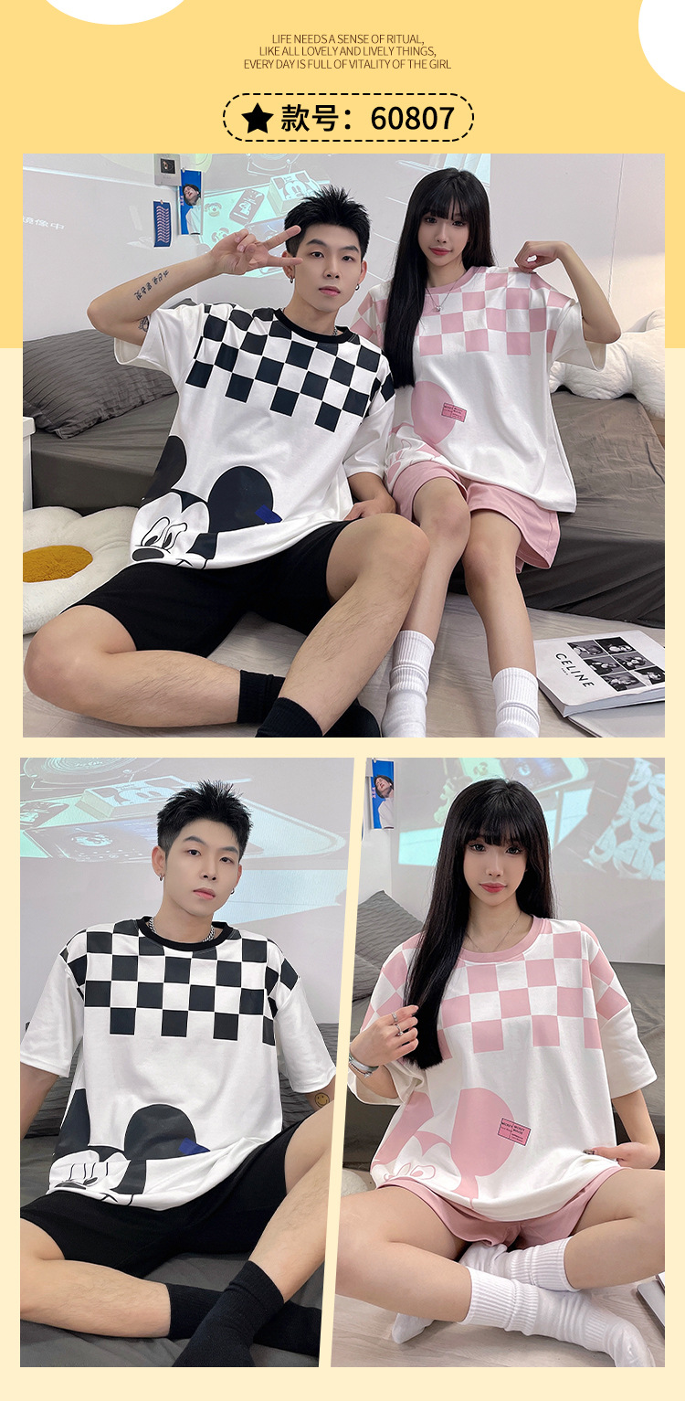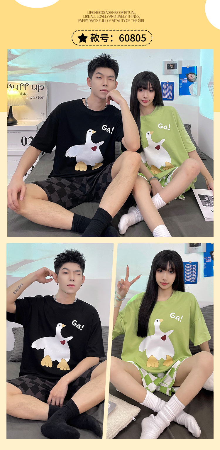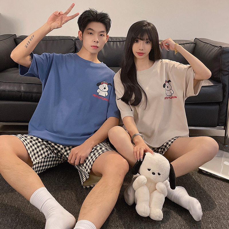 2024 새 커플 잠옷 여성 여름 코튼 투피스 얇은 여름 반팔 남성 만화 홈웨어스토어 가기