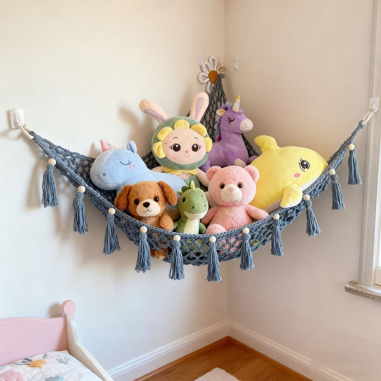 국경 도매 삼각형 장난감 그물 주머니 손으로 짠 면 로프 침실 어린이 방 코너 장난감 보관 그물 해먹스토어 가기