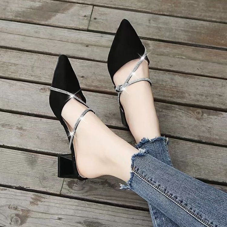 봄과 여름 2024 여성을위한 로우 힐 클로징 발가락 하프 슬리퍼 새로운 패션 라인 스톤이 올 매치 청키 힐 아웃 도어 뮬러 샌들을 가리 켰습니다.스토어 가기