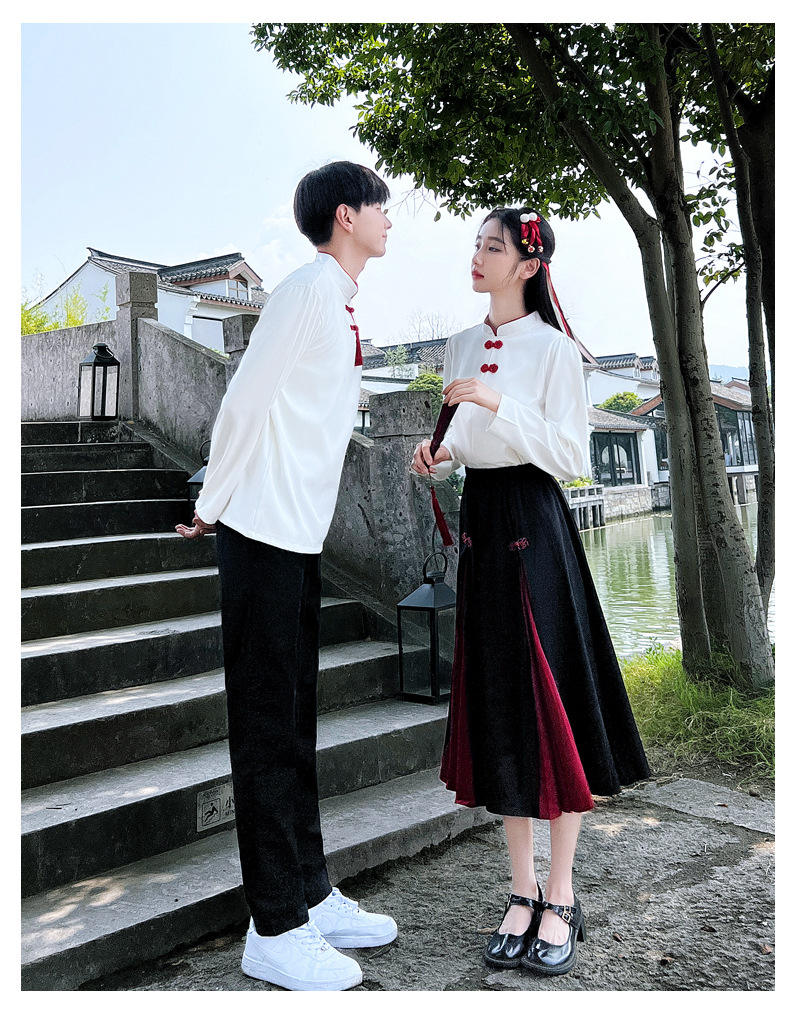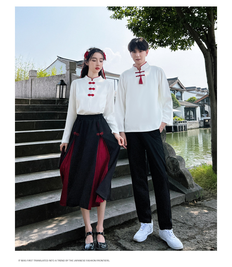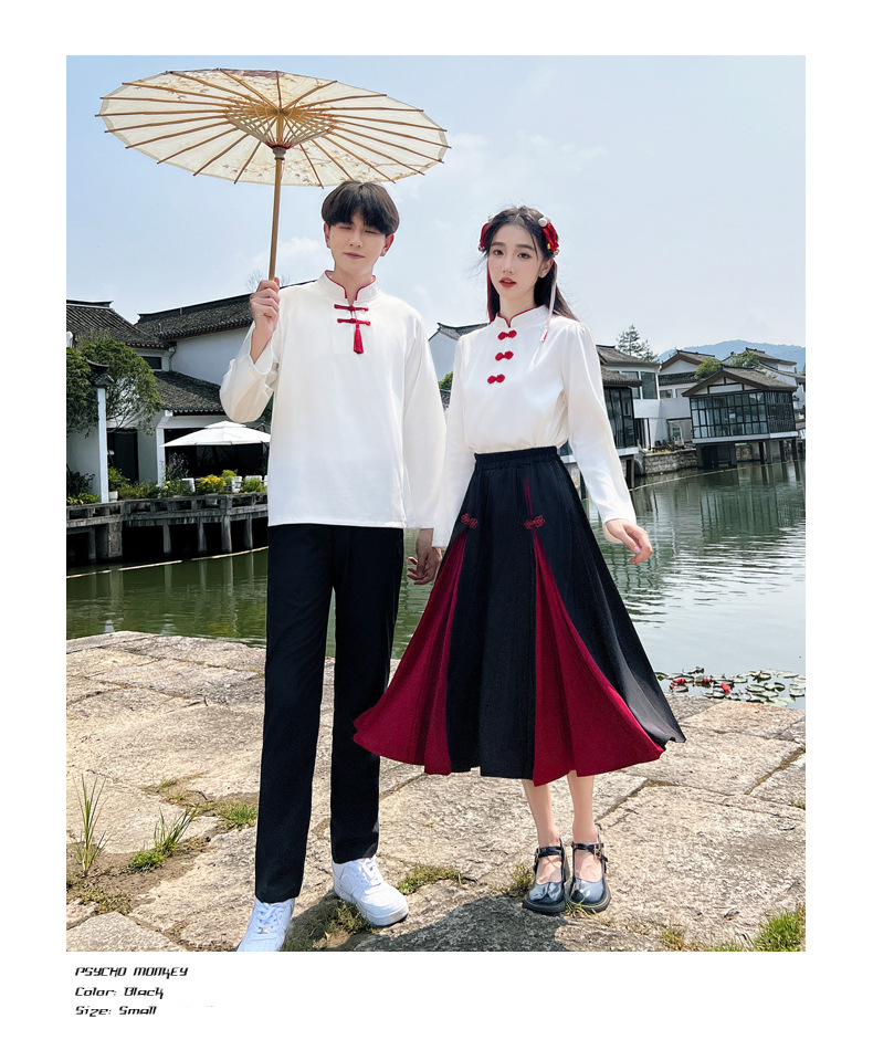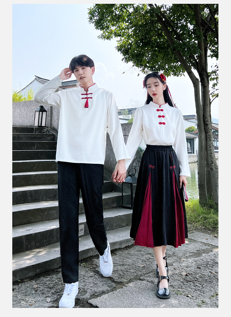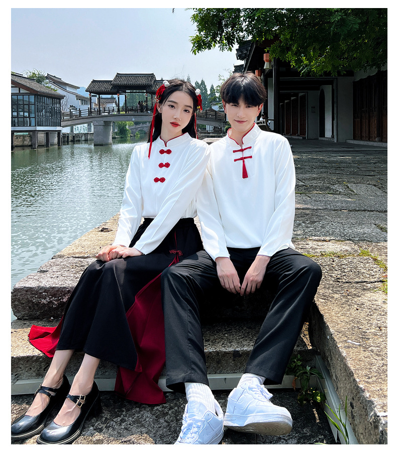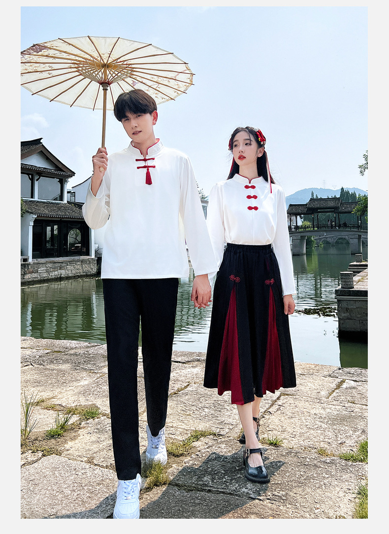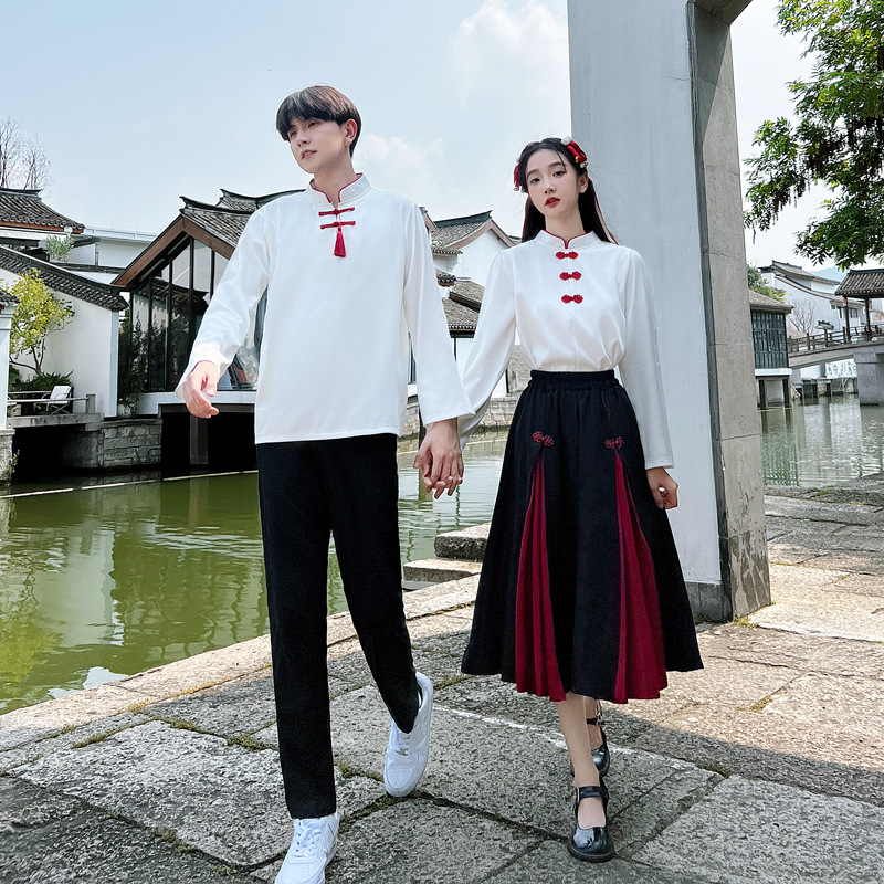 내셔널 스타일 가을 커플 개선 된 버클 고대 스타일 졸업 사진 무대 유니폼 교복 학교 유니폼 스커트 스탠드 칼라 셔츠를 입습니다.스토어 가기