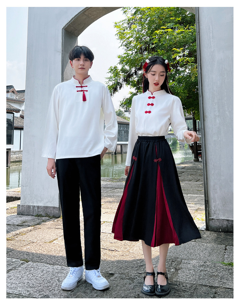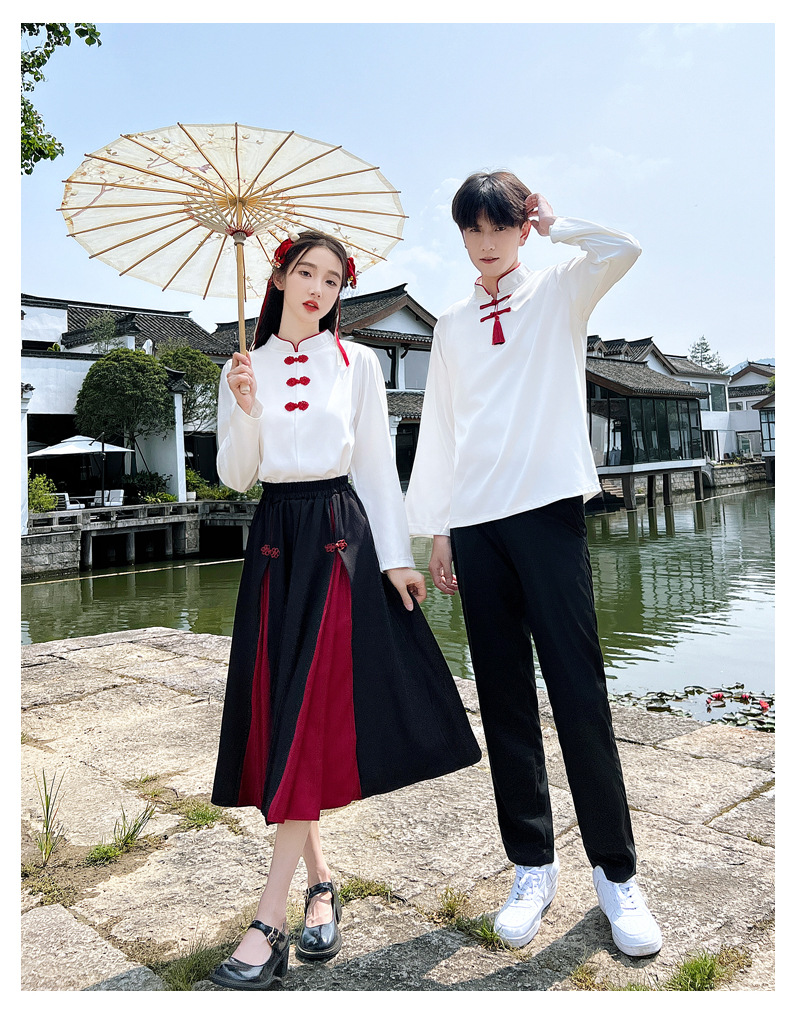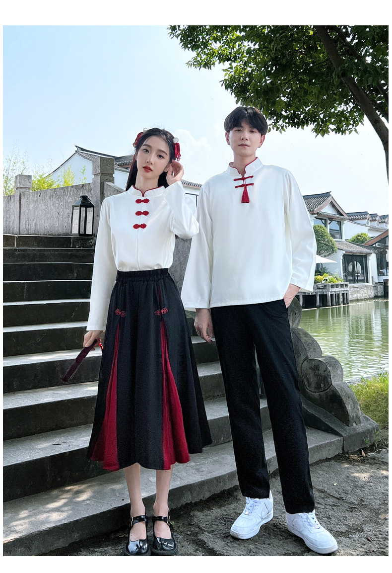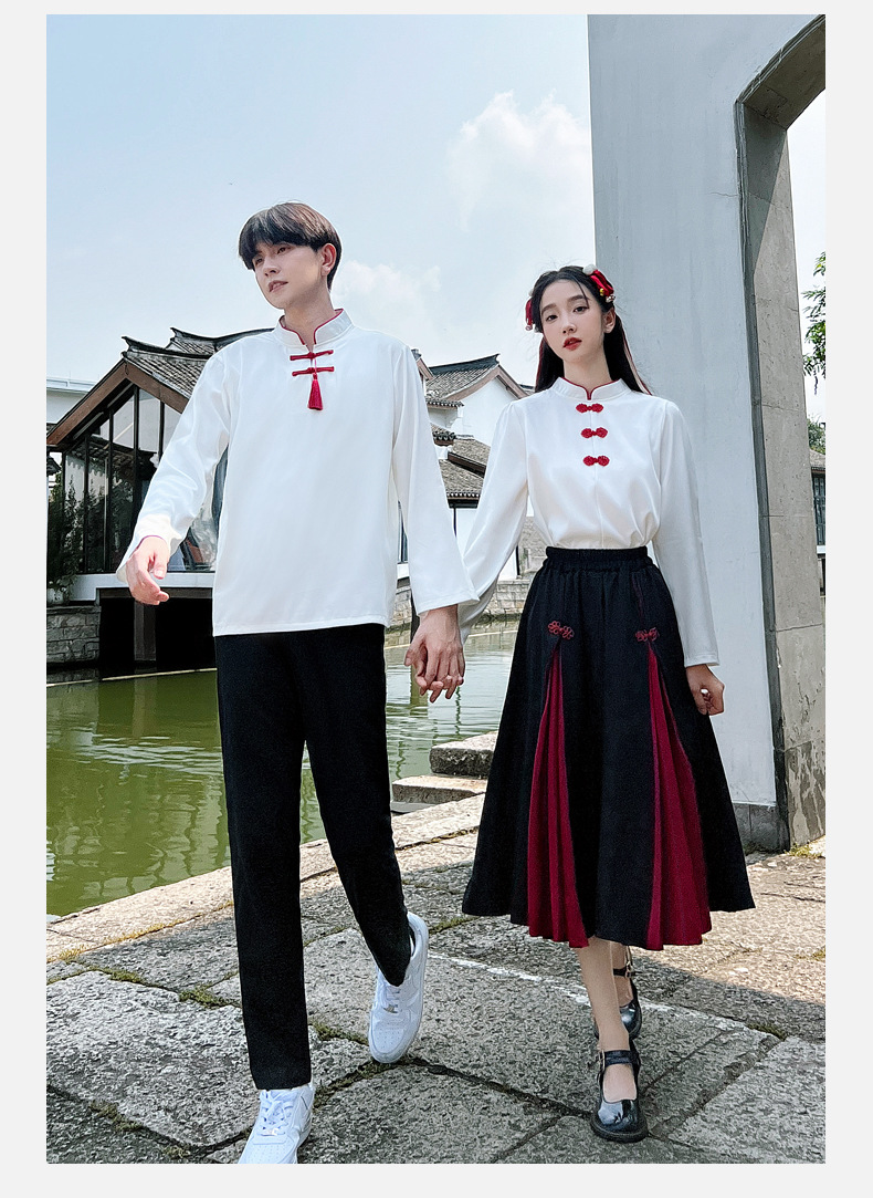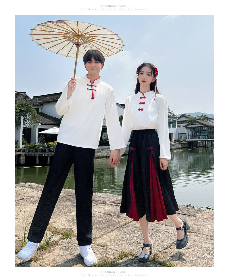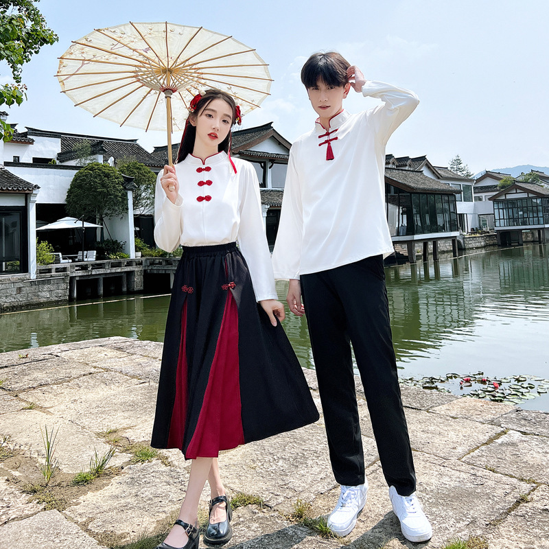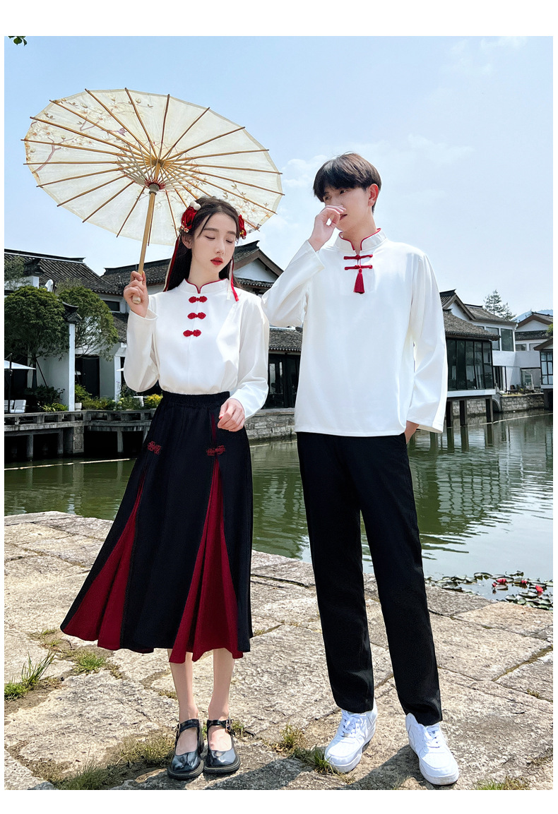 내셔널 스타일 가을 커플 개선 된 버클 고대 스타일 졸업 사진 무대 유니폼 교복 학교 유니폼 스커트 스탠드 칼라 셔츠를 입습니다.