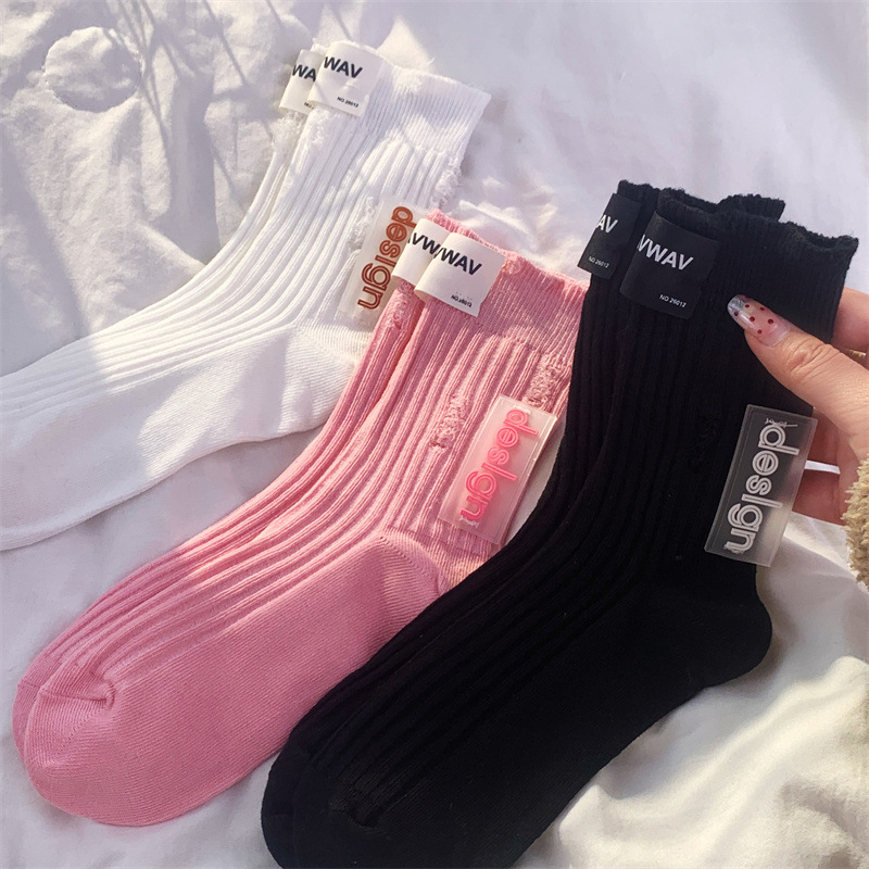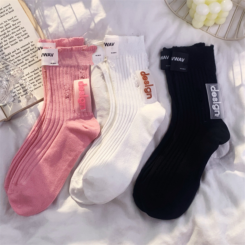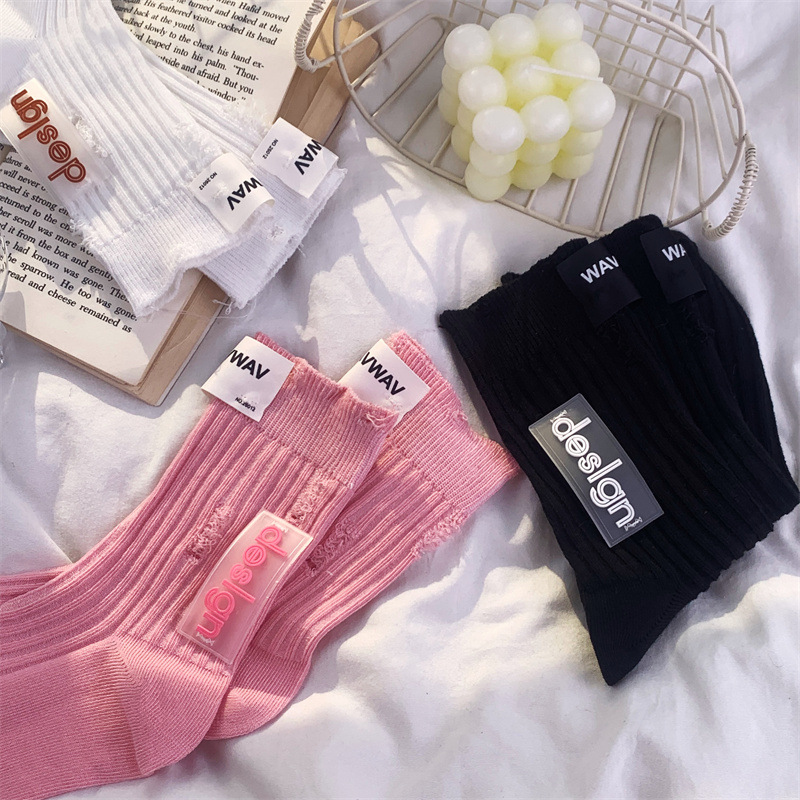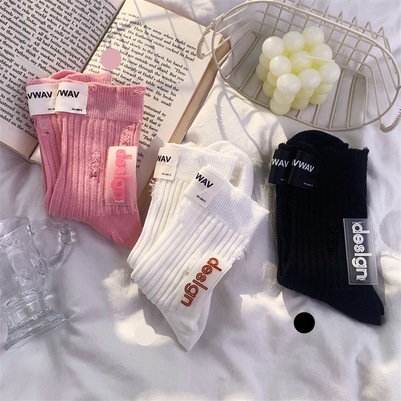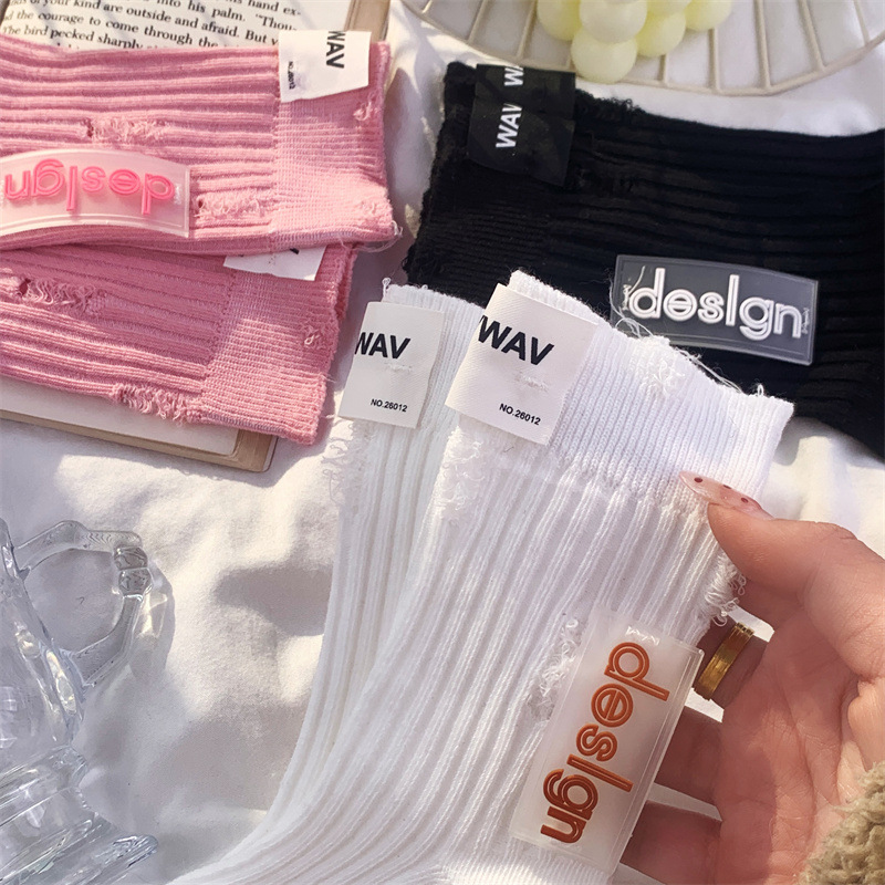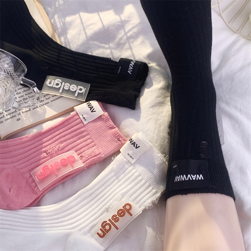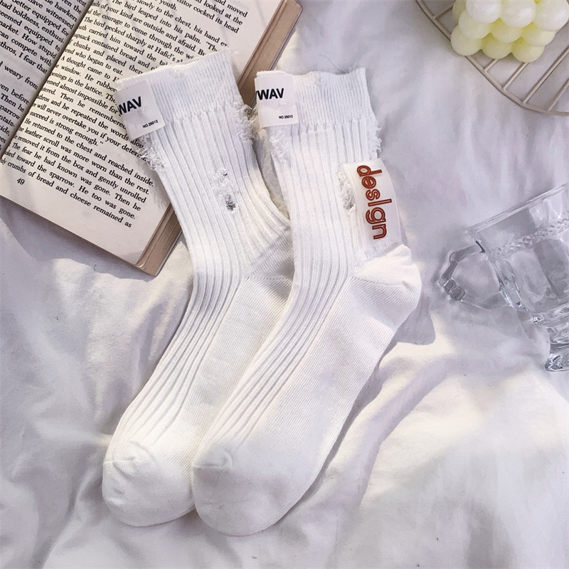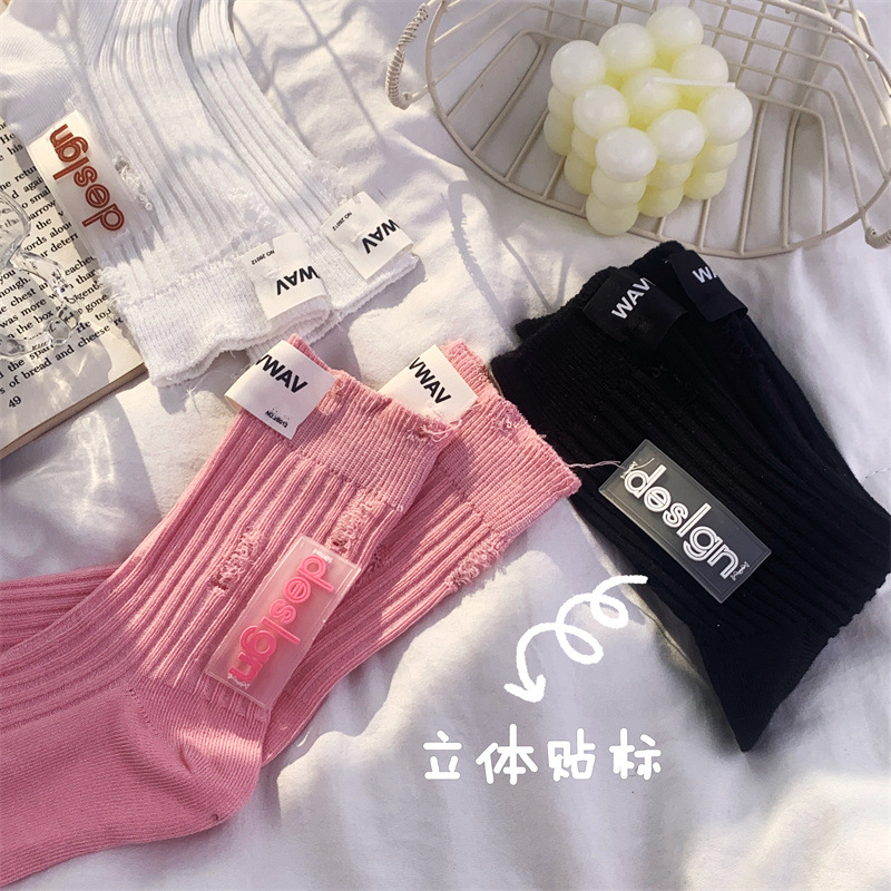 이른 봄 찢어진 거지 통기성 양말 여성 천 라벨 글자 하이 엔드 핫 스탬핑 3 차원 큰 글자 인터넷 유명 인사 더미 양말스토어 가기