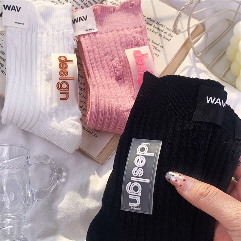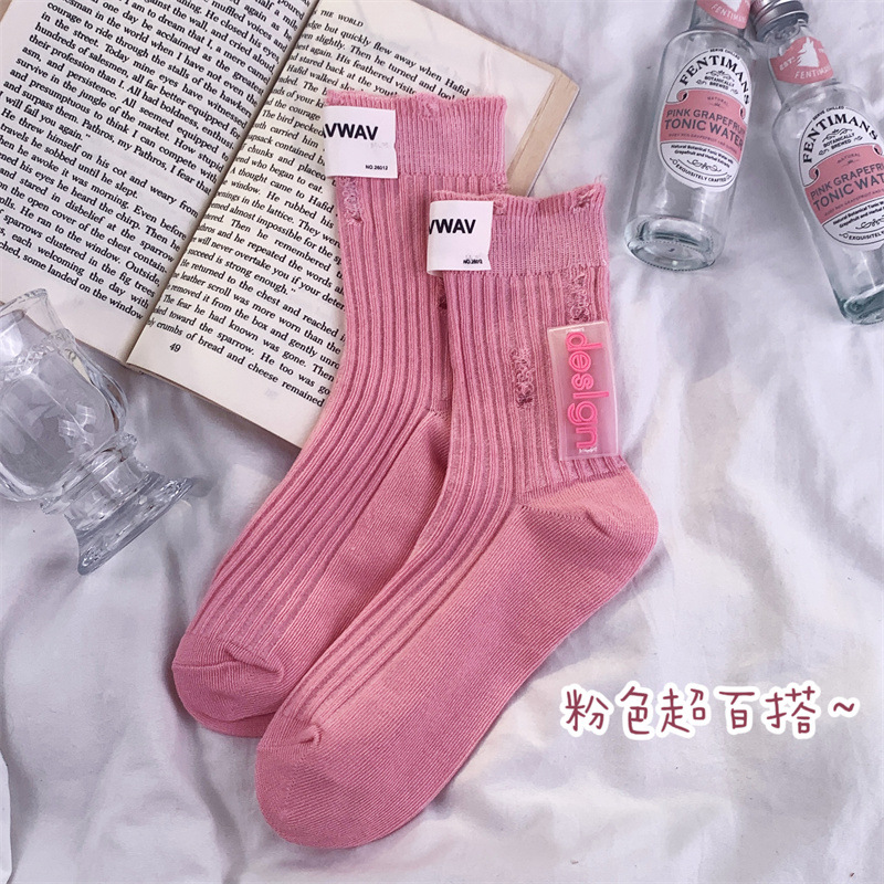 이른 봄 찢어진 거지 통기성 양말 여성 천 라벨 글자 하이 엔드 핫 스탬핑 3 차원 큰 글자 인터넷 유명 인사 더미 양말