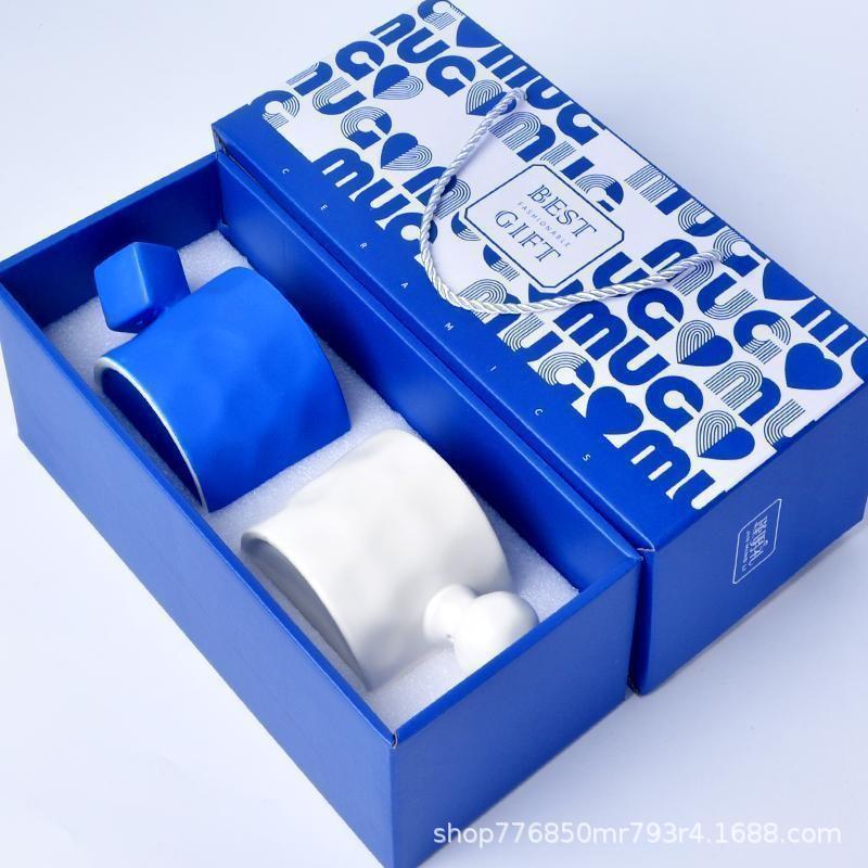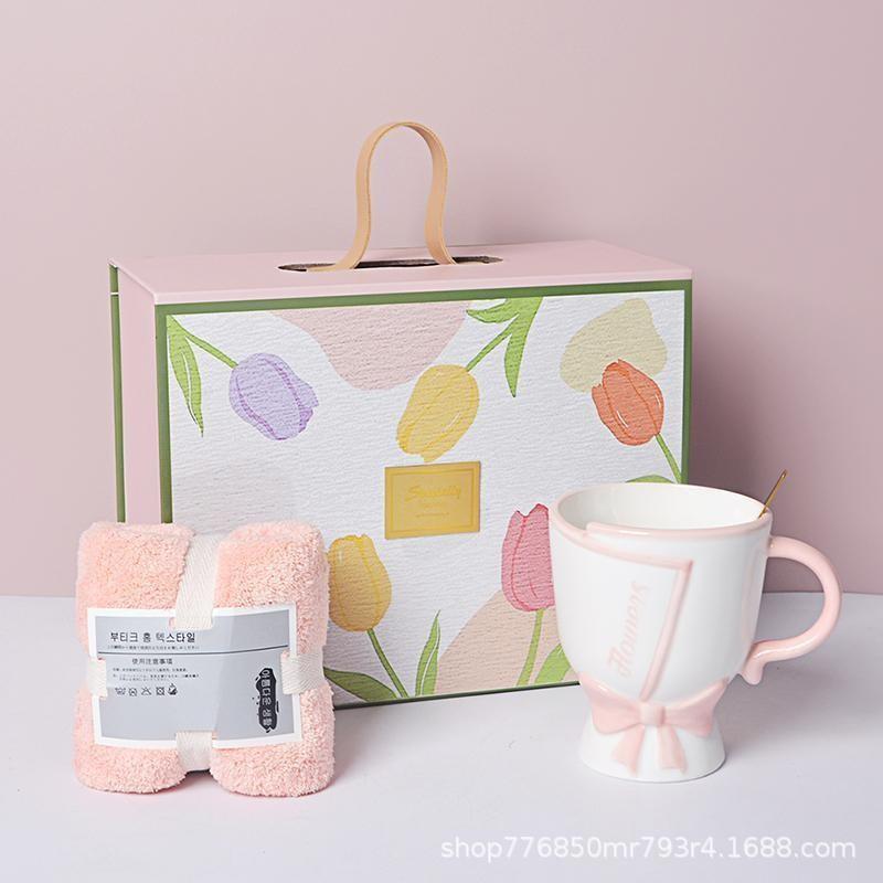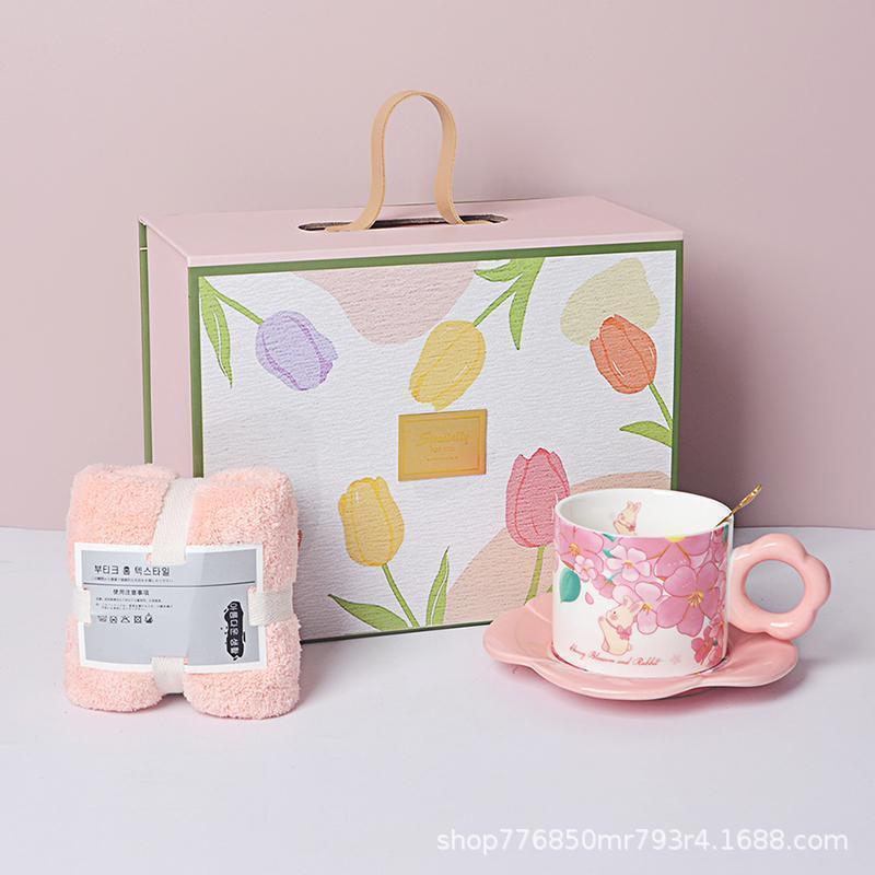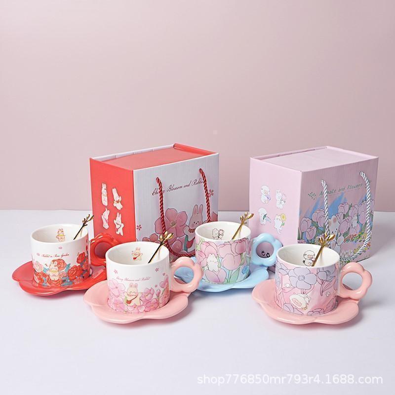 일본 목가적 스타일의 꽃 손잡이 세라믹 컵 귀여운 작은 동물 머그잔 꽃 커피 컵과 접시 선물 상자 세트