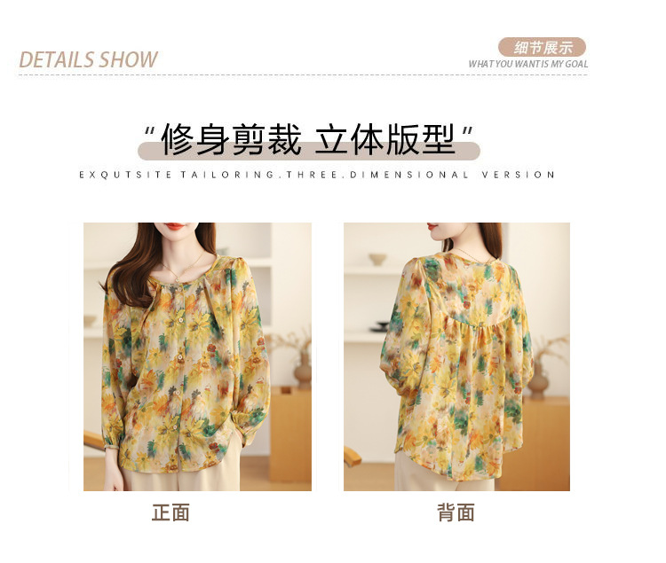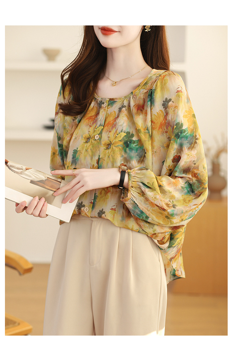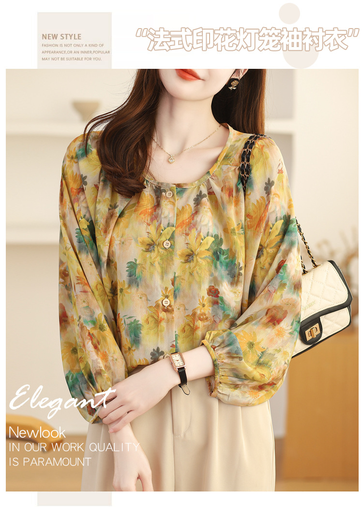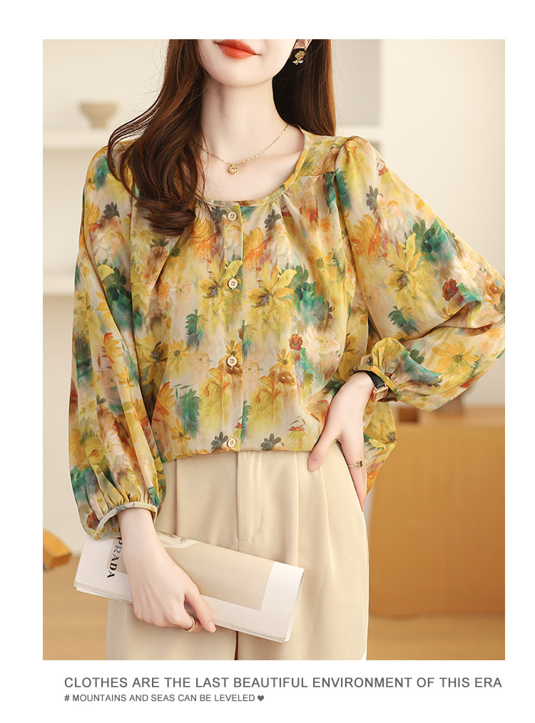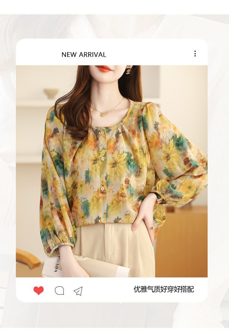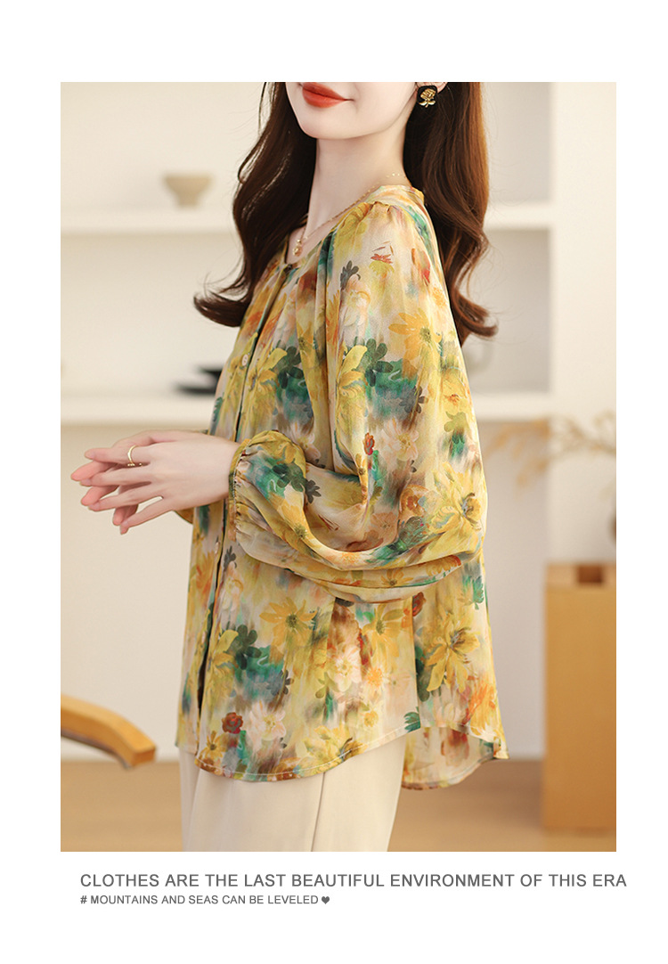 여름 새로운 하이 엔드 서양식 라운드 넥 느슨한 플러스 사이즈 실크 셔츠 2024 여성을위한 실제 샷 인쇄 쉬폰 탑스토어 가기