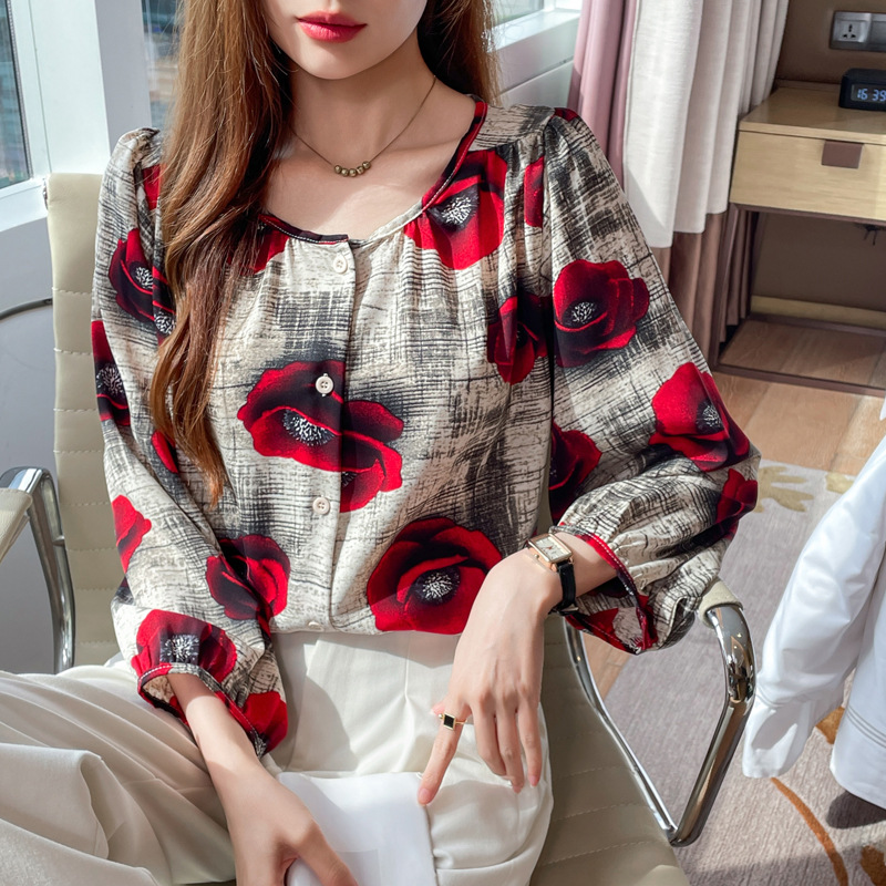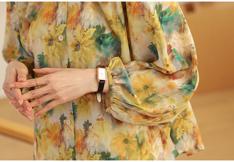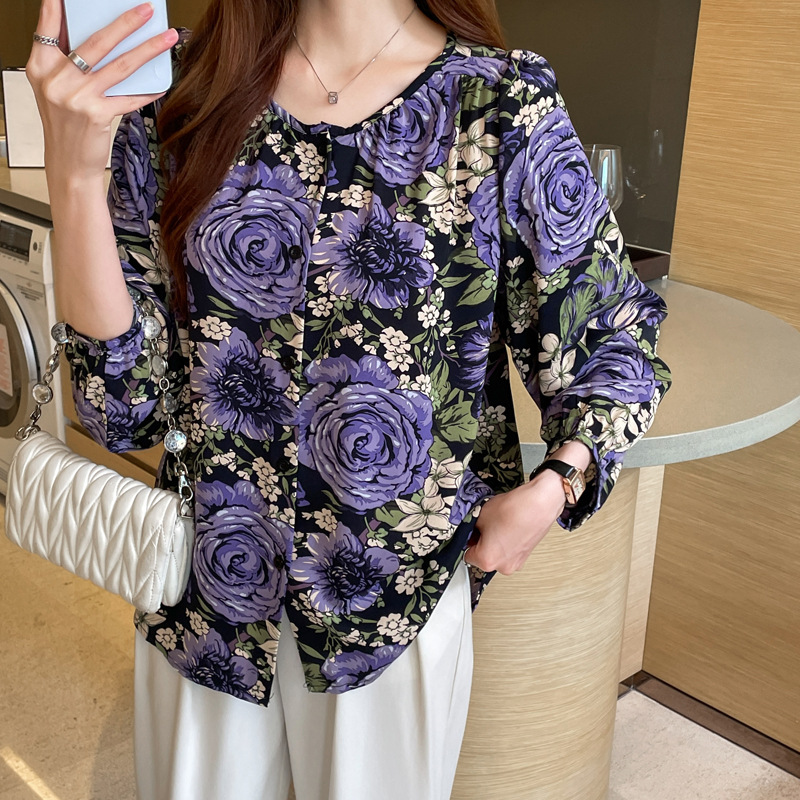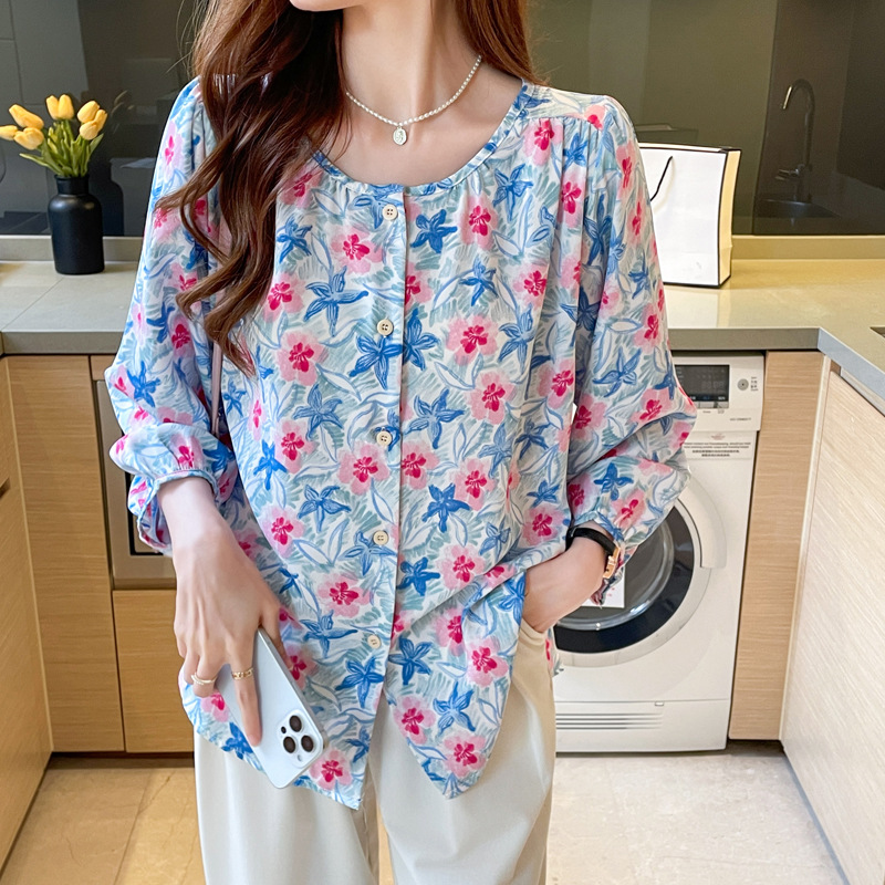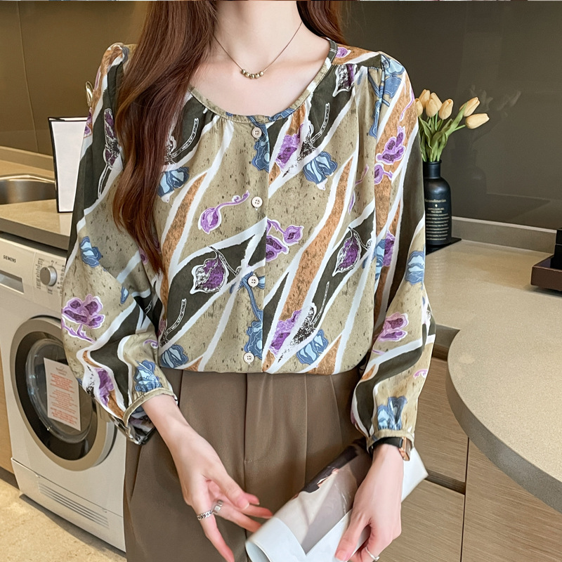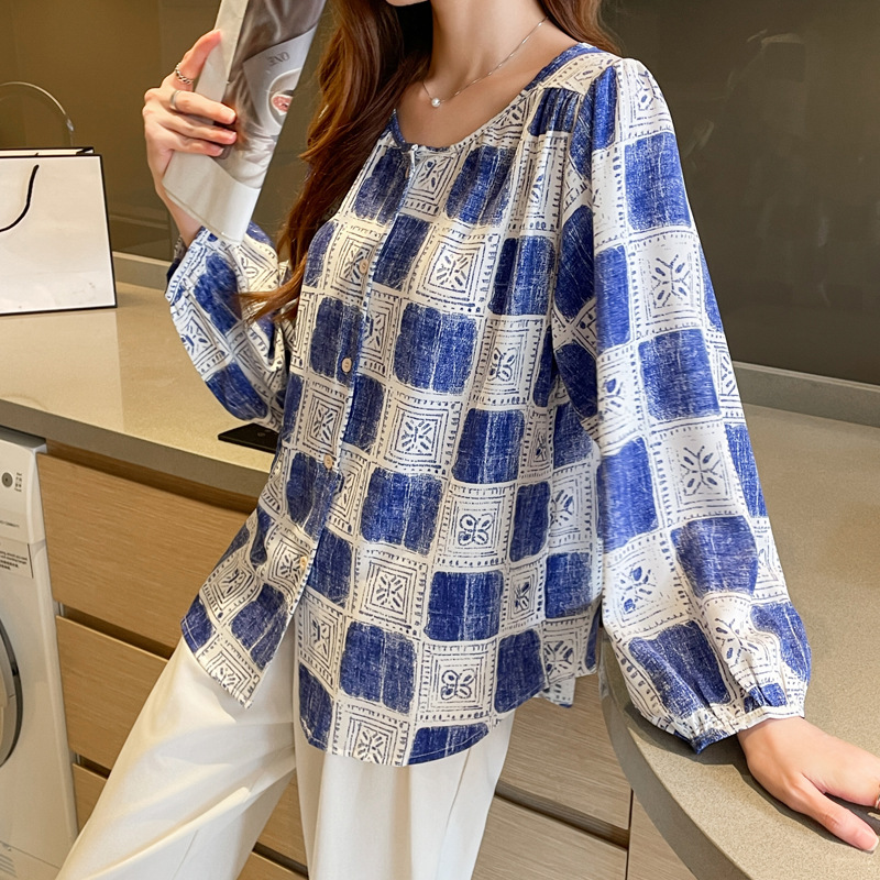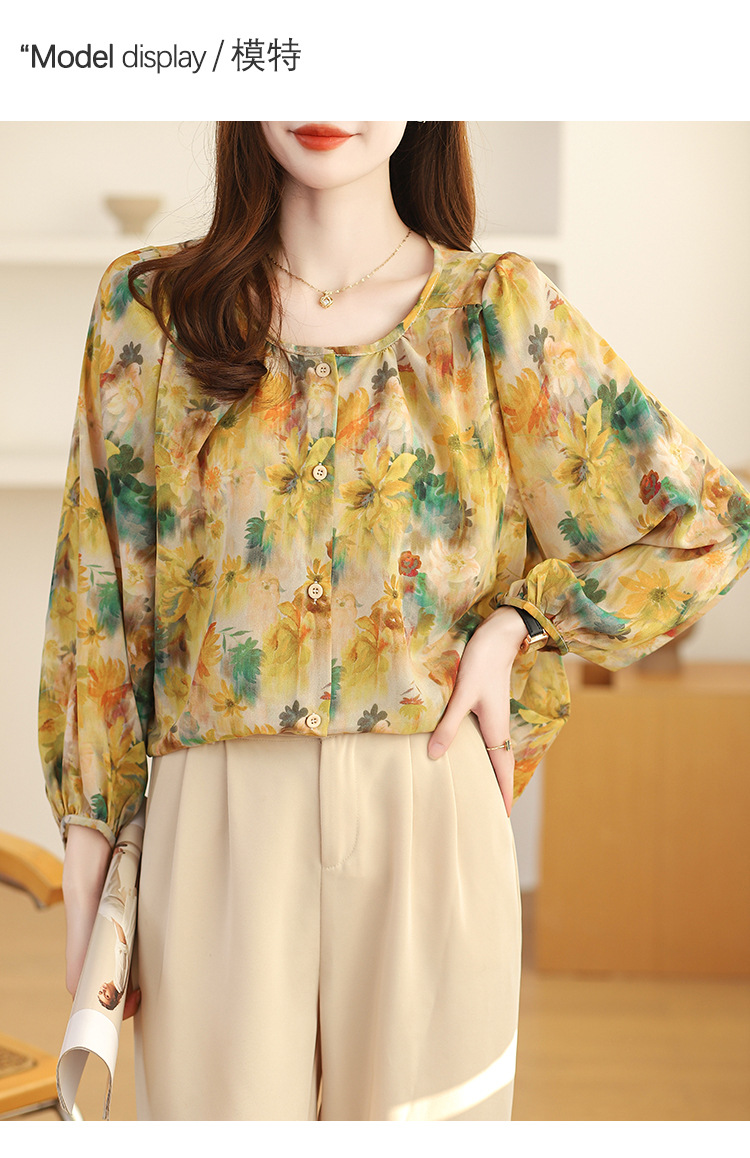 여름 새로운 하이 엔드 서양식 라운드 넥 느슨한 플러스 사이즈 실크 셔츠 2024 여성을위한 실제 샷 인쇄 쉬폰 탑스토어 가기