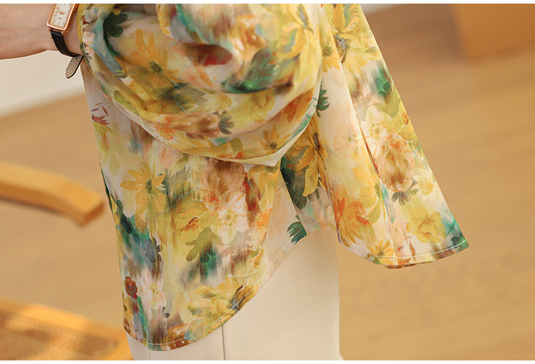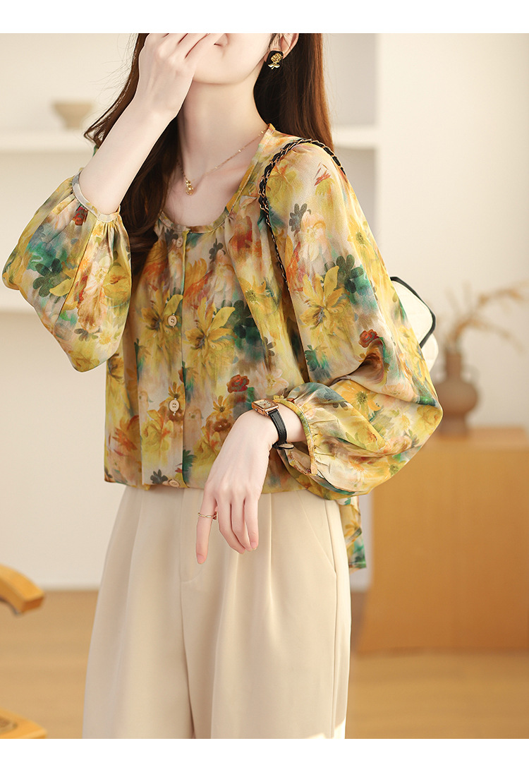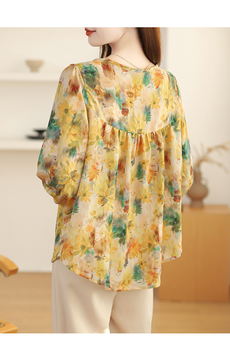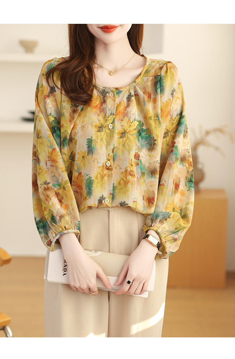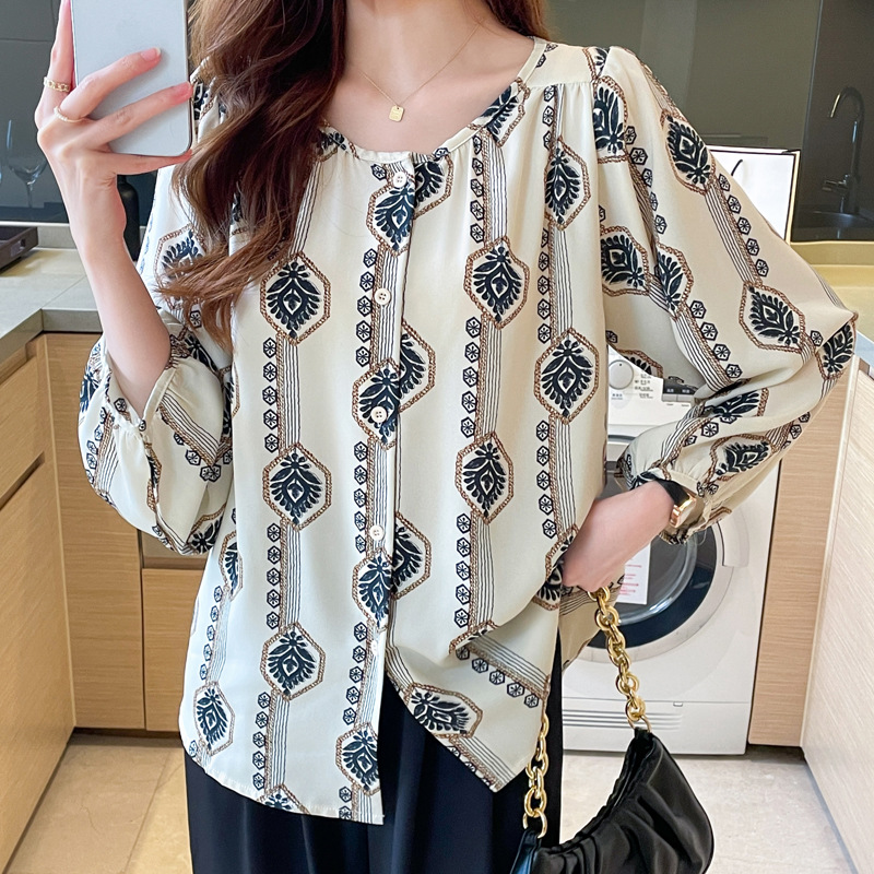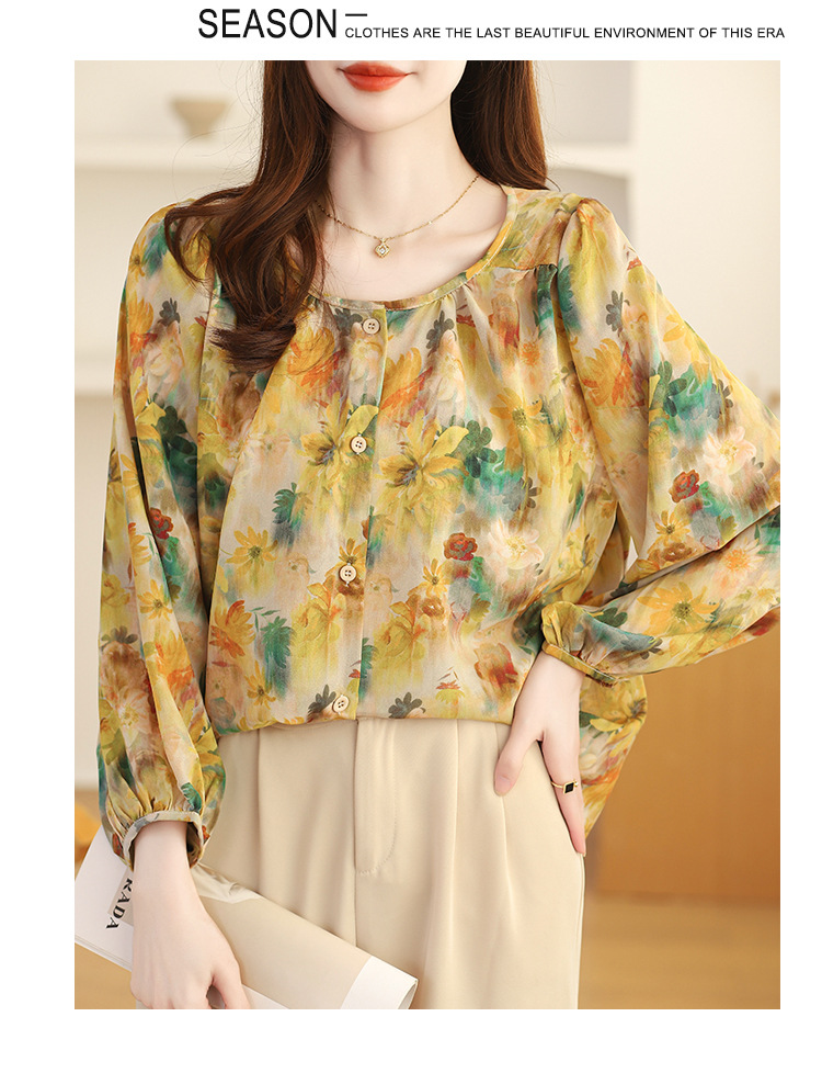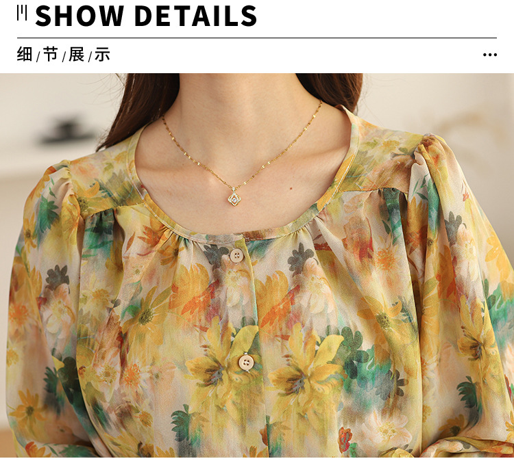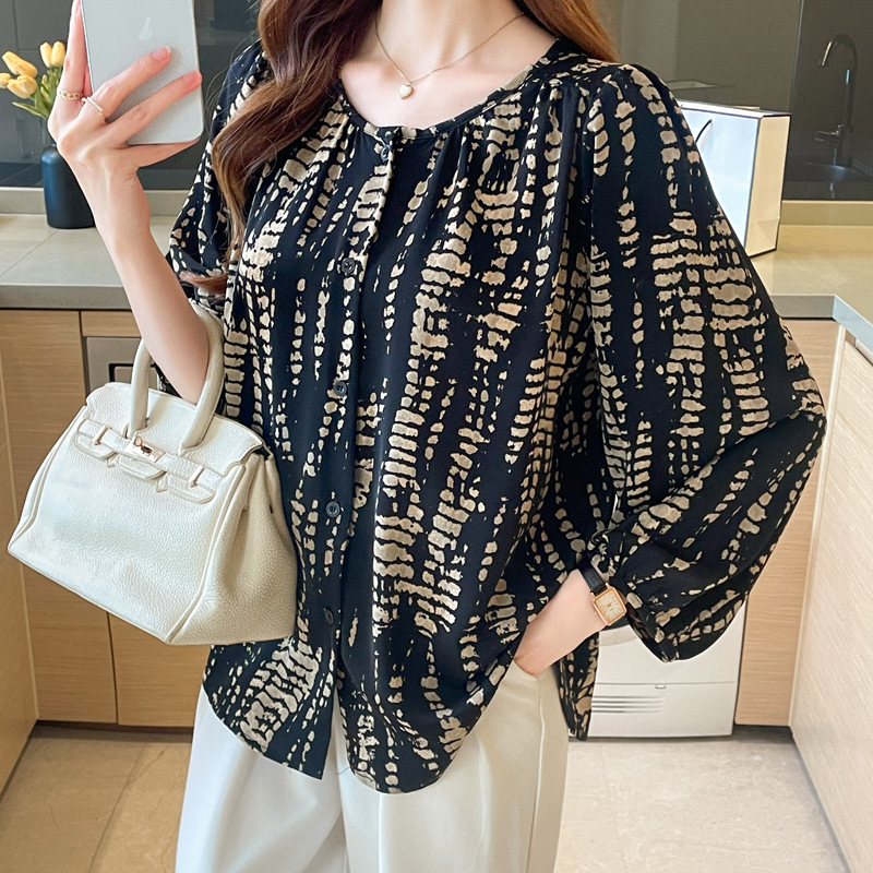 여름 새로운 하이 엔드 서양식 라운드 넥 느슨한 플러스 사이즈 실크 셔츠 2024 여성을위한 실제 샷 인쇄 쉬폰 탑