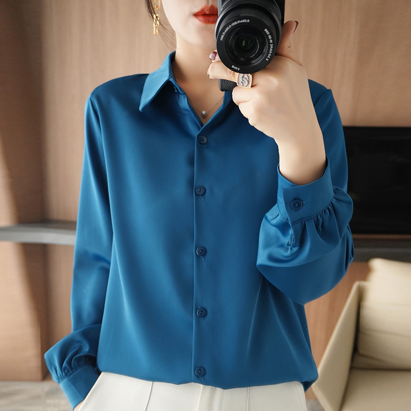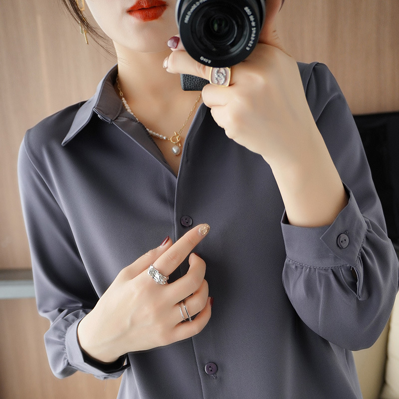 실크 실크 2024 봄 여성의 새로운 POLO 칼라 셔츠 단색 간단한 올 매치 기질 탑 짧은 카디건스토어 가기