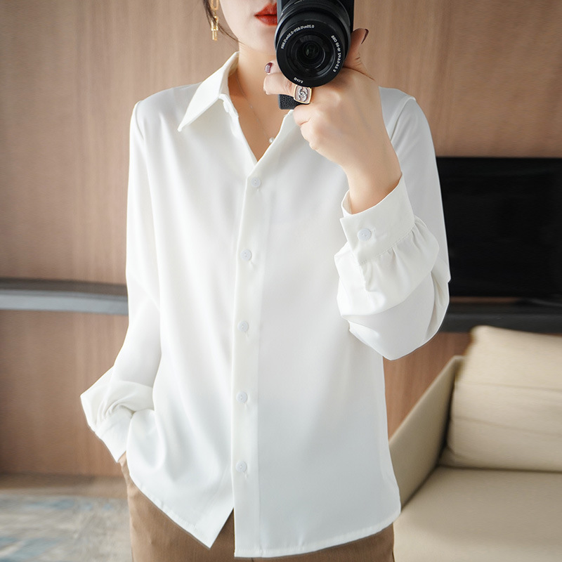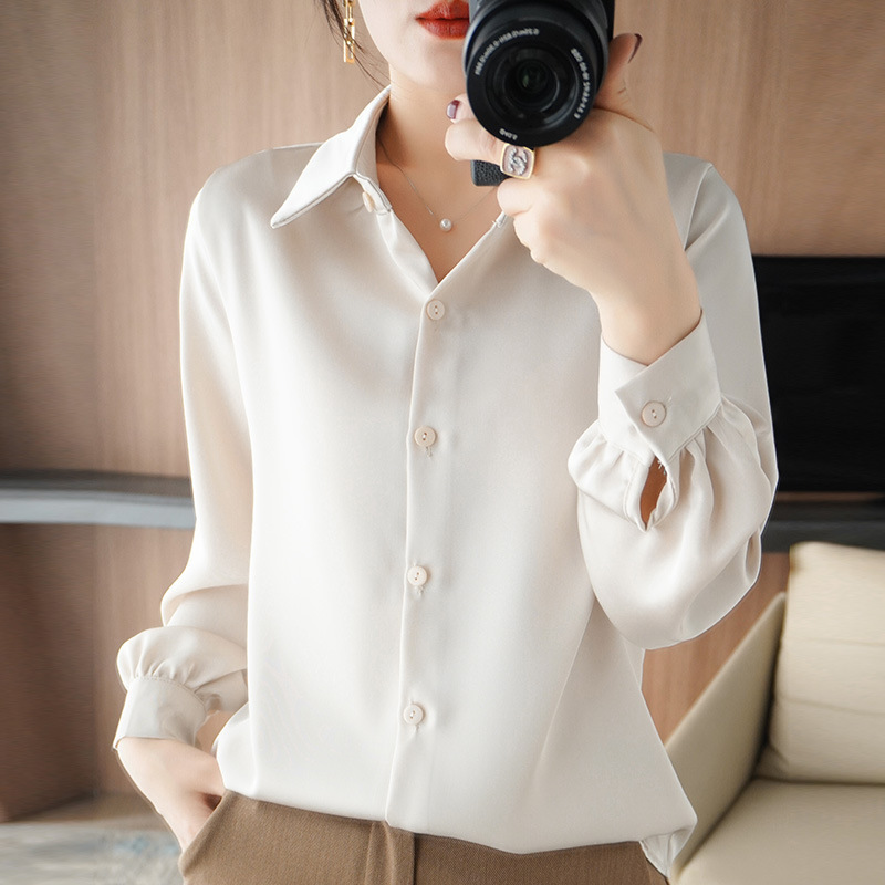 실크 실크 2024 봄 여성의 새로운 POLO 칼라 셔츠 단색 간단한 올 매치 기질 탑 짧은 카디건
