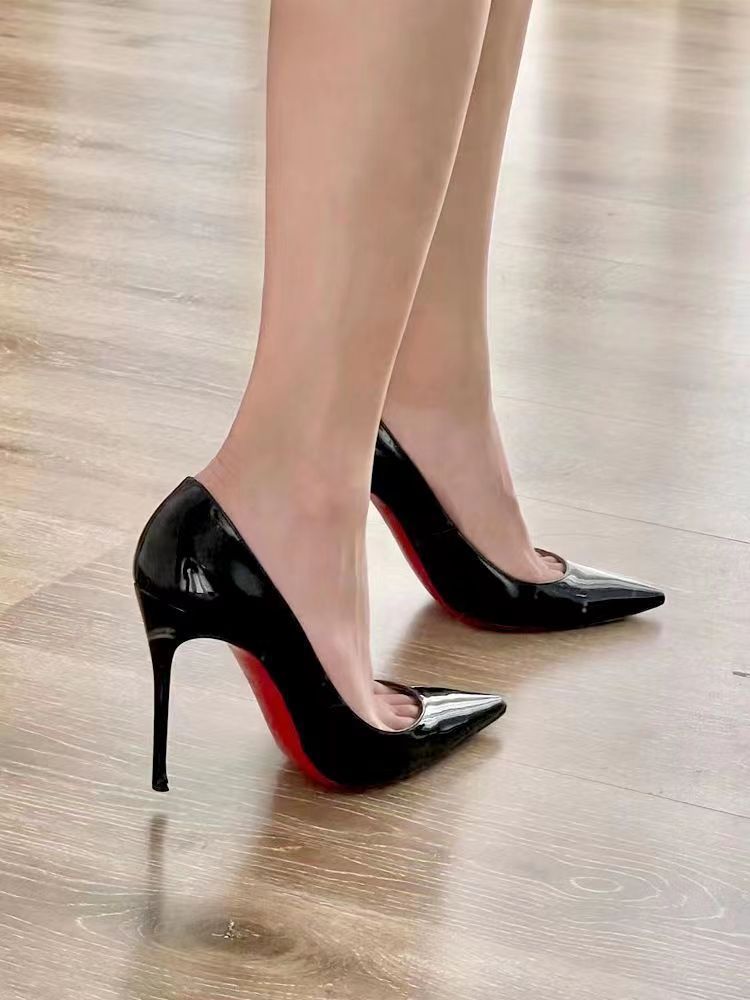 유럽과 미국의 블랙 하이힐 여성 레드 바닥 섹시한 싱글 레이어 신발 여성 2023 새로운 스틸레토 힐 피곤하지 않은 피트 싱글 레이어 신발스토어 가기