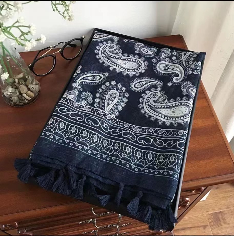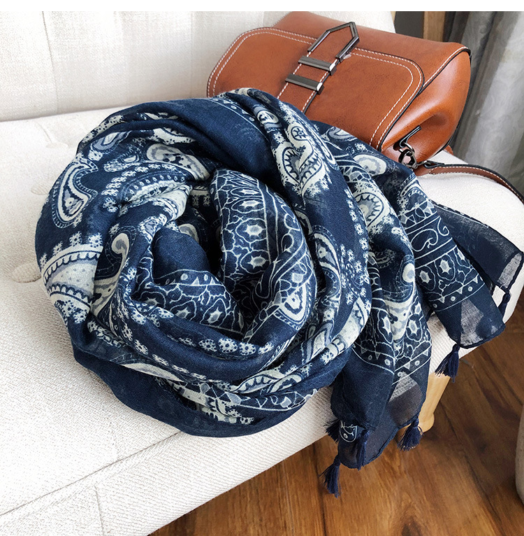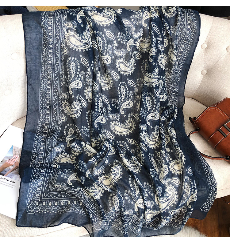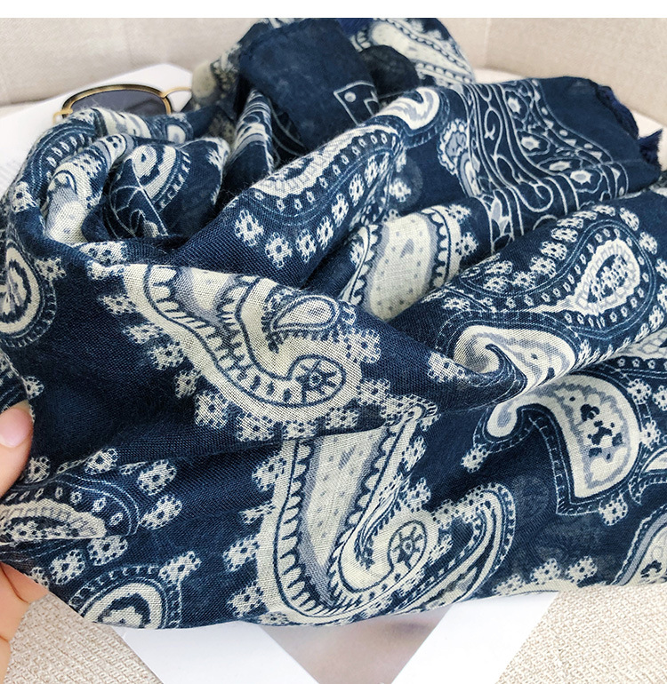 深蓝青花瓷腰果花棉麻围巾女长款春秋夏季薄款防晒披肩旅游纱巾