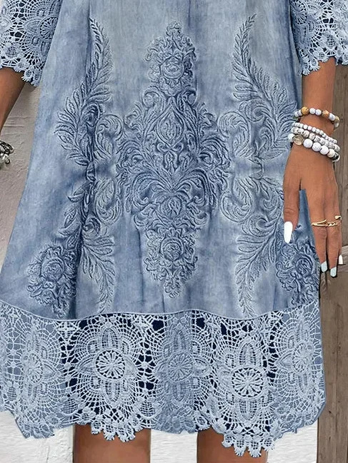 2024 유럽과 미국의 국경 아마존은 봄과 가을 V-목 여성의 새로운 원피스 긴 원피스 인쇄 레이스를 기원합니다