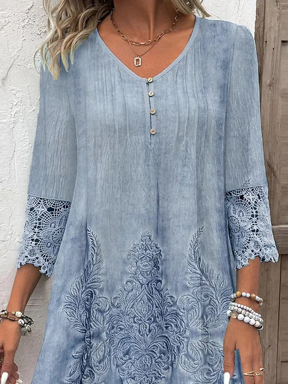 2024 유럽과 미국의 국경 아마존은 봄과 가을 V-목 여성의 새로운 원피스 긴 원피스 인쇄 레이스를 기원합니다스토어 가기