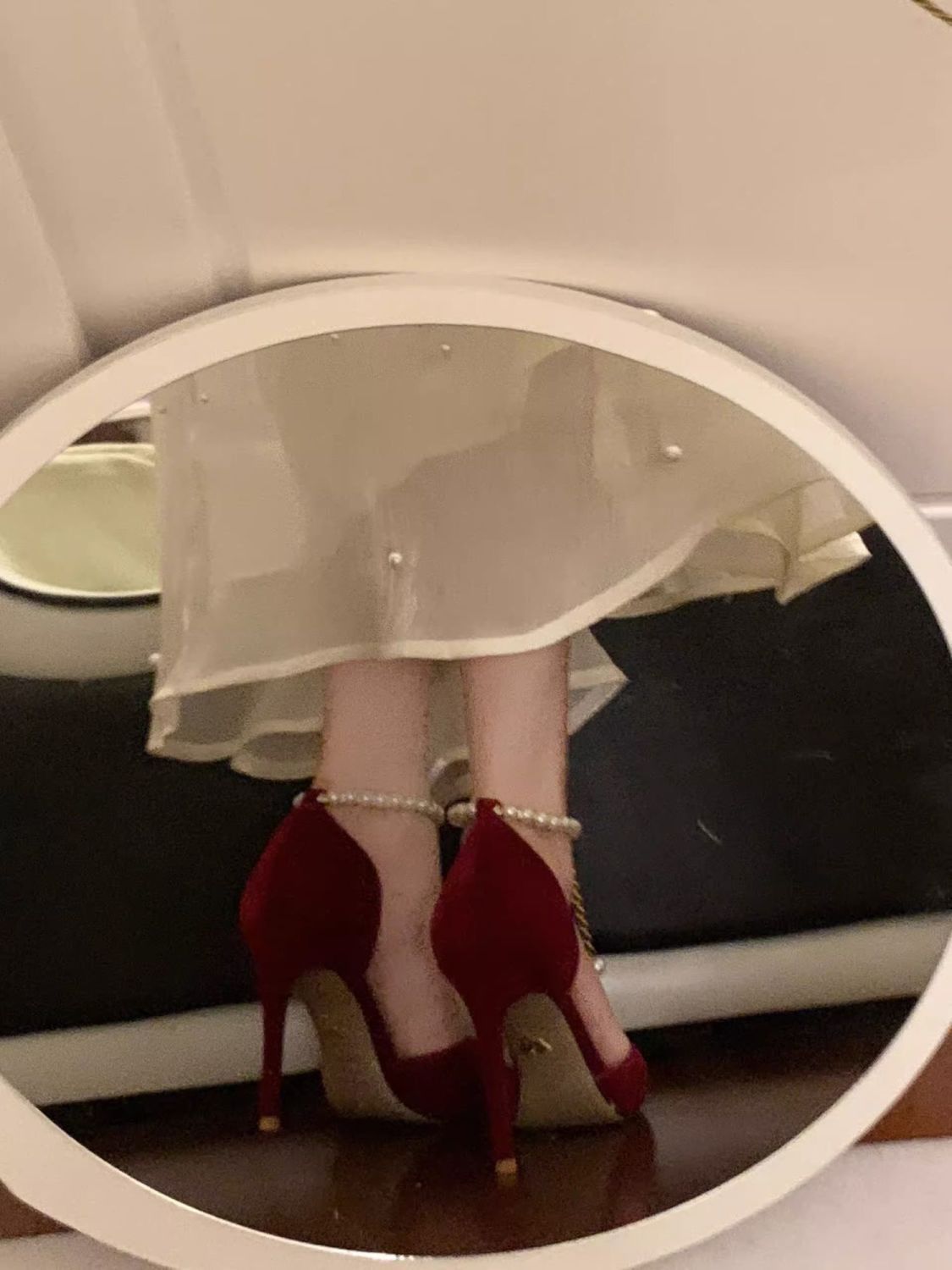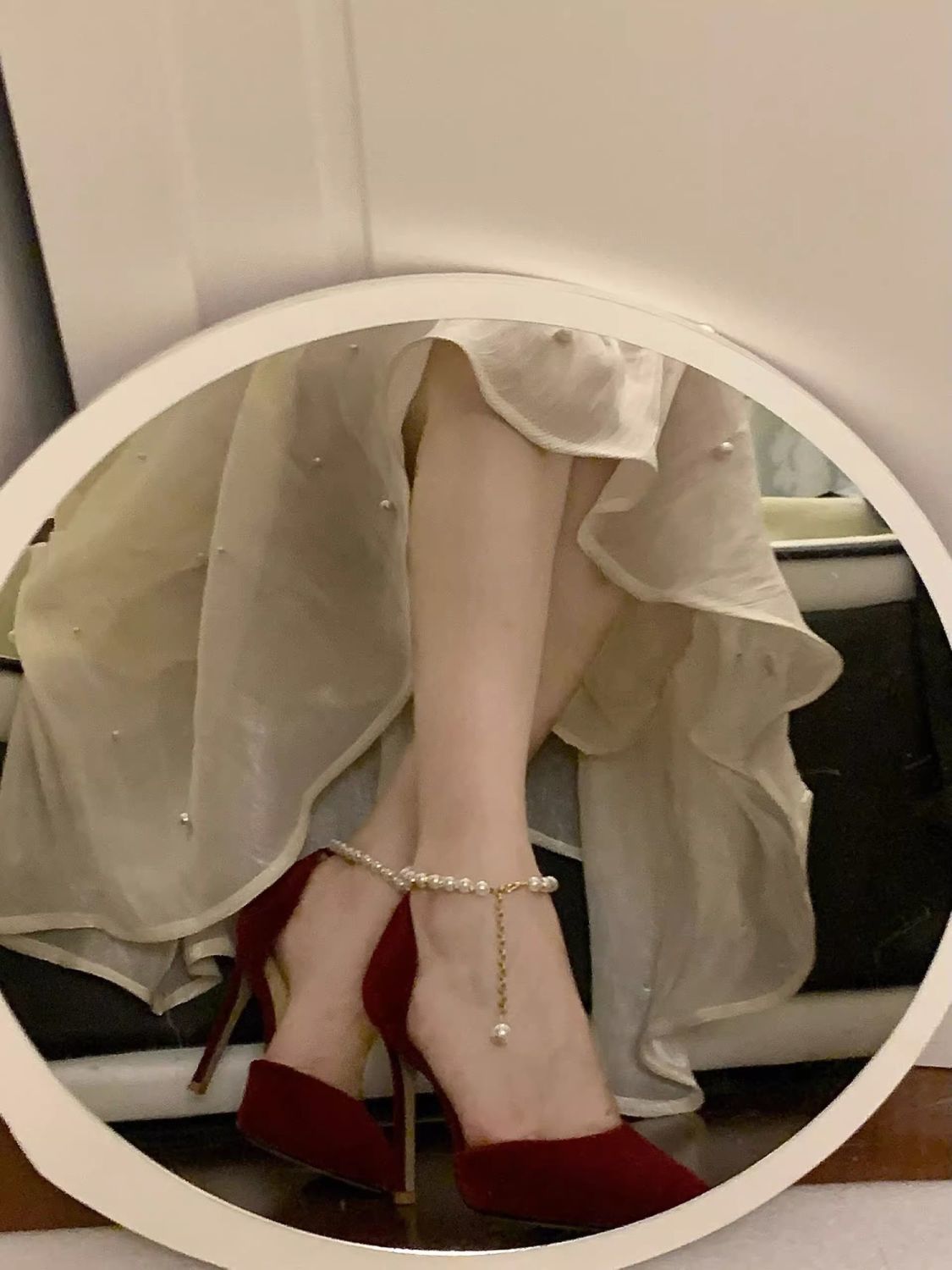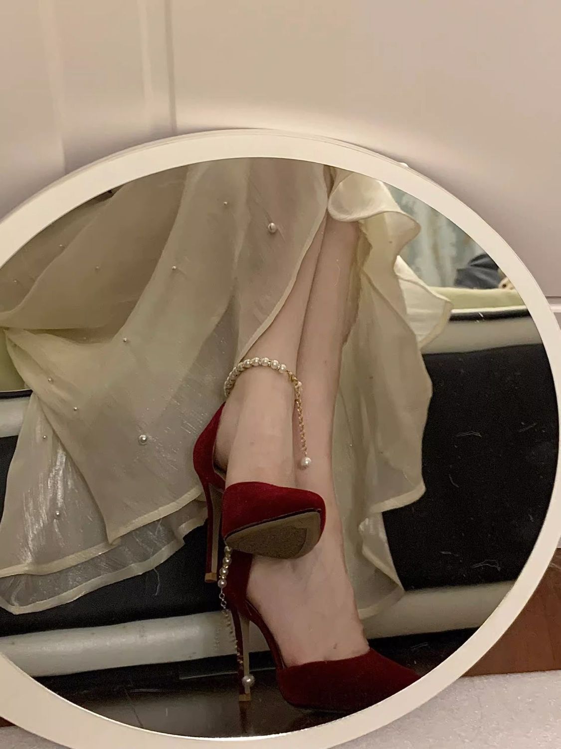프랑스 뾰족한 스웨이드 진주 하이힐 여성 스틸레토 힐 성인 의식 폐쇄 발가락 사이드 빈 샌들 Xiuhe 양방향 신부 신발스토어 가기