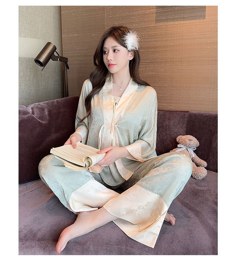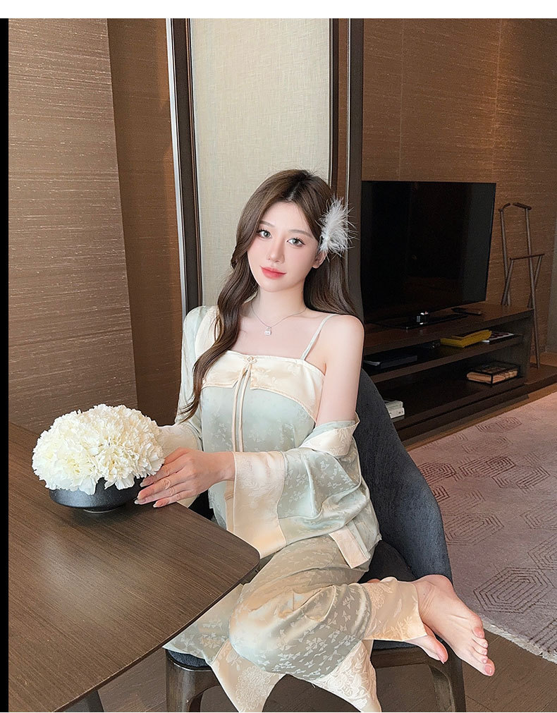 잠옷 여성의 여름 아이스 실크 얇은 중국 스타일 슬링 잠옷 3 피스 세트 봄 및 가을 고급 홈 웨어 가슴 패드