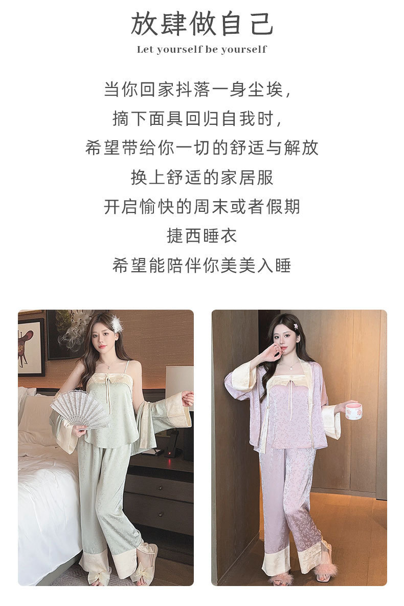 睡衣女夏季冰丝薄款国风吊带睡袍三件套装春秋高级感家居服带胸垫